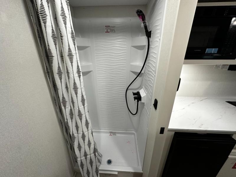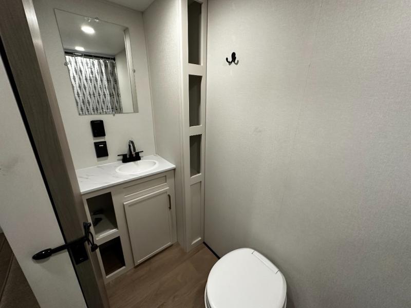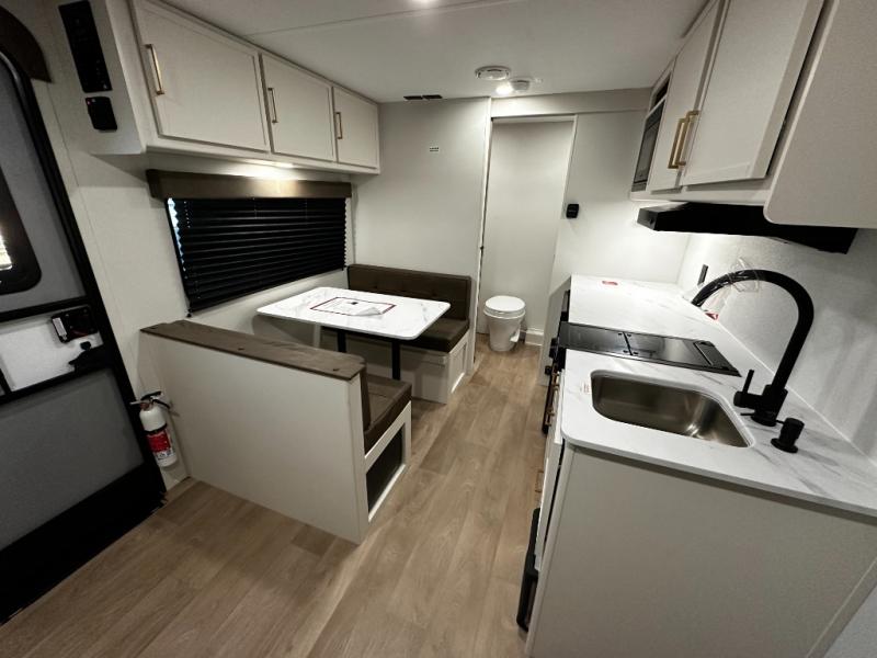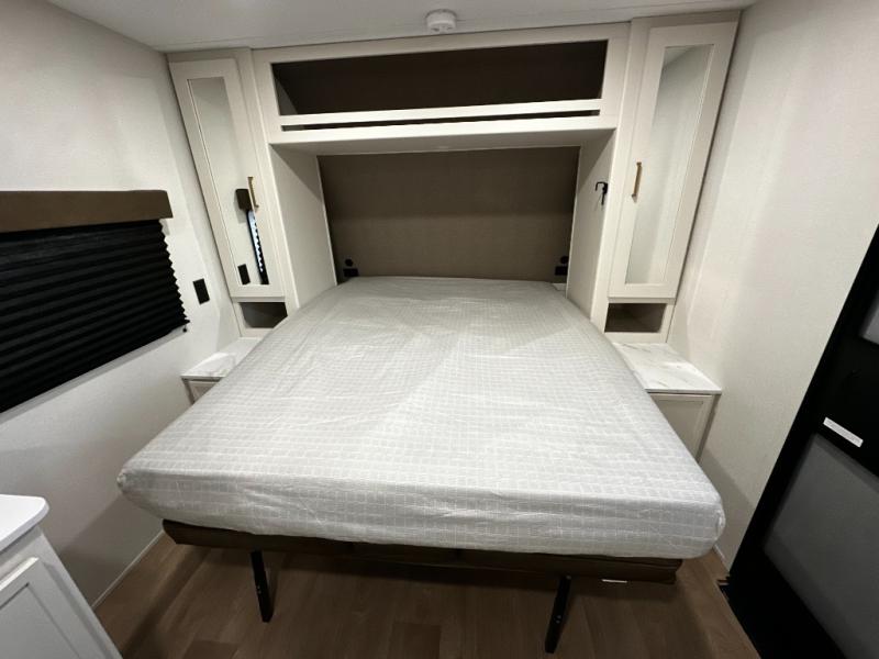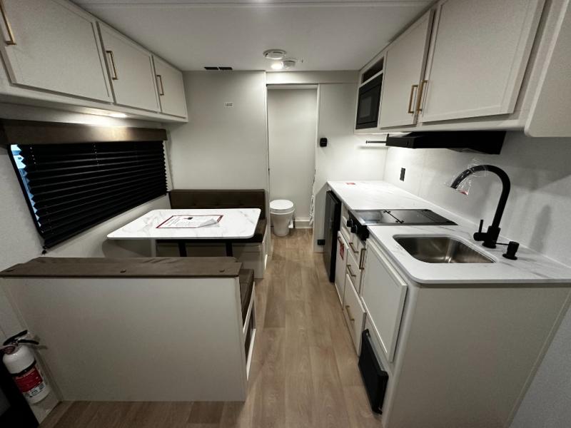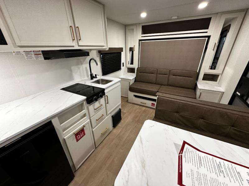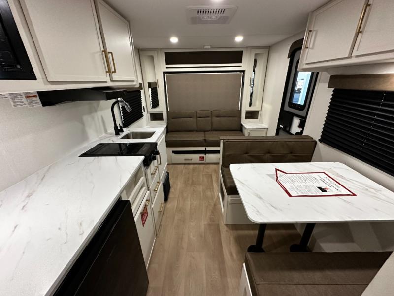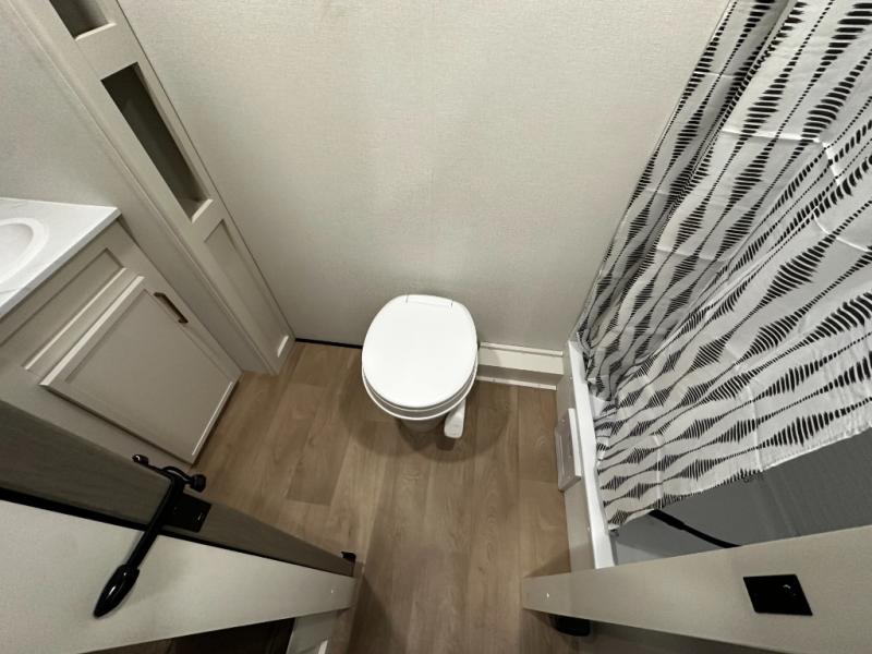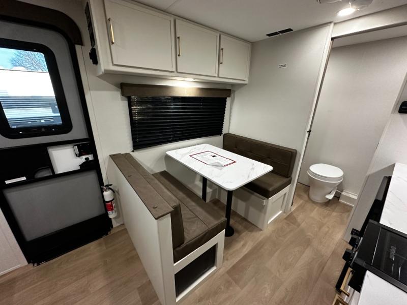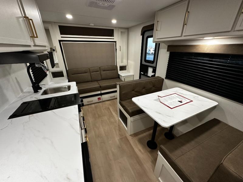 Step inside and you’ll discover a layout built for real-world travel. A queen Murphy bed in the front provides a comfortable place to sleep while maximizing living space during the day, and a booth dinette offers a cozy area for meals, games, or relaxing after a day outside. The full rear bathroom features a roomy shower and practical layout that brings residential convenience to your adventures.