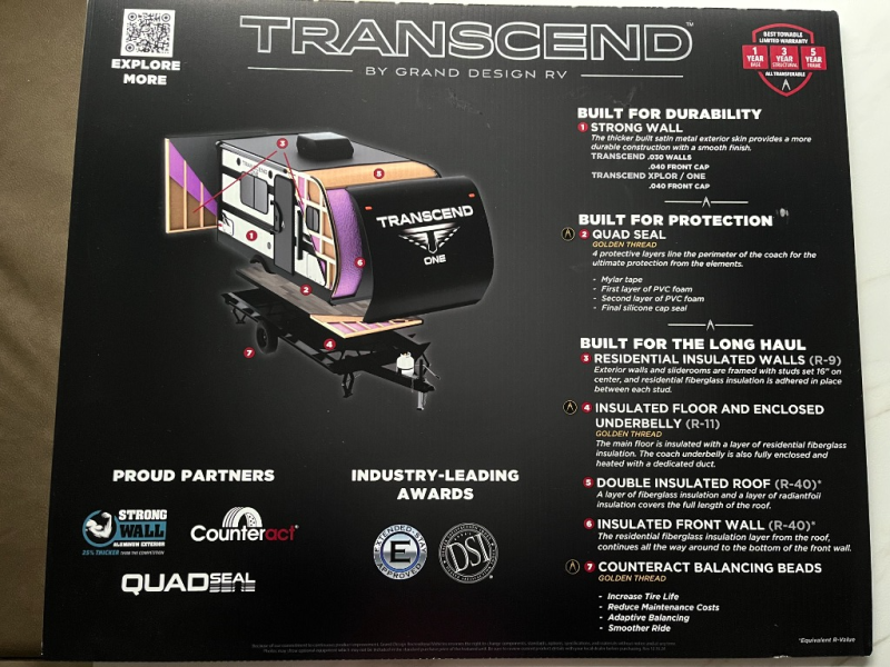 With any Transcend One travel trailer by Grand Design, you will enjoy lightweight towing thanks to their single-axle. There are many interior comforts to make camping easier than ever, such as recessed lighting, residential countertops, and a 6' 6" interior height. Each model is constructed with a heated and enclosed underbelly with suspended tanks, a moisture barrier floor enclosure, and Thermofoil over the roof and front cap for added protection. And a JBL sound system will let you listen to tunes as you visit under the power awning with a Fusion light!