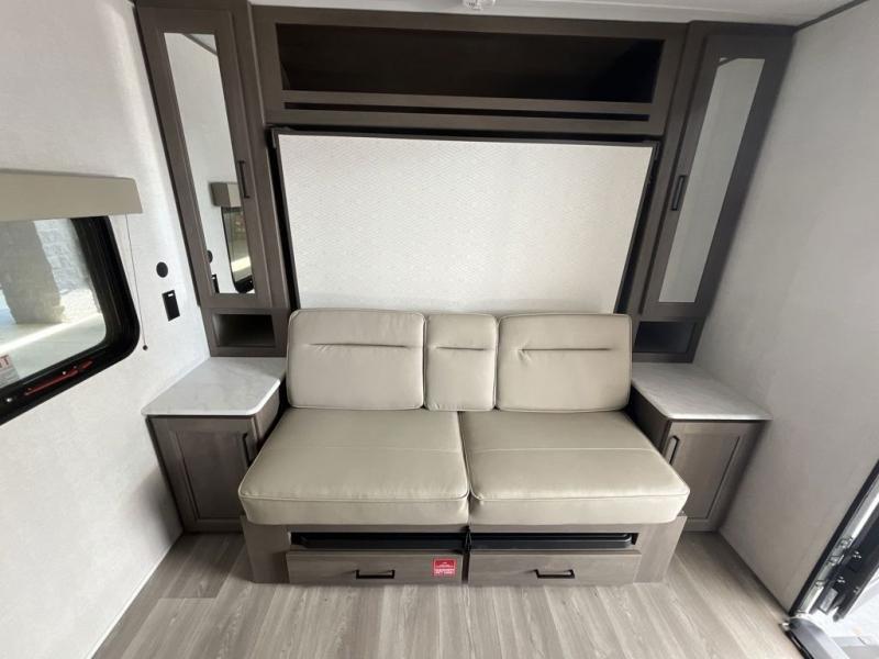 This is the perfect couple's trailer with versatile seating and sleeping space! You'll find a queen-size Murphy bed up front with storage space beside and above plus a full rear bath for added privacy. Once you've made lunch in the full kitchen, you can dine at the booth dinette or take your plate outdoors to sit under the 10' power awning. You'll also find pass-thru storage outside that will be perfect for fishing poles, lawn chairs, tools and more!