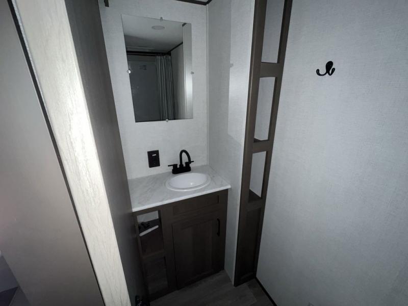 This is the perfect couple's trailer with versatile seating and sleeping space! You'll find a queen-size Murphy bed up front with storage space beside and above plus a full rear bath for added privacy. Once you've made lunch in the full kitchen, you can dine at the booth dinette or take your plate outdoors to sit under the 10' power awning. You'll also find pass-thru storage outside that will be perfect for fishing poles, lawn chairs, tools and more!