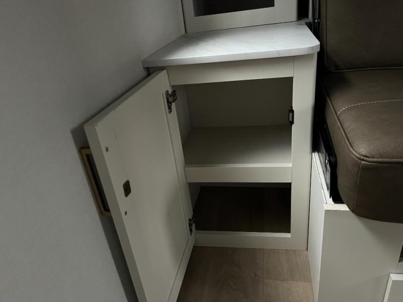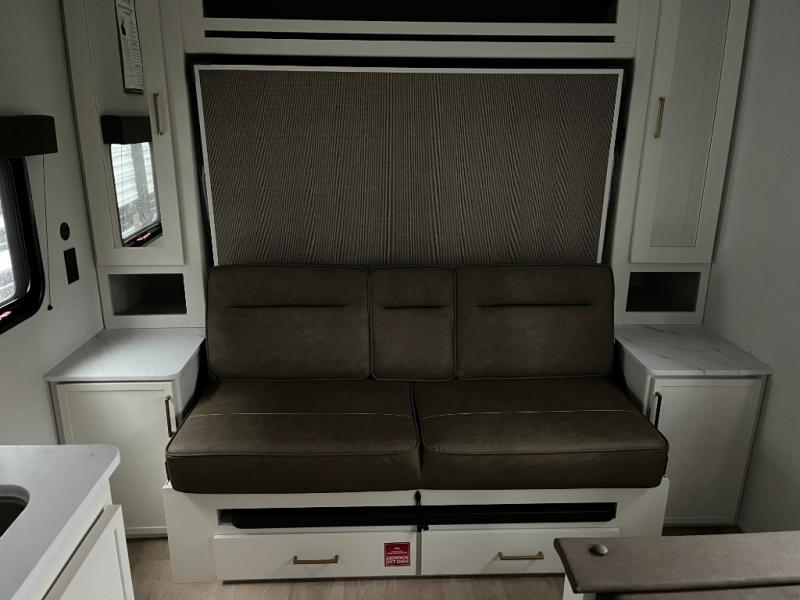 This is the perfect couple's trailer with versatile seating and sleeping space! You'll find a queen-size Murphy bed up front with storage space beside and above plus a full rear bath for added privacy. Once you've made lunch in the full kitchen, you can dine at the booth dinette or take your plate outdoors to sit under the 10' power awning. You'll also find pass-thru storage outside that will be perfect for fishing poles, lawn chairs, tools and more!