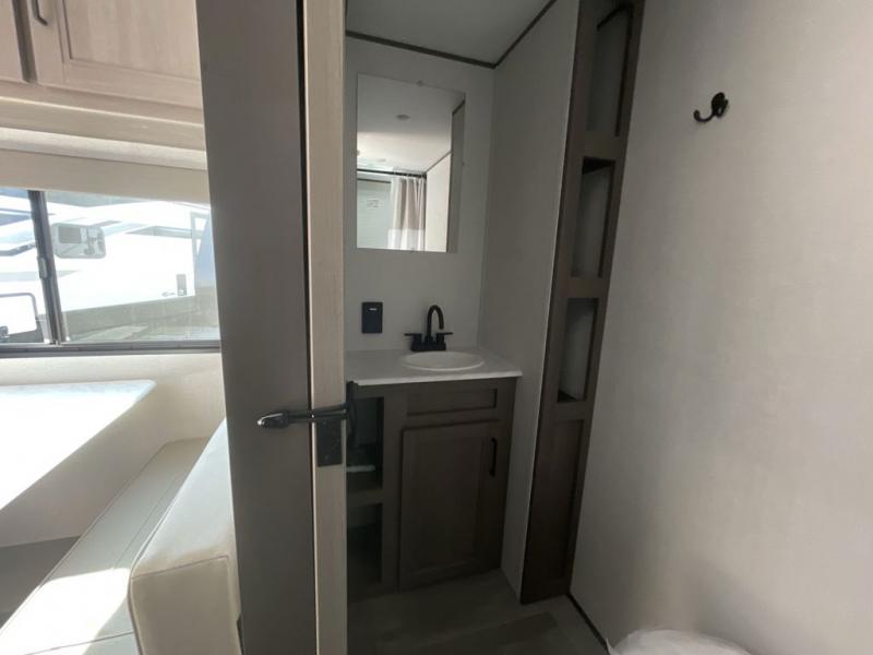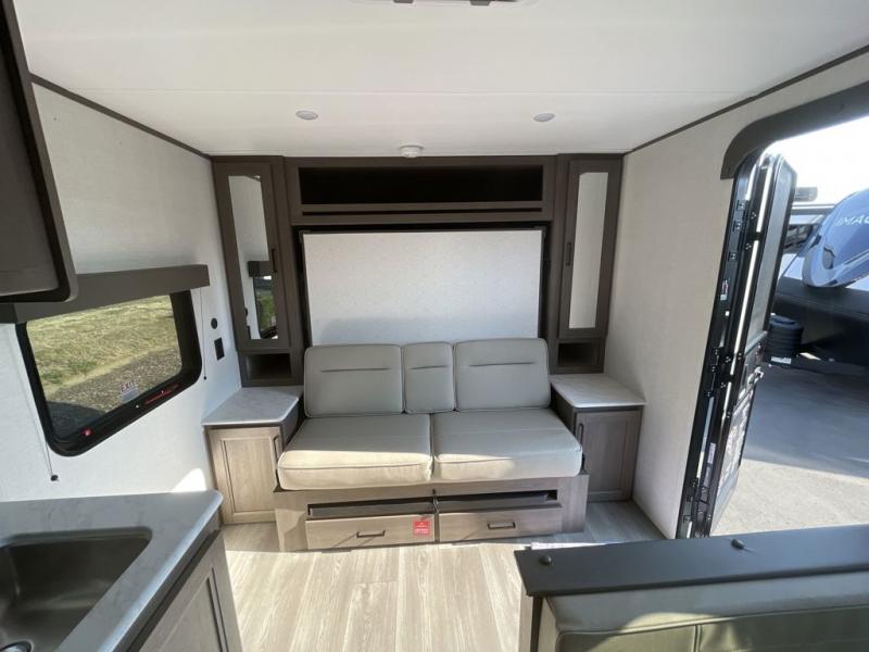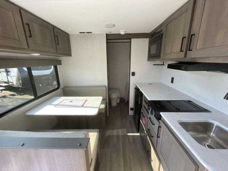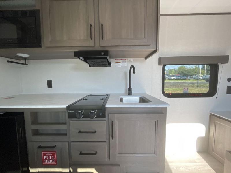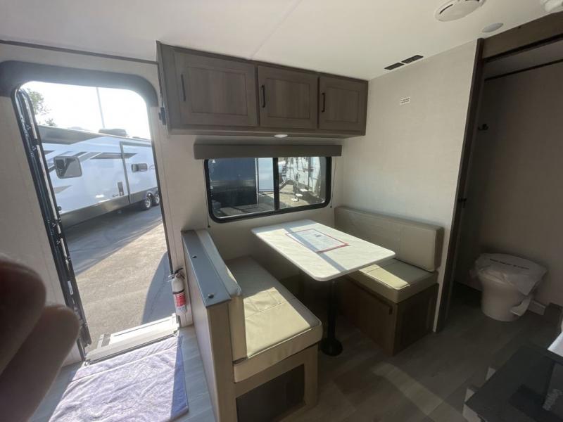 This is the perfect couple's trailer with versatile seating and sleeping space! You'll find a queen-size Murphy bed up front with storage space beside and above plus a full rear bath for added privacy. Once you've made lunch in the full kitchen, you can dine at the booth dinette or take your plate outdoors to sit under the 10' power awning. You'll also find pass-thru storage outside that will be perfect for fishing poles, lawn chairs, tools and more!