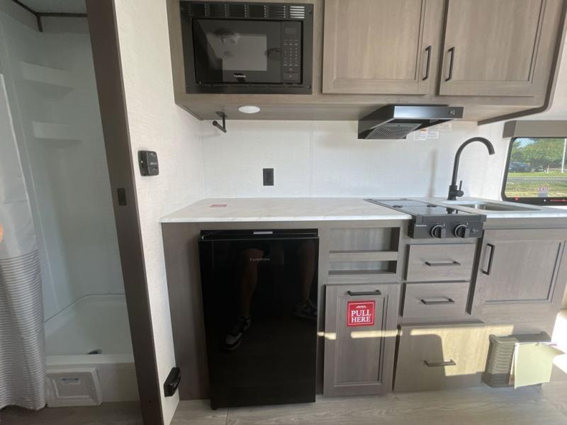 With any Transcend One travel trailer by Grand Design, you will enjoy lightweight towing thanks to their single-axle. There are many interior comforts to make camping easier than ever, such as recessed lighting, residential countertops, and a 6' 6" interior height. Each model is constructed with a heated and enclosed underbelly with suspended tanks, a moisture barrier floor enclosure, and Thermofoil over the roof and front cap for added protection. And a JBL sound system will let you listen to tunes as you visit under the power awning with a Fusion light!