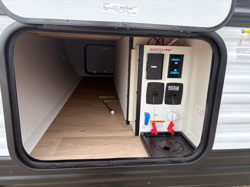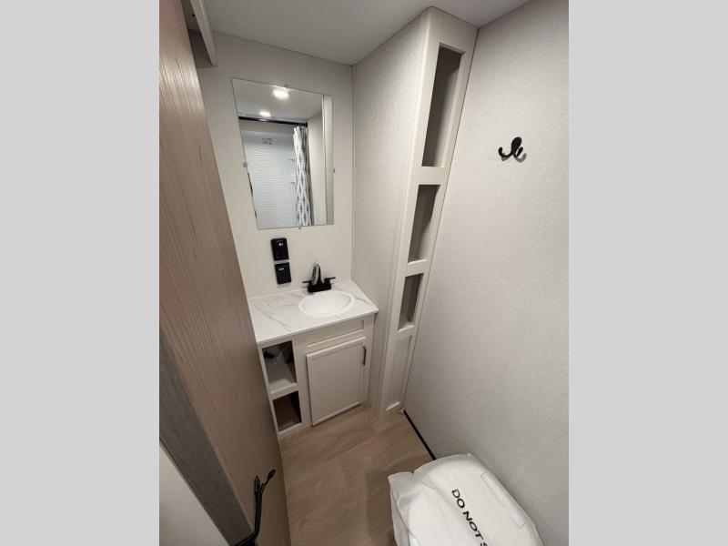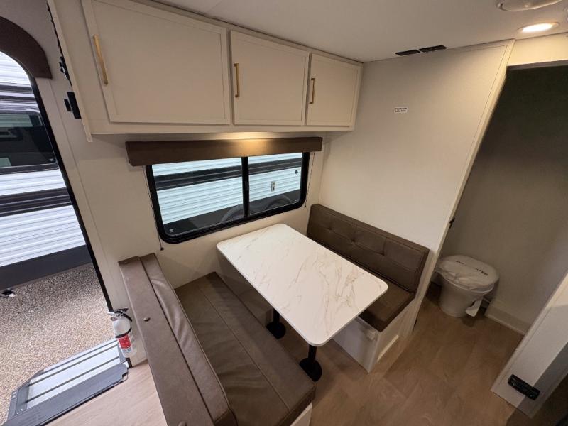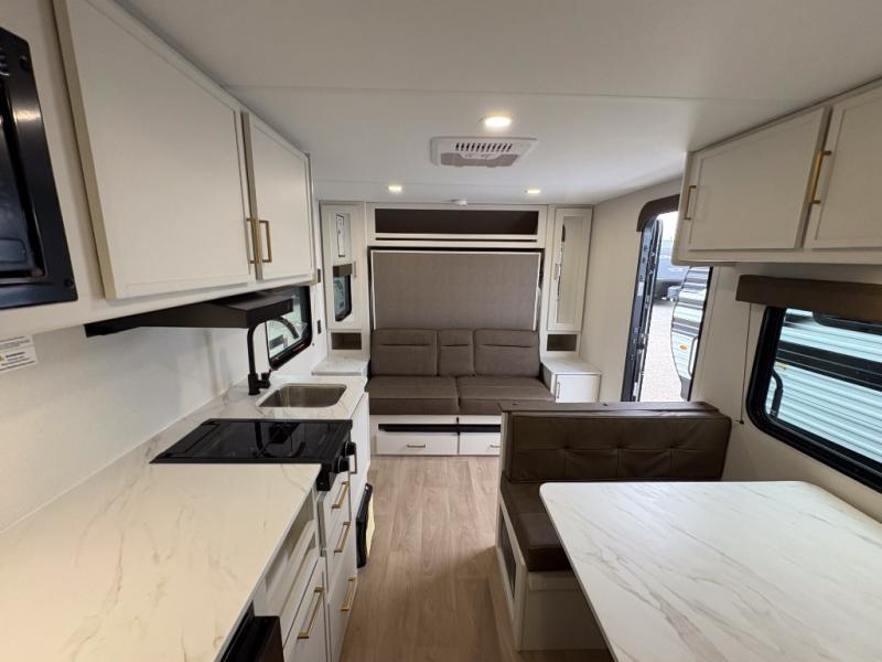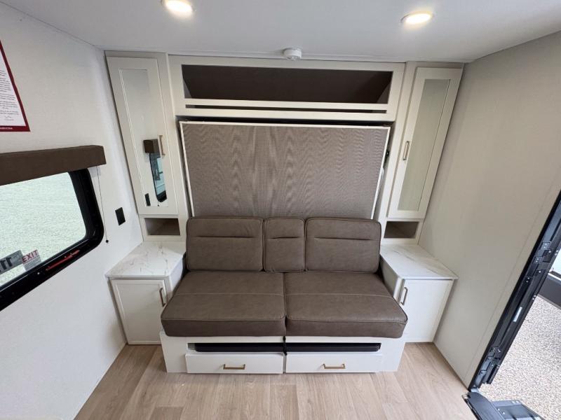 This is the perfect couple's trailer with versatile seating and sleeping space! You'll find a queen-size Murphy bed up front with storage space beside and above plus a full rear bath for added privacy. Once you've made lunch in the full kitchen, you can dine at the booth dinette or take your plate outdoors to sit under the 10' power awning. You'll also find pass-thru storage outside that will be perfect for fishing poles, lawn chairs, tools and more!