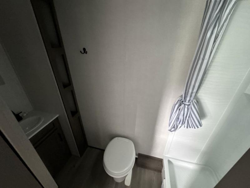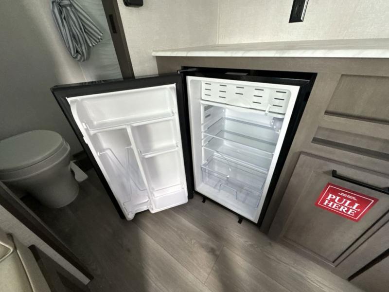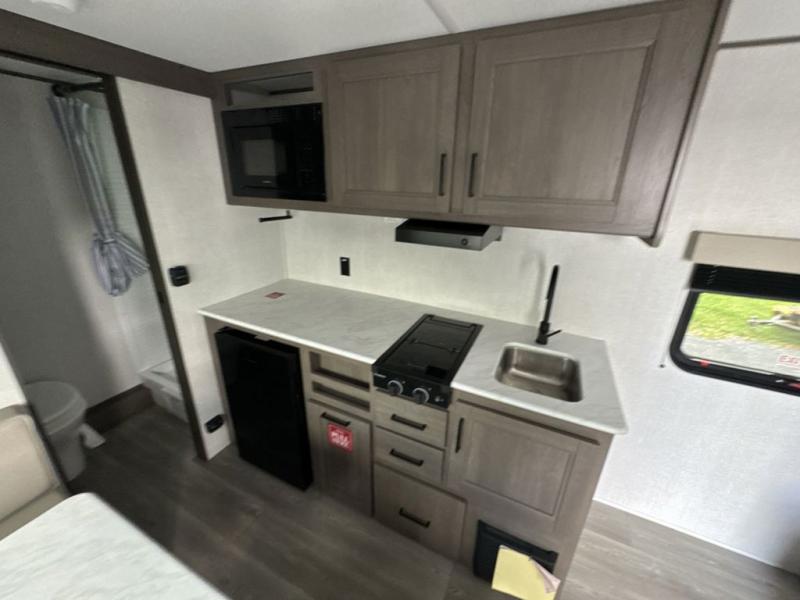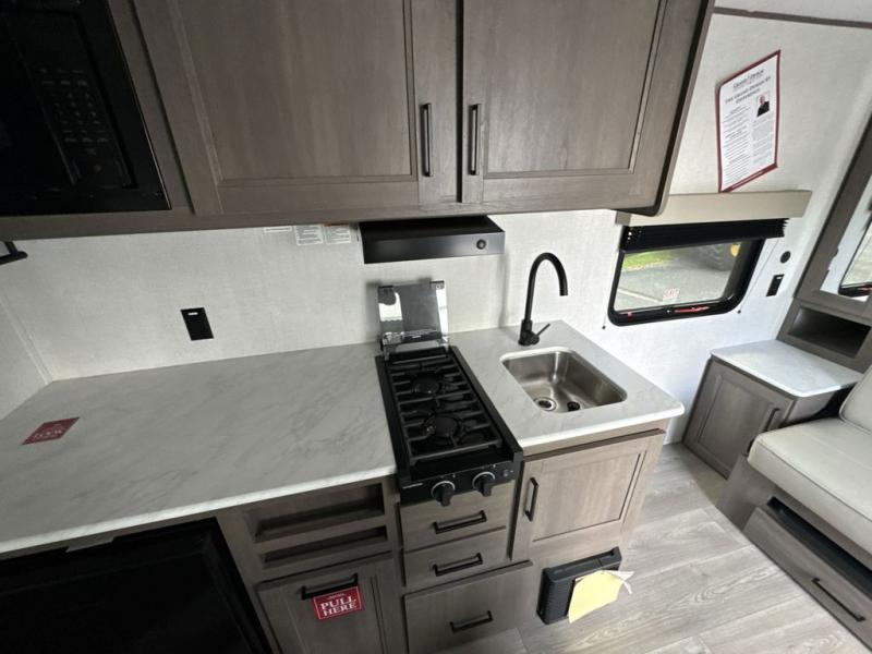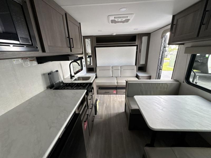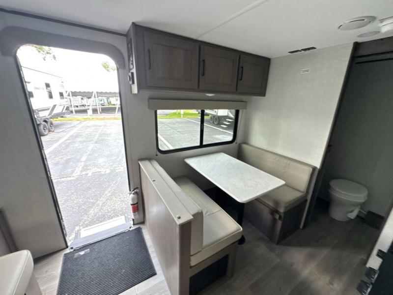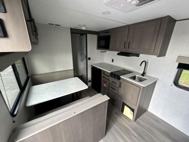 This is the perfect couple's trailer with versatile seating and sleeping space! You'll find a queen-size Murphy bed up front with storage space beside and above plus a full rear bath for added privacy. Once you've made lunch in the full kitchen, you can dine at the booth dinette or take your plate outdoors to sit under the 10' power awning. You'll also find pass-thru storage outside that will be perfect for fishing poles, lawn chairs, tools and more!