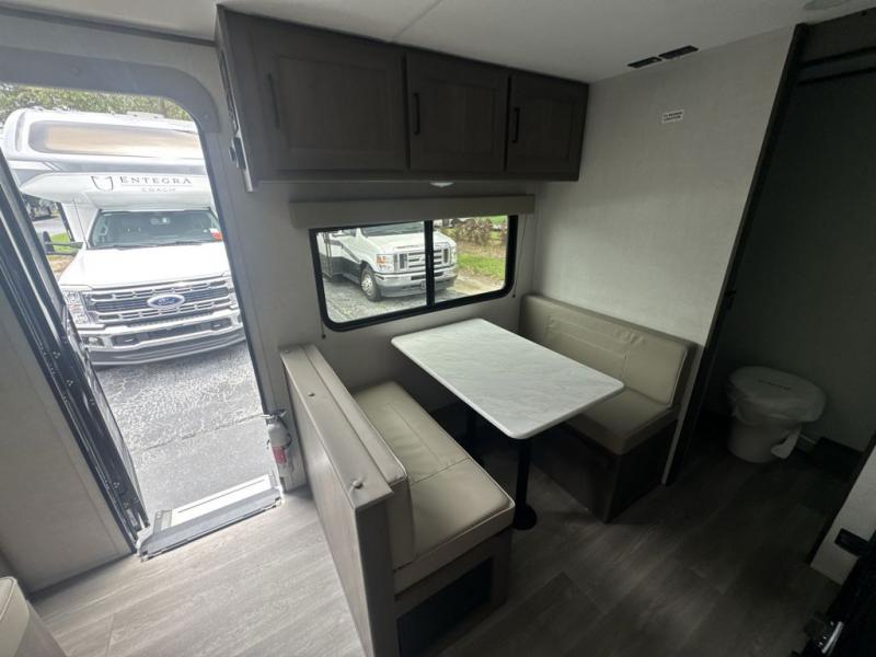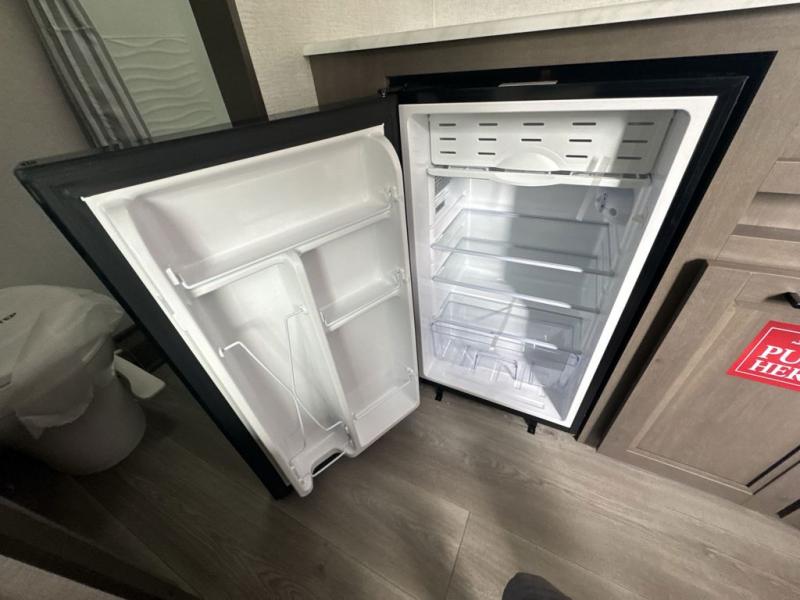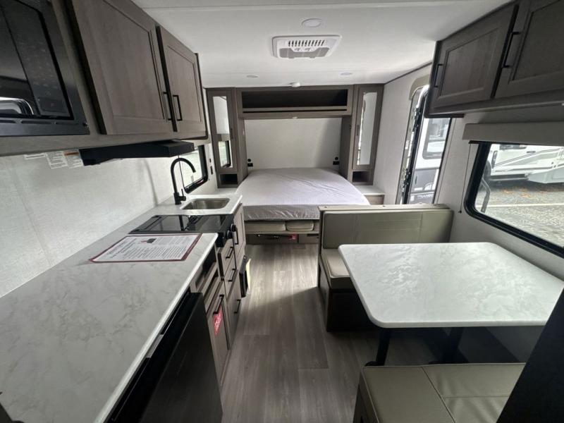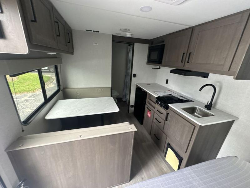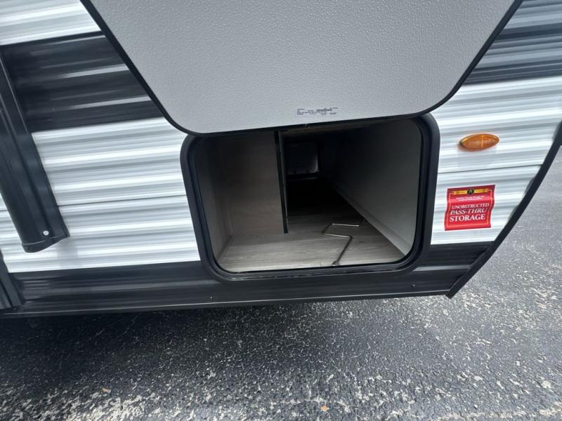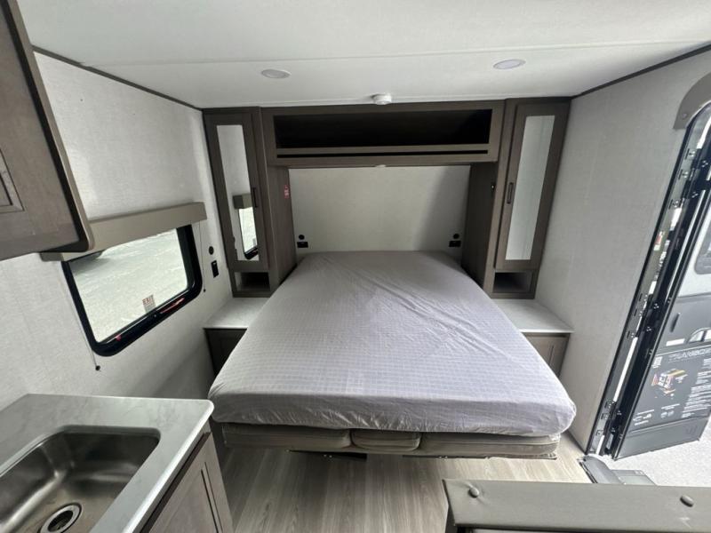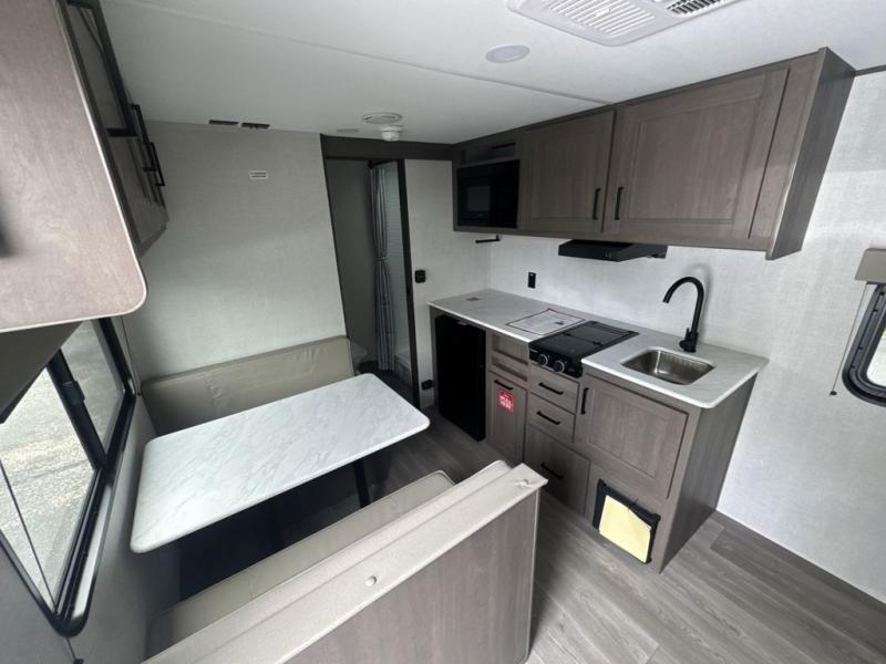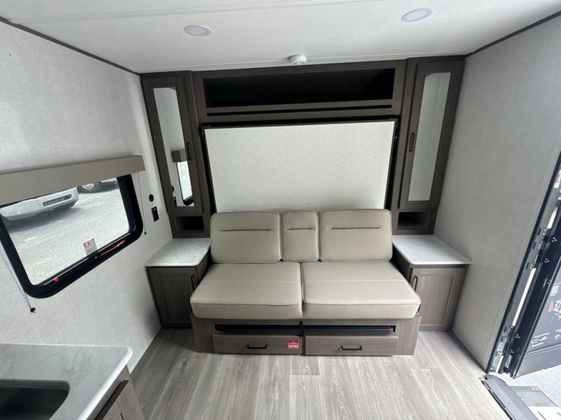 This is the perfect couple's trailer with versatile seating and sleeping space! You'll find a queen-size Murphy bed up front with storage space beside and above plus a full rear bath for added privacy. Once you've made lunch in the full kitchen, you can dine at the booth dinette or take your plate outdoors to sit under the 10' power awning. You'll also find pass-thru storage outside that will be perfect for fishing poles, lawn chairs, tools and more!
