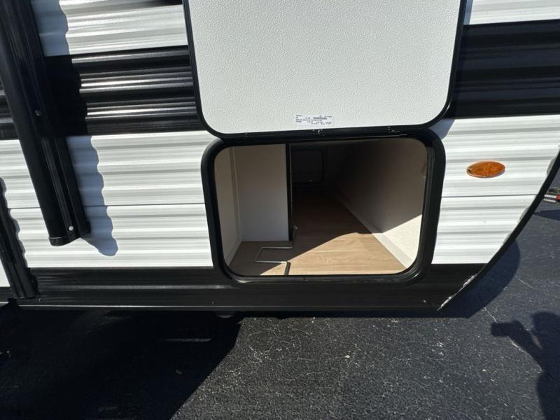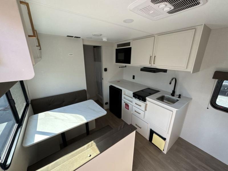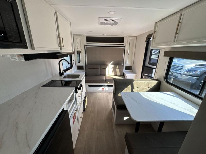 This is the perfect couple's trailer with versatile seating and sleeping space! You'll find a queen-size Murphy bed up front with storage space beside and above plus a full rear bath for added privacy. Once you've made lunch in the full kitchen, you can dine at the booth dinette or take your plate outdoors to sit under the 10' power awning. You'll also find pass-thru storage outside that will be perfect for fishing poles, lawn chairs, tools and more!