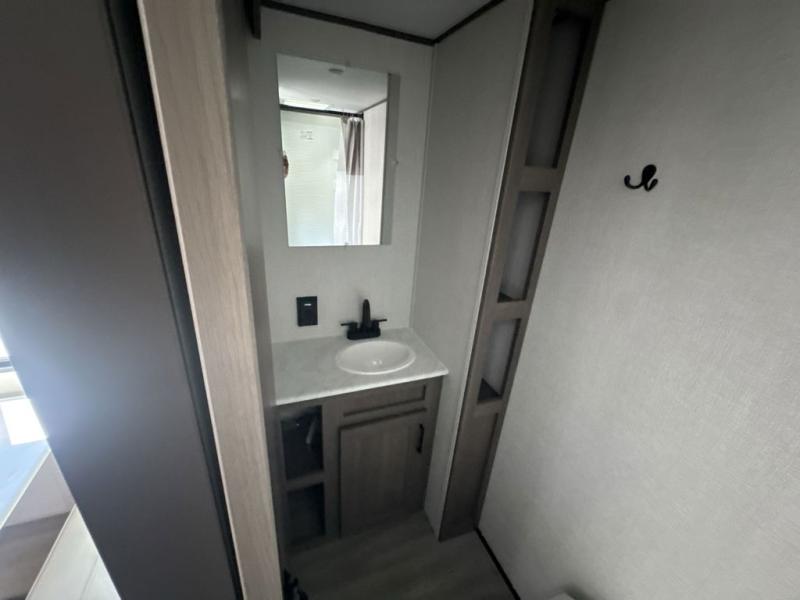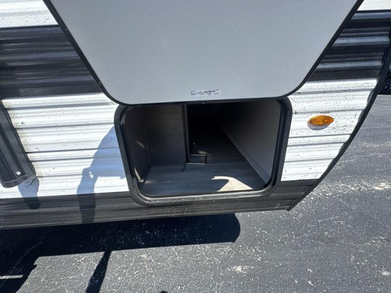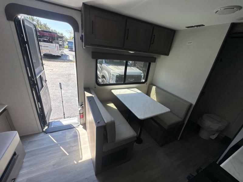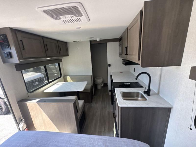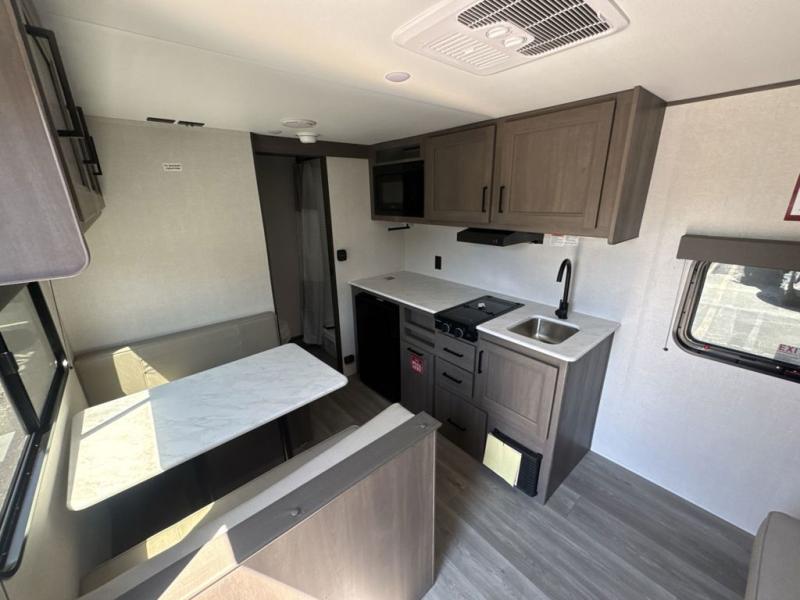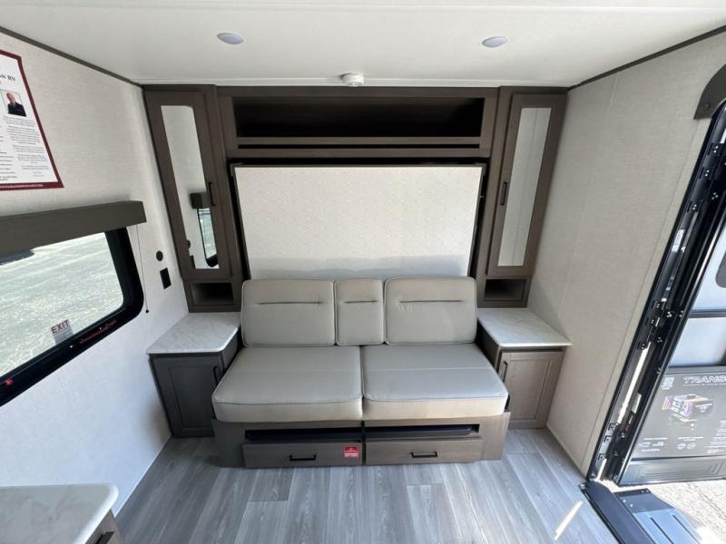 This is the perfect couple's trailer with versatile seating and sleeping space! You'll find a queen-size Murphy bed up front with storage space beside and above plus a full rear bath for added privacy. Once you've made lunch in the full kitchen, you can dine at the booth dinette or take your plate outdoors to sit under the 10' power awning. You'll also find pass-thru storage outside that will be perfect for fishing poles, lawn chairs, tools and more!