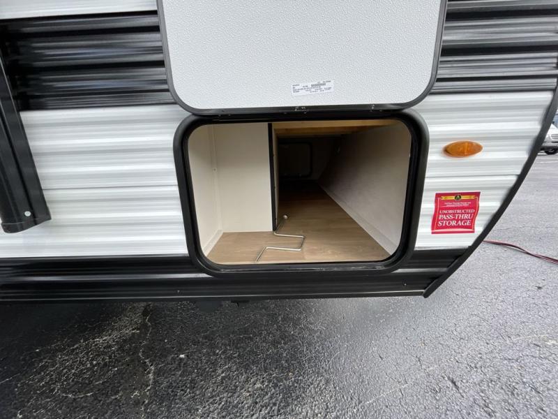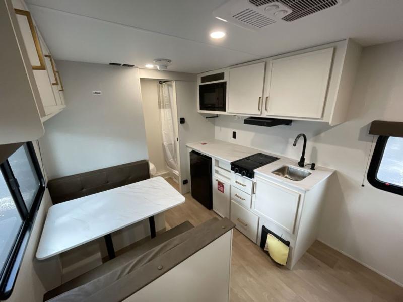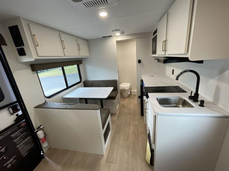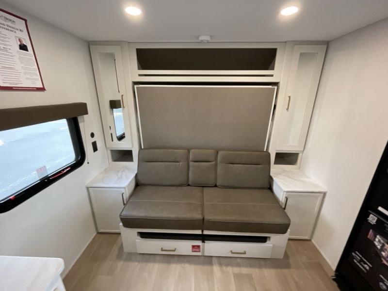 This is the perfect couple's trailer with versatile seating and sleeping space! You'll find a queen-size Murphy bed up front with storage space beside and above plus a full rear bath for added privacy. Once you've made lunch in the full kitchen, you can dine at the booth dinette or take your plate outdoors to sit under the 10' power awning. You'll also find pass-thru storage outside that will be perfect for fishing poles, lawn chairs, tools and more!