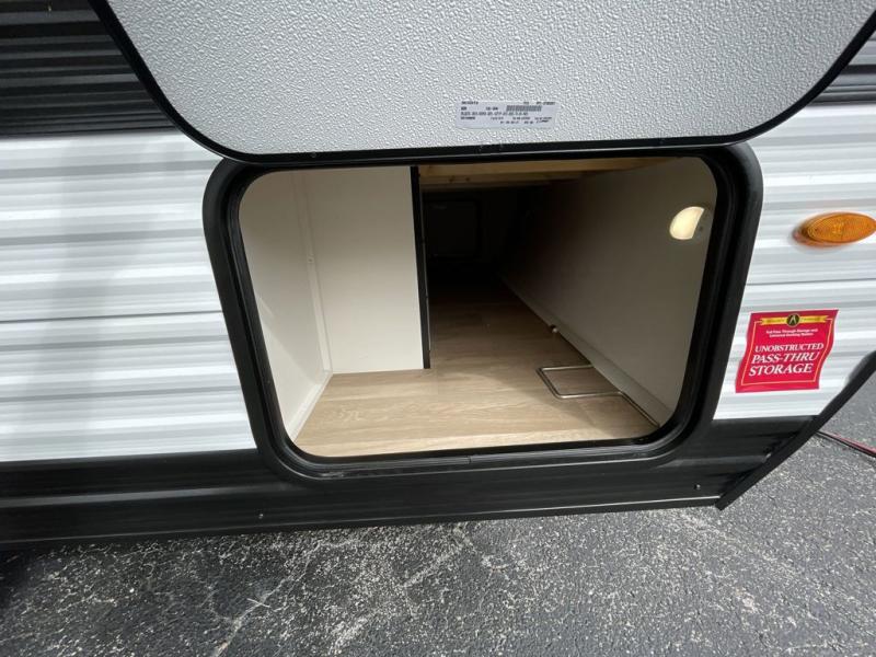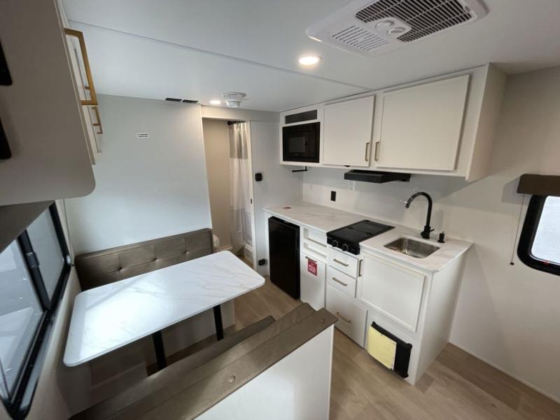 This is the perfect couple's trailer with versatile seating and sleeping space! You'll find a queen-size Murphy bed up front with storage space beside and above plus a full rear bath for added privacy. Once you've made lunch in the full kitchen, you can dine at the booth dinette or take your plate outdoors to sit under the 10' power awning. You'll also find pass-thru storage outside that will be perfect for fishing poles, lawn chairs, tools and more!