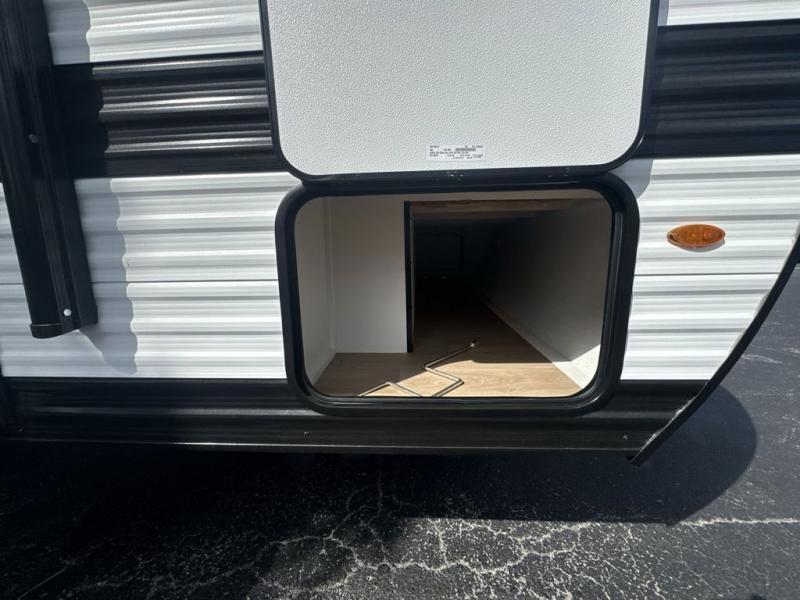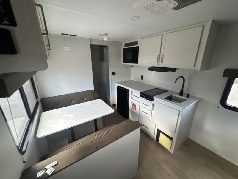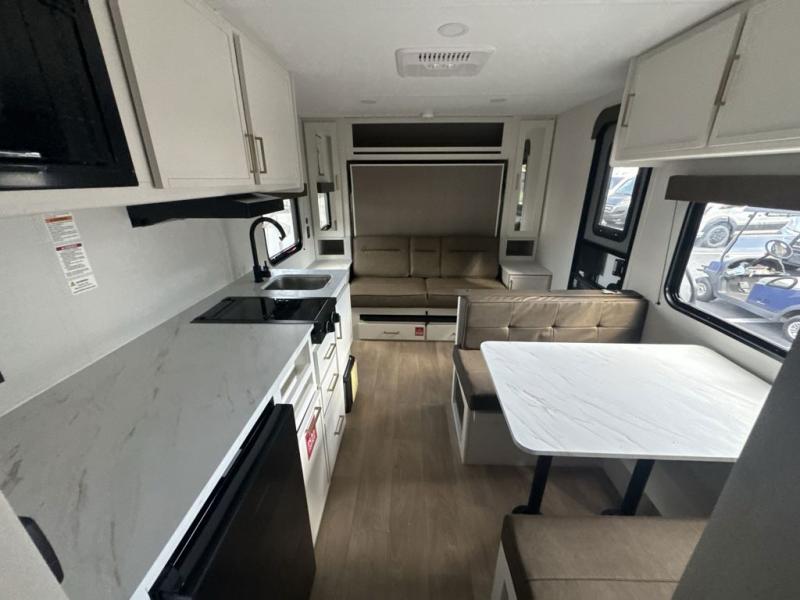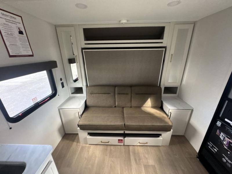 This is the perfect couple's trailer with versatile seating and sleeping space! You'll find a queen-size Murphy bed up front with storage space beside and above plus a full rear bath for added privacy. Once you've made lunch in the full kitchen, you can dine at the booth dinette or take your plate outdoors to sit under the 10' power awning. You'll also find pass-thru storage outside that will be perfect for fishing poles, lawn chairs, tools and more!