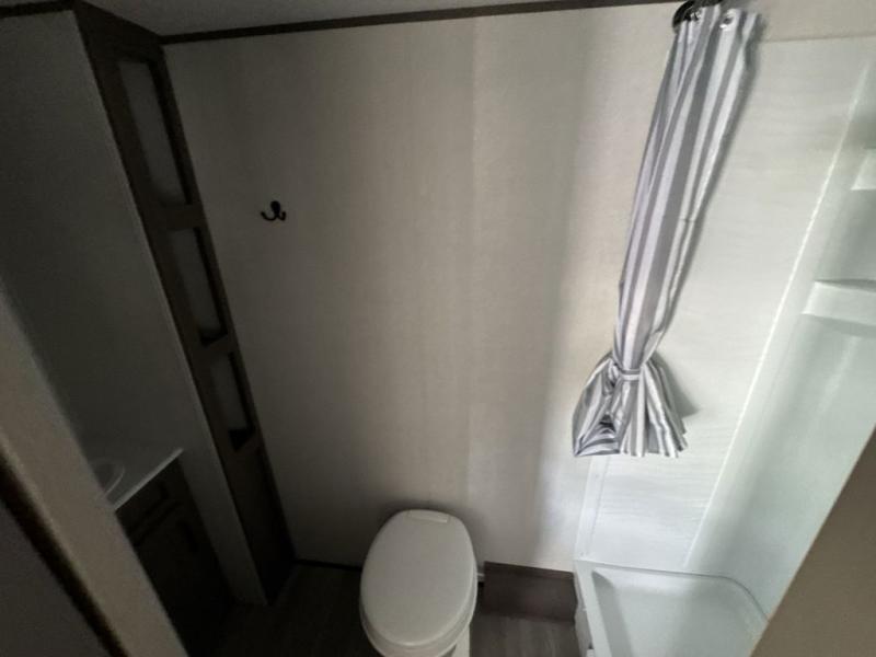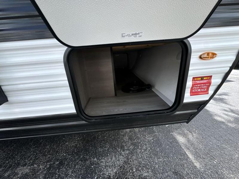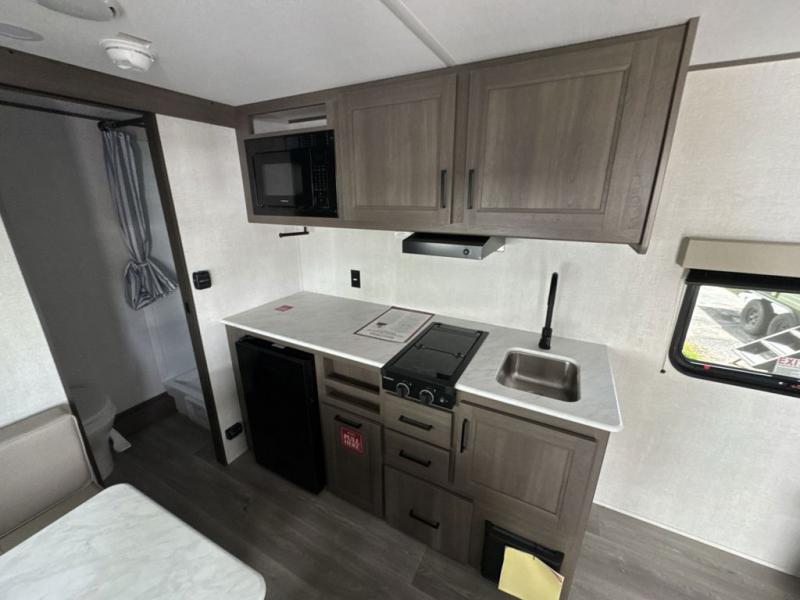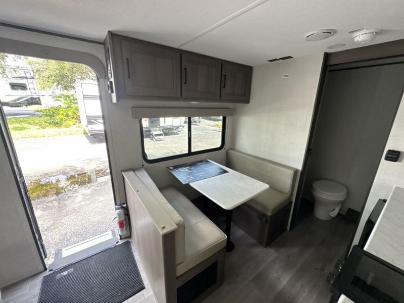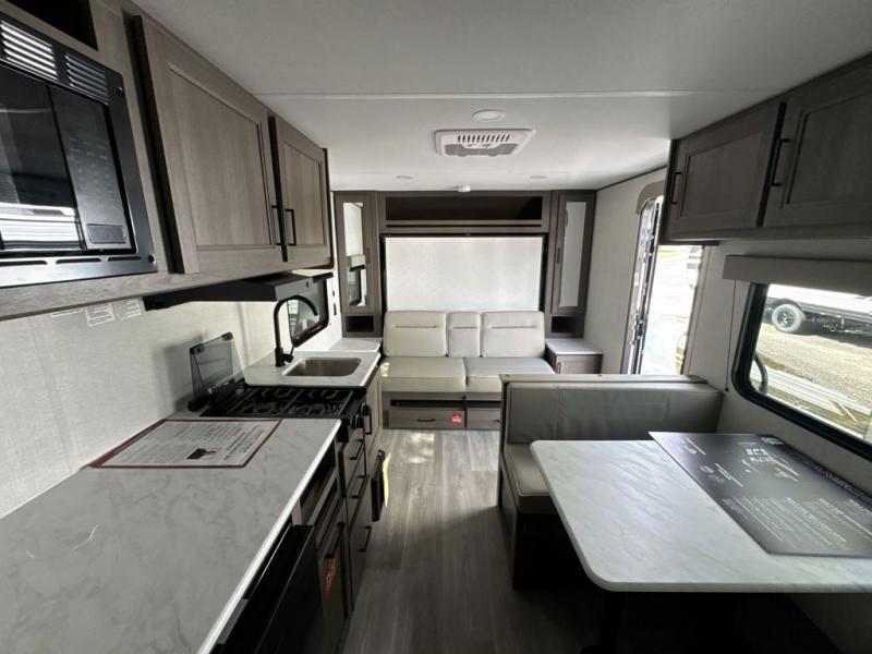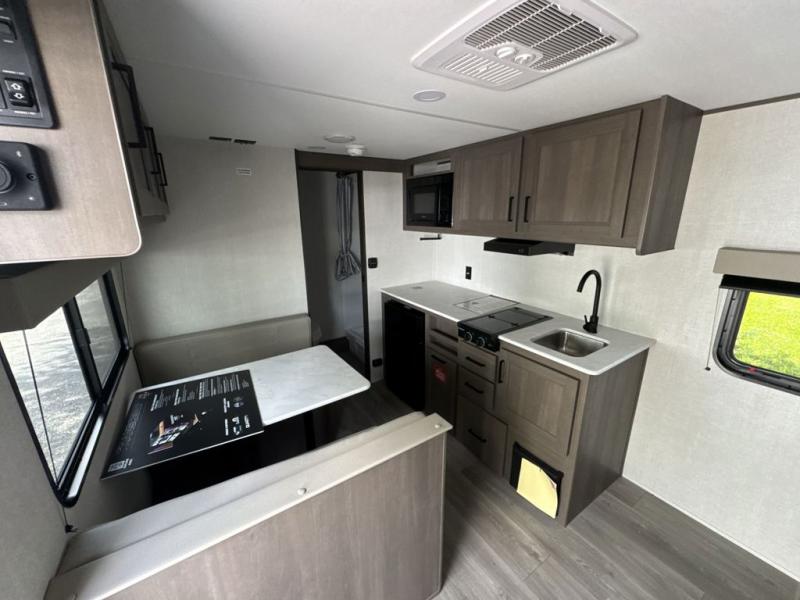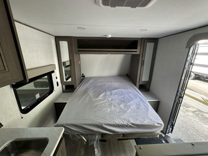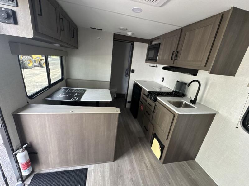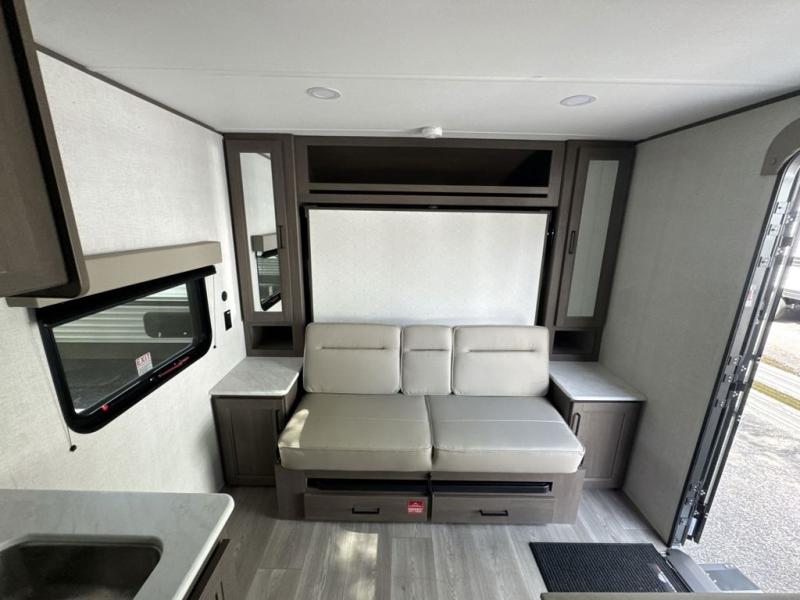 This is the perfect couple's trailer with versatile seating and sleeping space! You'll find a queen-size Murphy bed up front with storage space beside and above plus a full rear bath for added privacy. Once you've made lunch in the full kitchen, you can dine at the booth dinette or take your plate outdoors to sit under the 10' power awning. You'll also find pass-thru storage outside that will be perfect for fishing poles, lawn chairs, tools and more!