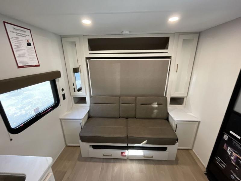 This is the perfect couple's trailer with versatile seating and sleeping space! You'll find a queen-size Murphy bed up front with storage space beside and above plus a full rear bath for added privacy. Once you've made lunch in the full kitchen, you can dine at the booth dinette or take your plate outdoors to sit under the 10' power awning. You'll also find pass-thru storage outside that will be perfect for fishing poles, lawn chairs, tools and more!