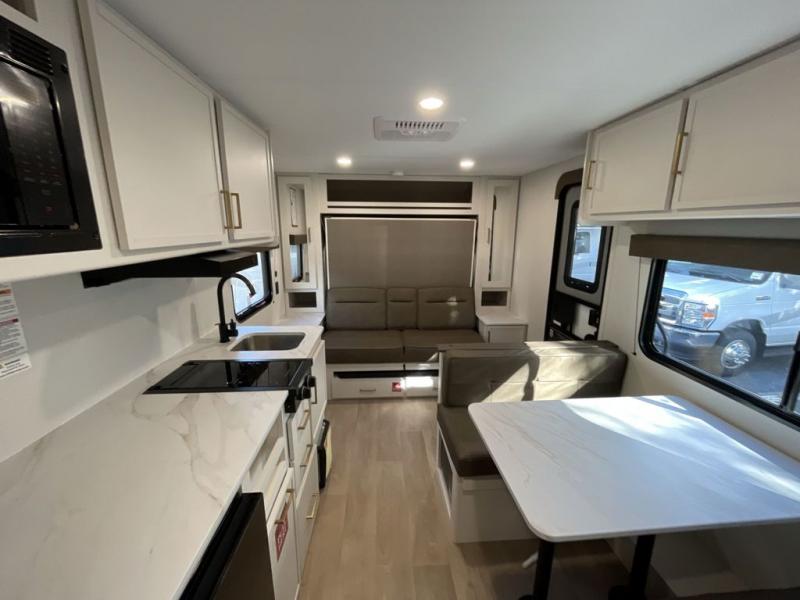 With any Transcend One travel trailer by Grand Design, you will enjoy lightweight towing thanks to their single-axle. There are many interior comforts to make camping easier than ever, such as recessed lighting, residential countertops, and a 6' 6" interior height. Each model is constructed with a heated and enclosed underbelly with suspended tanks, a moisture barrier floor enclosure, and Thermofoil over the roof and front cap for added protection. And a JBL sound system will let you listen to tunes as you visit under the power awning with a Fusion light!