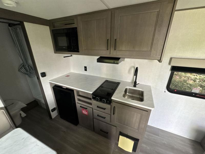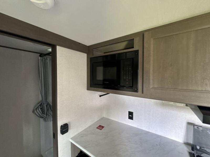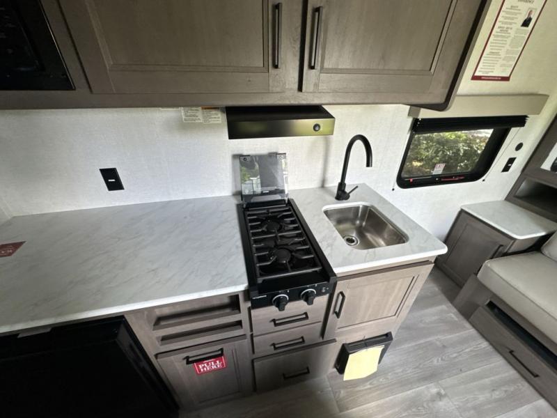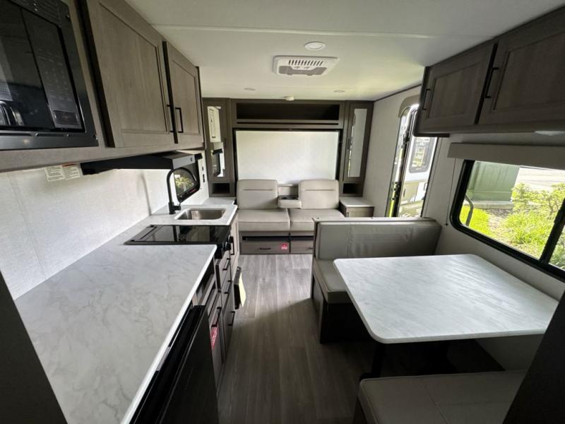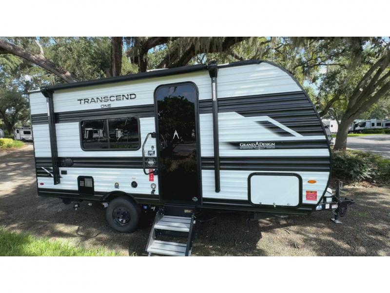 With any Transcend One travel trailer by Grand Design, you will enjoy lightweight towing thanks to their single-axle. There are many interior comforts to make camping easier than ever, such as recessed lighting, residential countertops, and a 6' 6" interior height. Each model is constructed with a heated and enclosed underbelly with suspended tanks, a moisture barrier floor enclosure, and Thermofoil over the roof and front cap for added protection. And a JBL sound system will let you listen to tunes as you visit under the power awning with a Fusion light!