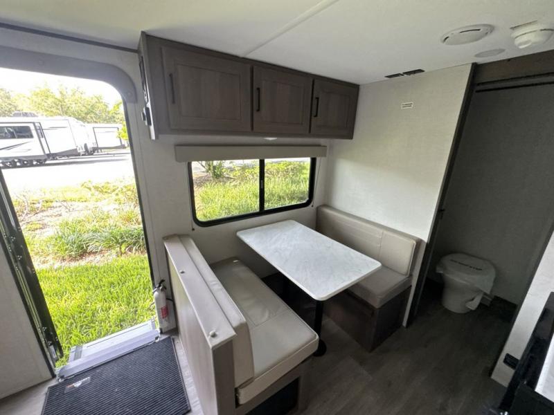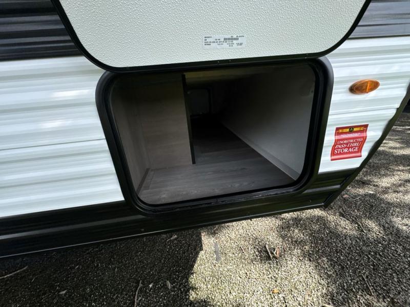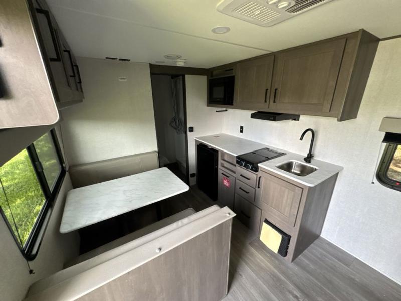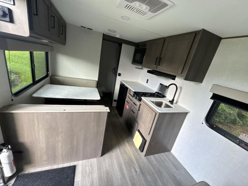 This is the perfect couple's trailer with versatile seating and sleeping space! You'll find a queen-size Murphy bed up front with storage space beside and above plus a full rear bath for added privacy. Once you've made lunch in the full kitchen, you can dine at the booth dinette or take your plate outdoors to sit under the 10' power awning. You'll also find pass-thru storage outside that will be perfect for fishing poles, lawn chairs, tools and more!