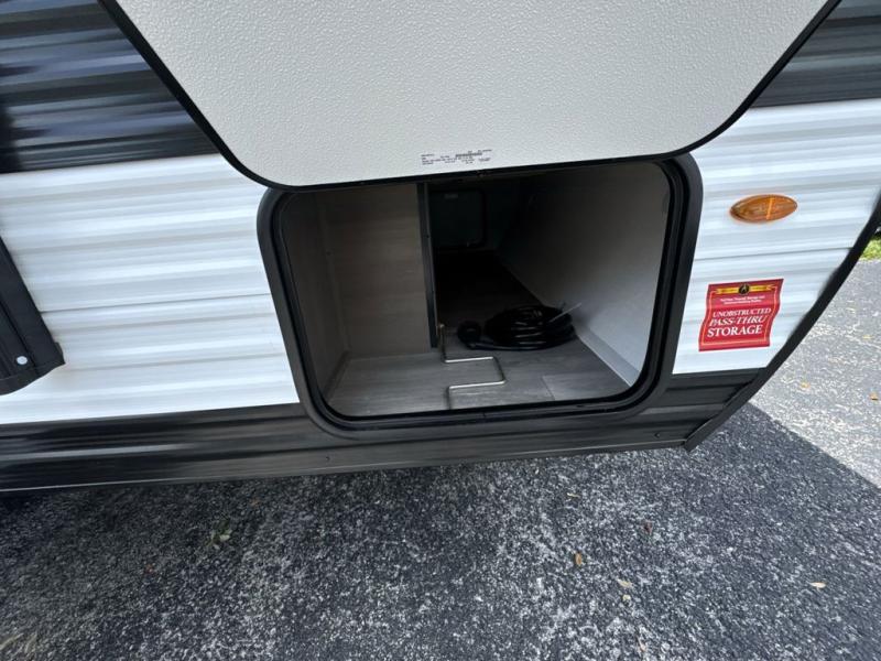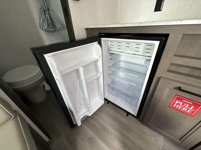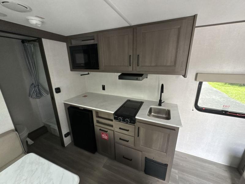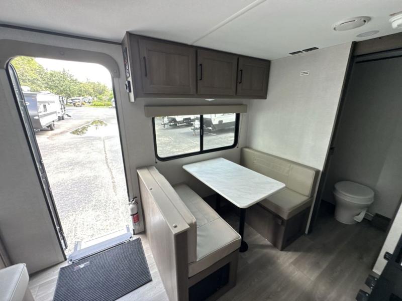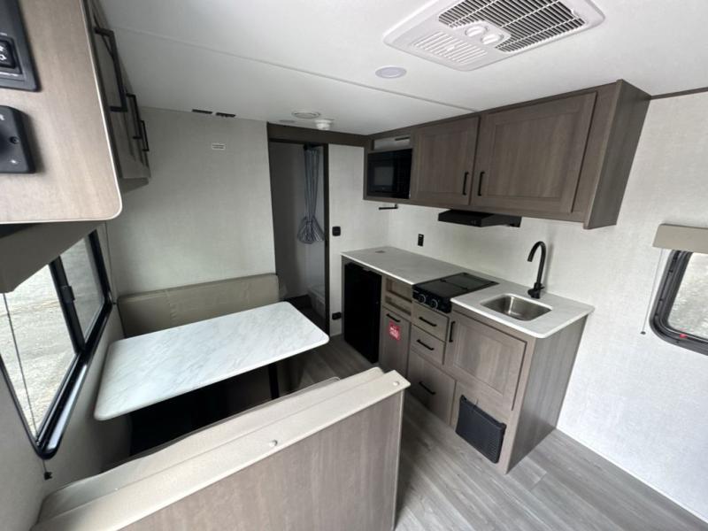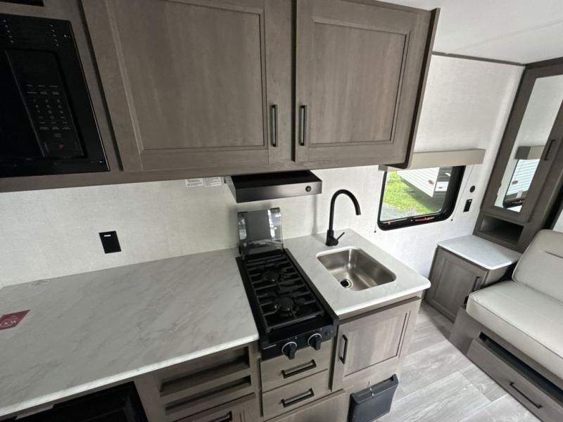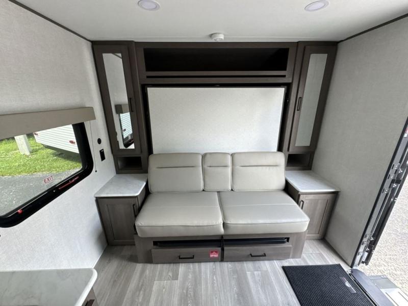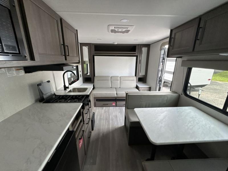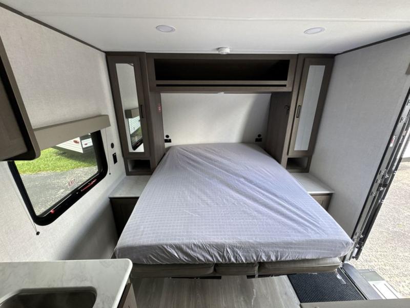 This is the perfect couple's trailer with versatile seating and sleeping space! You'll find a queen-size Murphy bed up front with storage space beside and above plus a full rear bath for added privacy. Once you've made lunch in the full kitchen, you can dine at the booth dinette or take your plate outdoors to sit under the 10' power awning. You'll also find pass-thru storage outside that will be perfect for fishing poles, lawn chairs, tools and more!