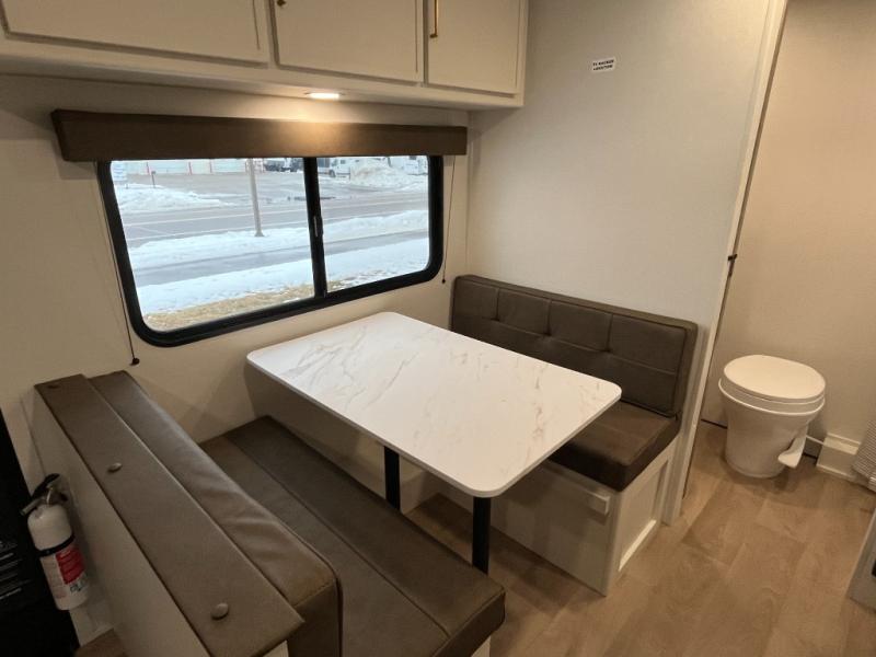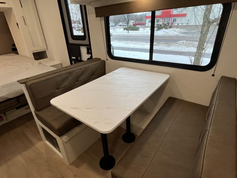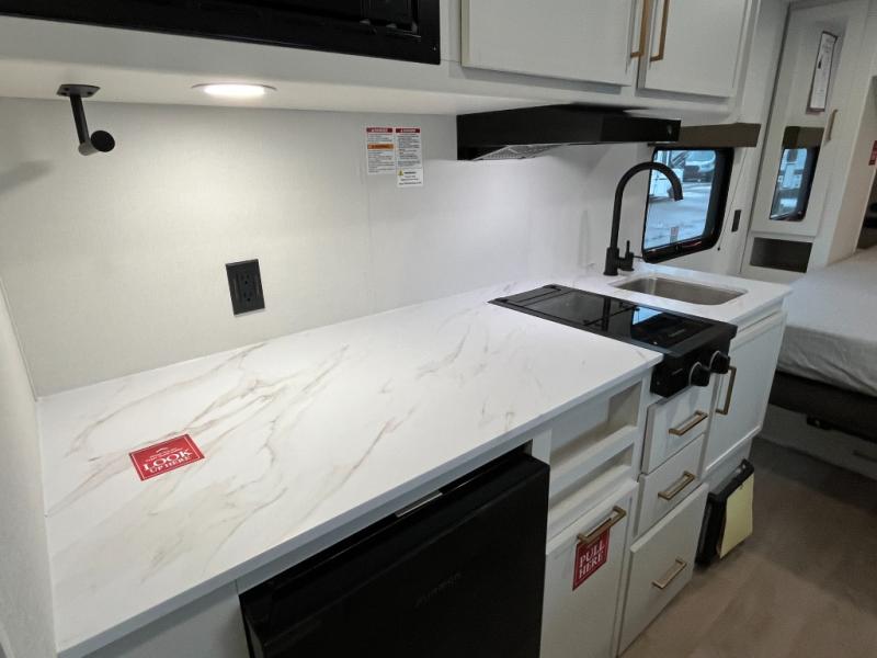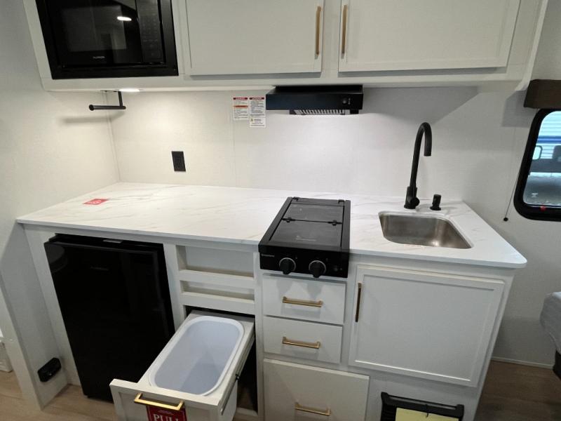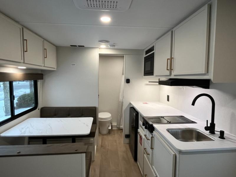 With any Transcend One travel trailer by Grand Design, you will enjoy lightweight towing thanks to their single-axle. There are many interior comforts to make camping easier than ever, such as recessed lighting, residential countertops, and a 6' 6" interior height. Each model is constructed with a heated and enclosed underbelly with suspended tanks, a moisture barrier floor enclosure, and Thermofoil over the roof and front cap for added protection. And a JBL sound system will let you listen to tunes as you visit under the power awning with a Fusion light!