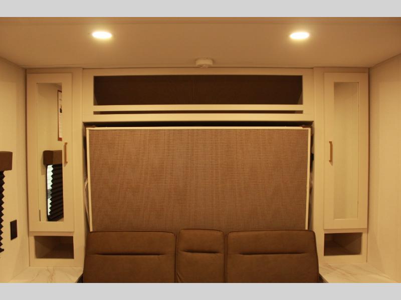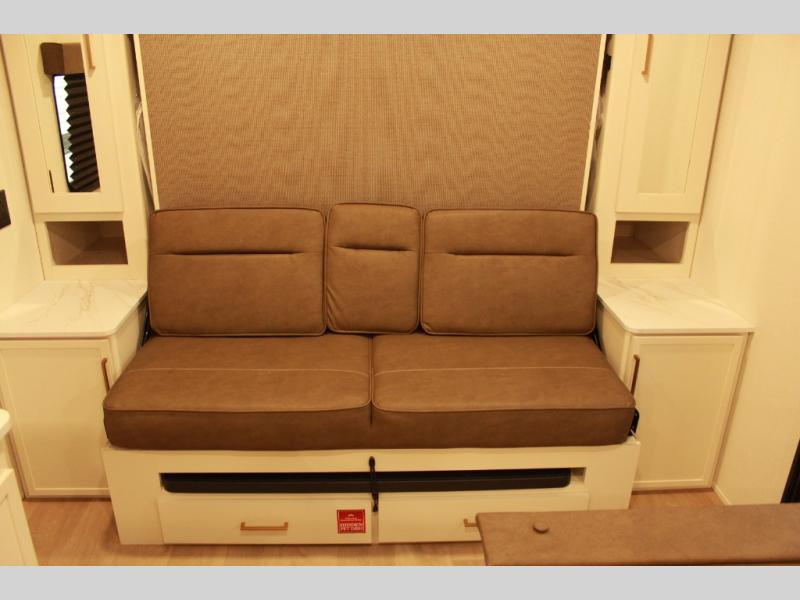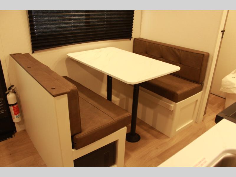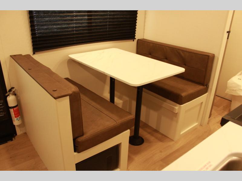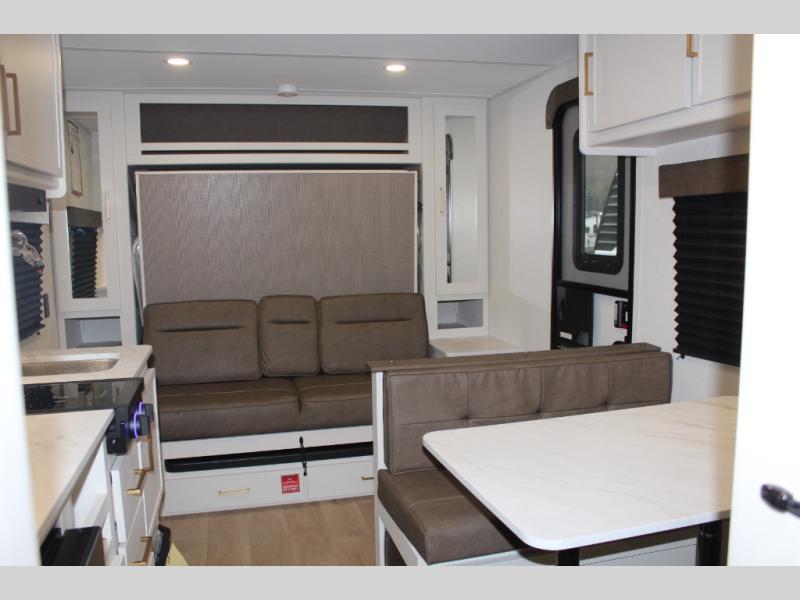 This is the perfect couple's trailer with versatile seating and sleeping space! You'll find a queen-size Murphy bed up front with storage space beside and above plus a full rear bath for added privacy. Once you've made lunch in the full kitchen, you can dine at the booth dinette or take your plate outdoors to sit under the 10' power awning. You'll also find pass-thru storage outside that will be perfect for fishing poles, lawn chairs, tools and more!