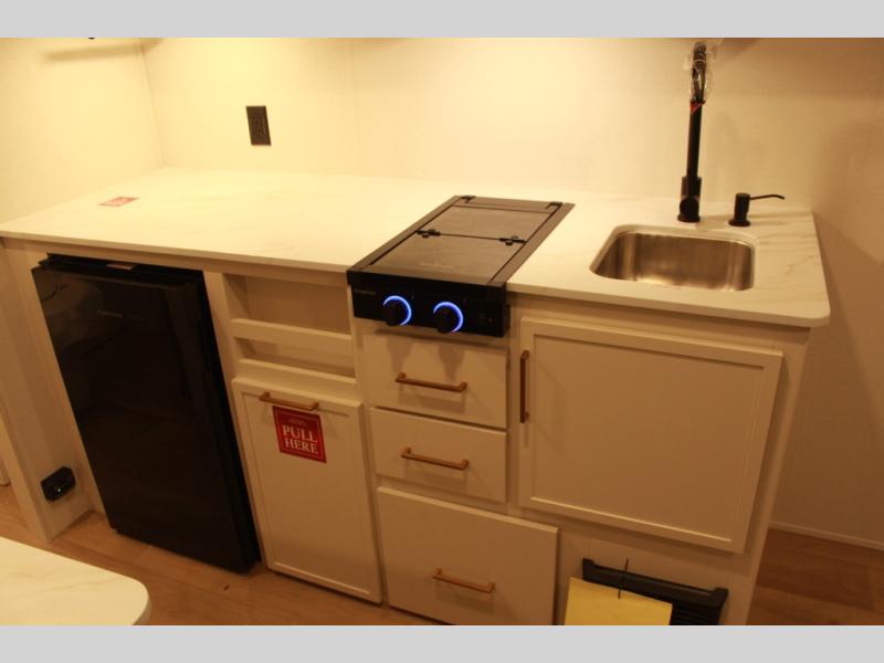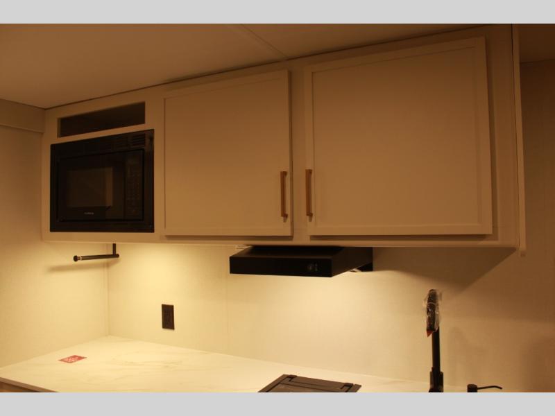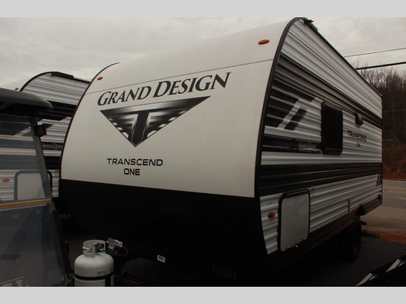 With any Transcend One travel trailer by Grand Design, you will enjoy lightweight towing thanks to their single-axle. There are many interior comforts to make camping easier than ever, such as recessed lighting, residential countertops, and a 6' 6" interior height. Each model is constructed with a heated and enclosed underbelly with suspended tanks, a moisture barrier floor enclosure, and Thermofoil over the roof and front cap for added protection. And a JBL sound system will let you listen to tunes as you visit under the power awning with a Fusion light!