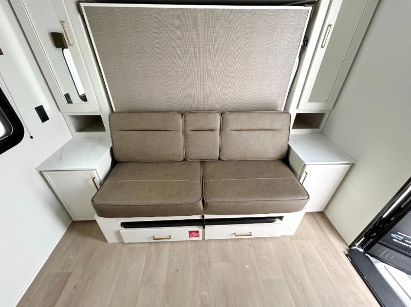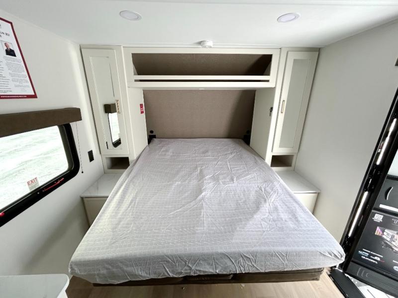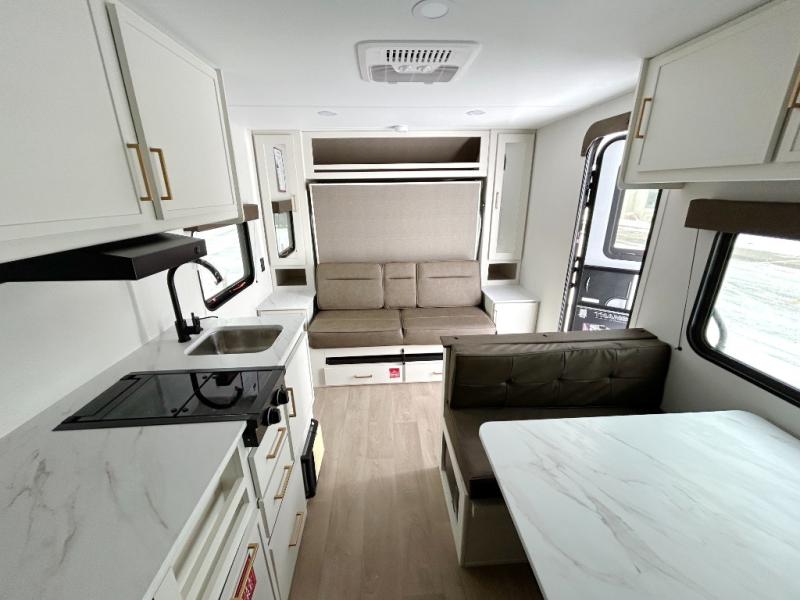This is the perfect couple's trailer with versatile seating and sleeping space! You'll find a queen-size Murphy bed up front with storage space beside and above plus a full rear bath for added privacy. Once you've made lunch in the full kitchen, you can dine at the booth dinette or take your plate outdoors to sit under the 10' power awning. You'll also find pass-thru storage outside that will be perfect for fishing poles, lawn chairs, tools and more!