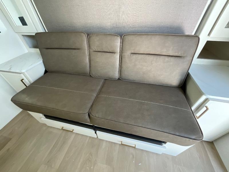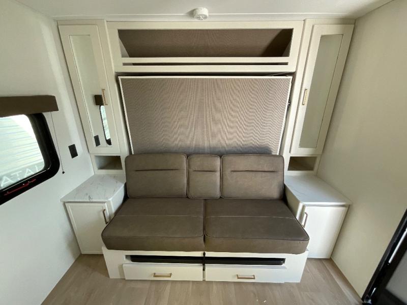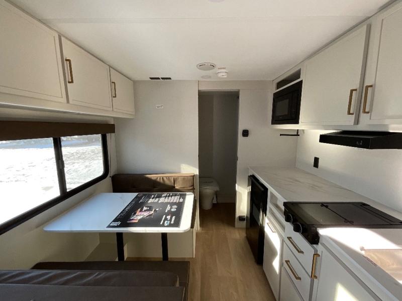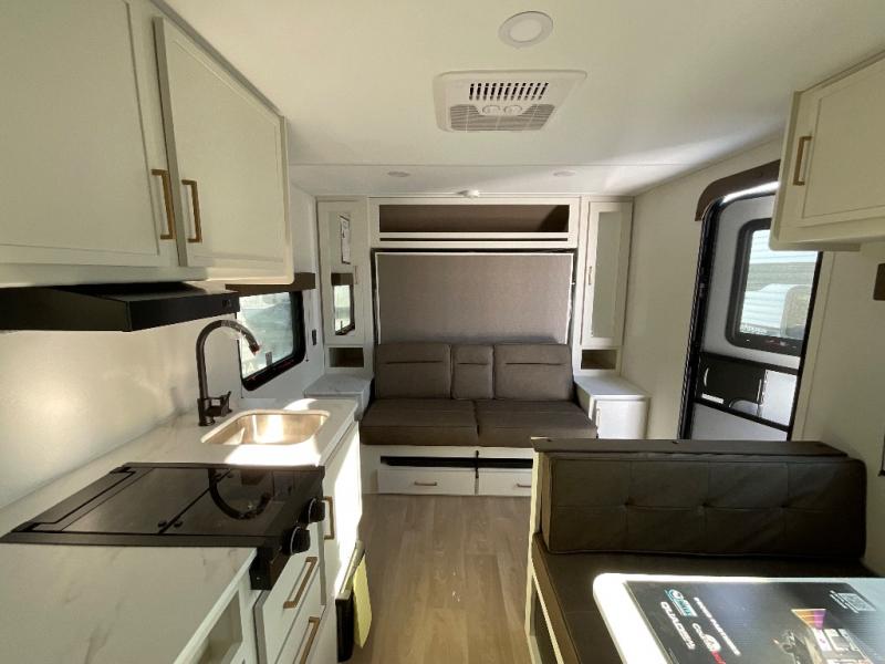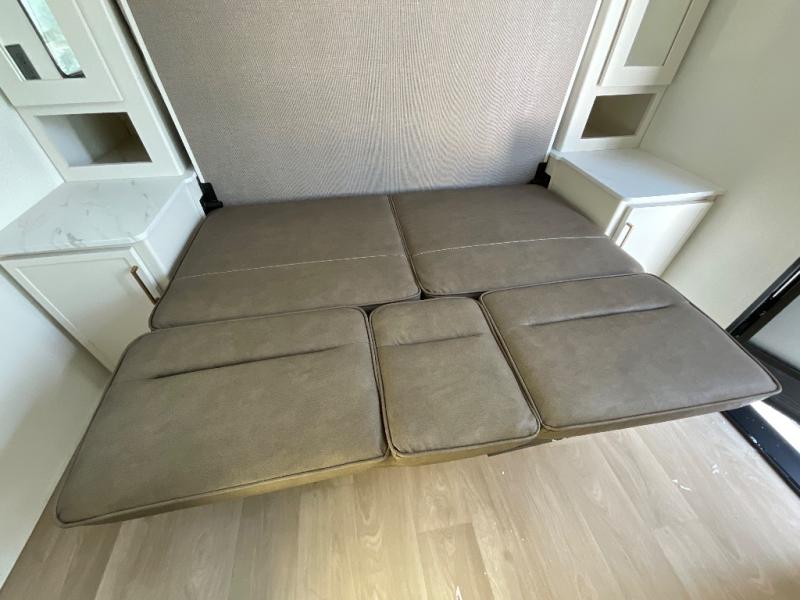 This is the perfect couple's trailer with versatile seating and sleeping space! You'll find a queen-size Murphy bed up front with storage space beside and above plus a full rear bath for added privacy. Once you've made lunch in the full kitchen, you can dine at the booth dinette or take your plate outdoors to sit under the 10' power awning. You'll also find pass-thru storage outside that will be perfect for fishing poles, lawn chairs, tools and more!