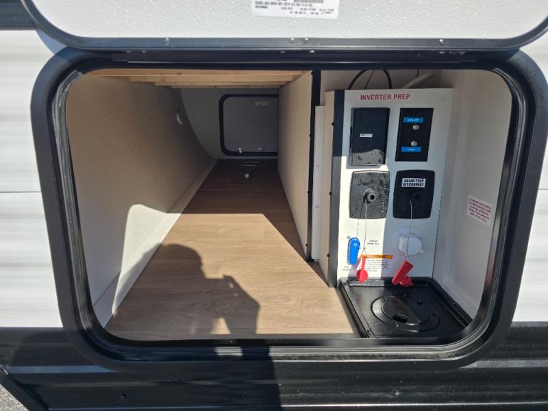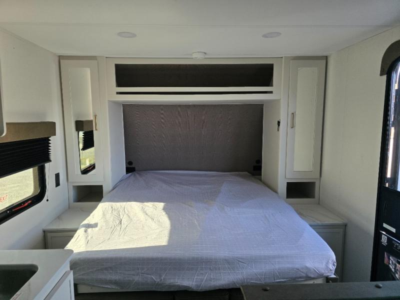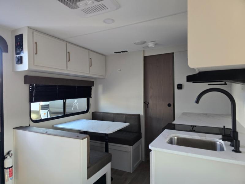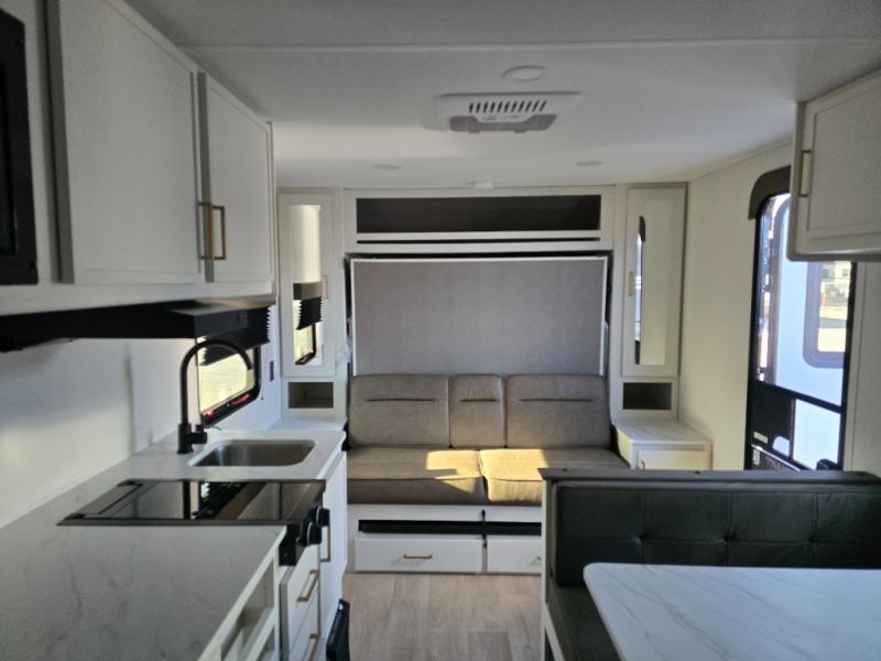 This is the perfect couple's trailer with versatile seating and sleeping space! You'll find a queen-size Murphy bed up front with storage space beside and above plus a full rear bath for added privacy. Once you've made lunch in the full kitchen, you can dine at the booth dinette or take your plate outdoors to sit under the 10' power awning. You'll also find pass-thru storage outside that will be perfect for fishing poles, lawn chairs, tools and more!