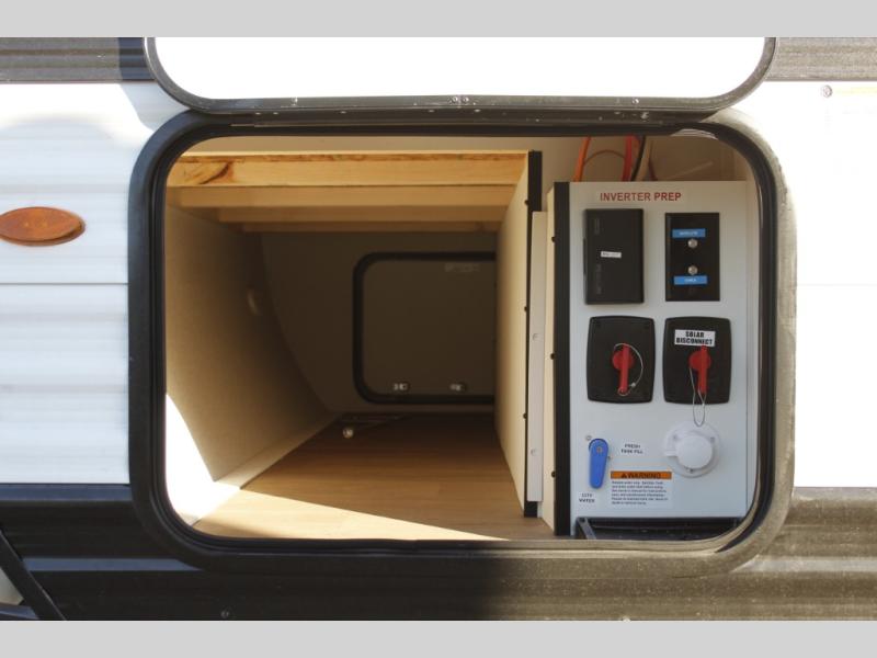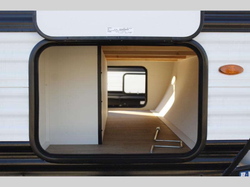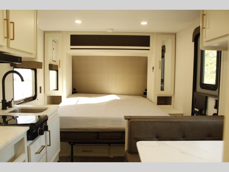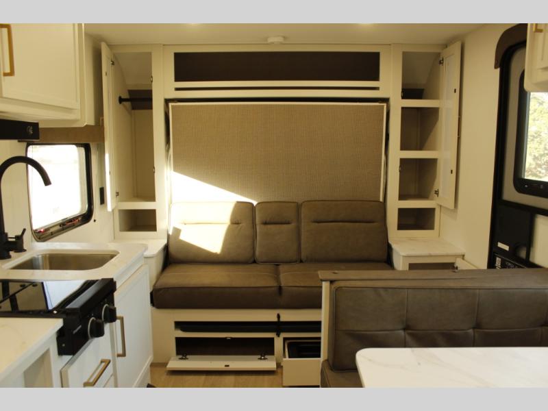 This is the perfect couple's trailer with versatile seating and sleeping space! You'll find a queen-size Murphy bed up front with storage space beside and above plus a full rear bath for added privacy. Once you've made lunch in the full kitchen, you can dine at the booth dinette or take your plate outdoors to sit under the 10' power awning. You'll also find pass-thru storage outside that will be perfect for fishing poles, lawn chairs, tools and more!