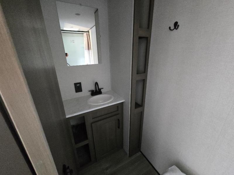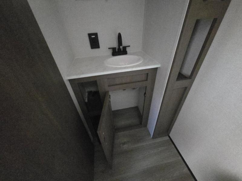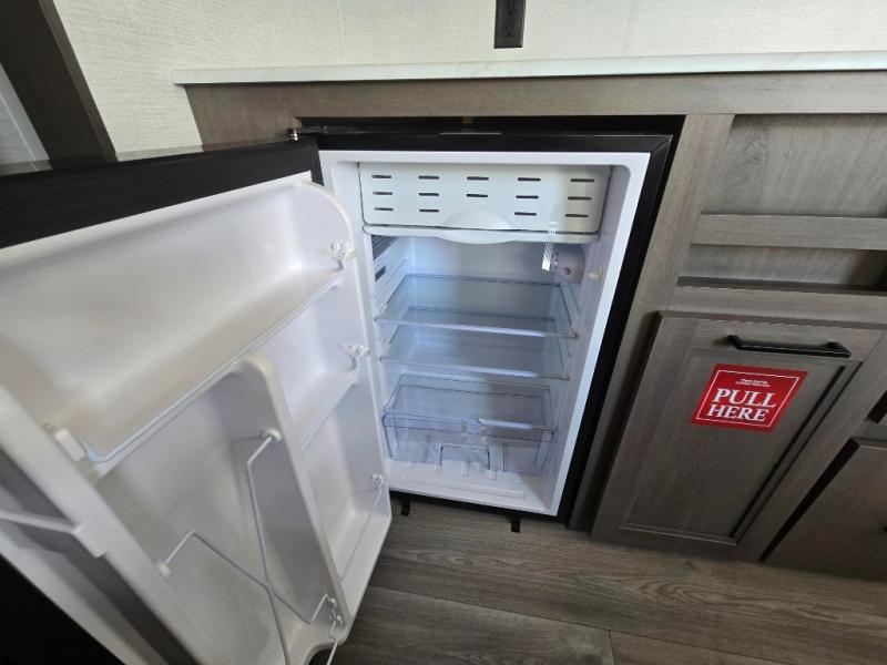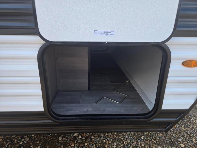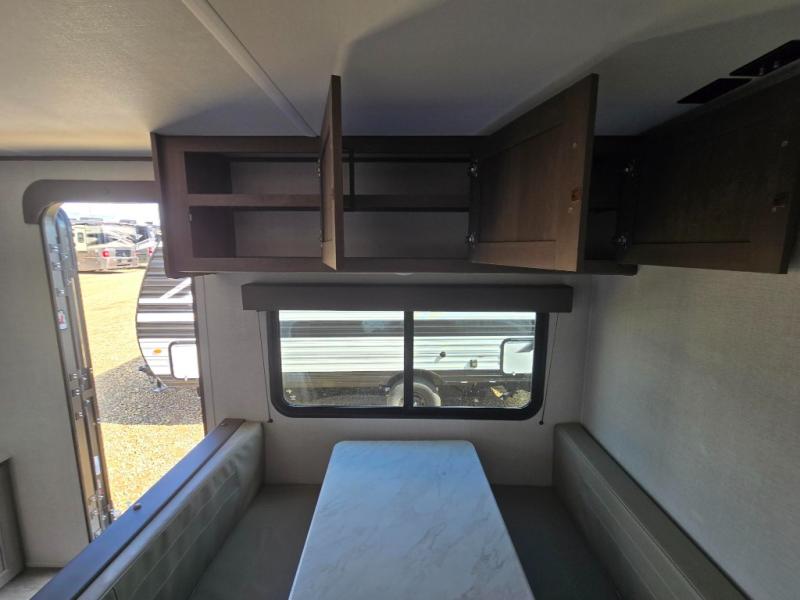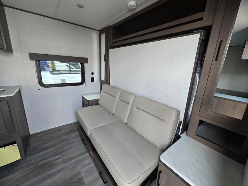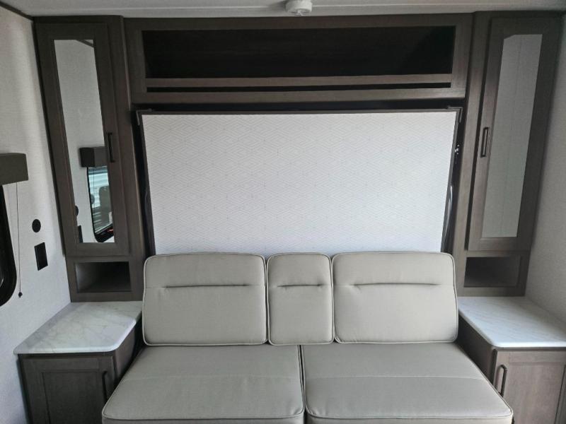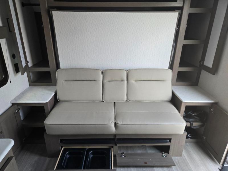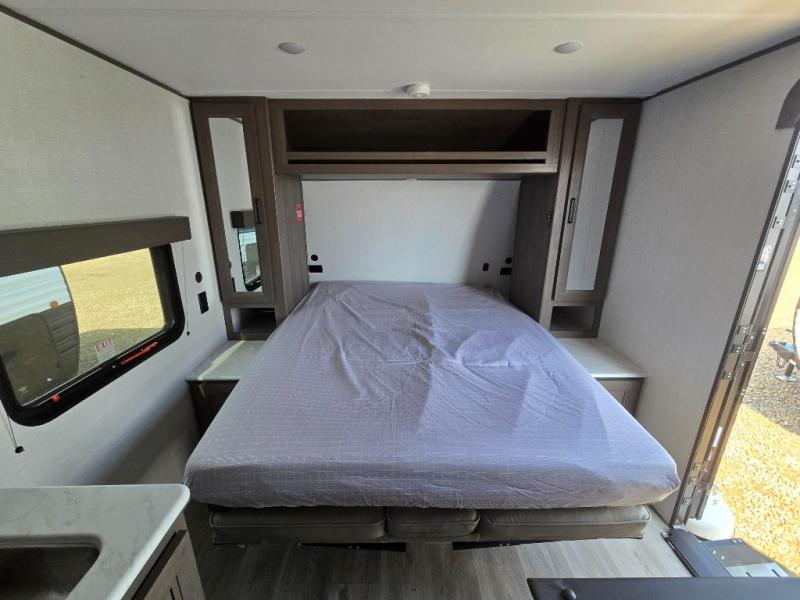 This is the perfect couple's trailer with versatile seating and sleeping space! You'll find a queen-size Murphy bed up front with storage space beside and above plus a full rear bath for added privacy. Once you've made lunch in the full kitchen, you can dine at the booth dinette or take your plate outdoors to sit under the 10' power awning. You'll also find pass-thru storage outside that will be perfect for fishing poles, lawn chairs, tools and more!