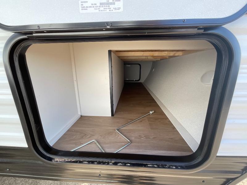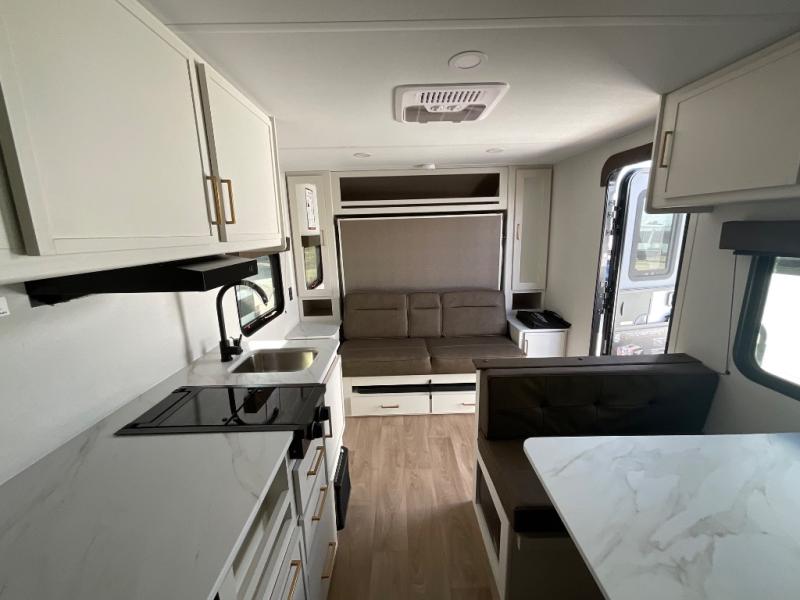 This is the perfect couple's trailer with versatile seating and sleeping space! You'll find a queen-size Murphy bed up front with storage space beside and above plus a full rear bath for added privacy. Once you've made lunch in the full kitchen, you can dine at the booth dinette or take your plate outdoors to sit under the 10' power awning. You'll also find pass-thru storage outside that will be perfect for fishing poles, lawn chairs, tools and more!