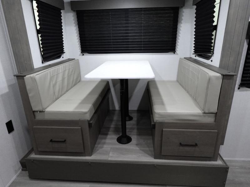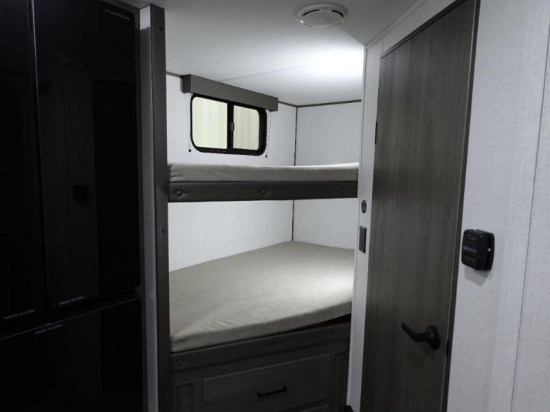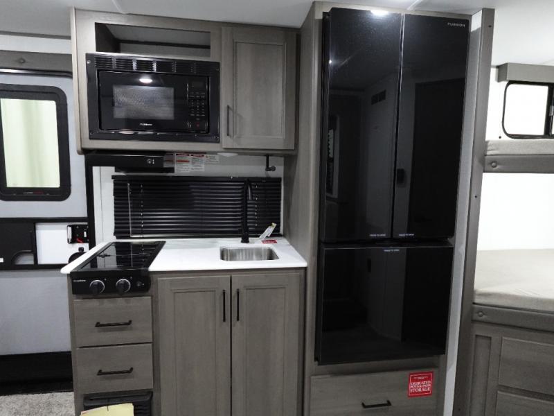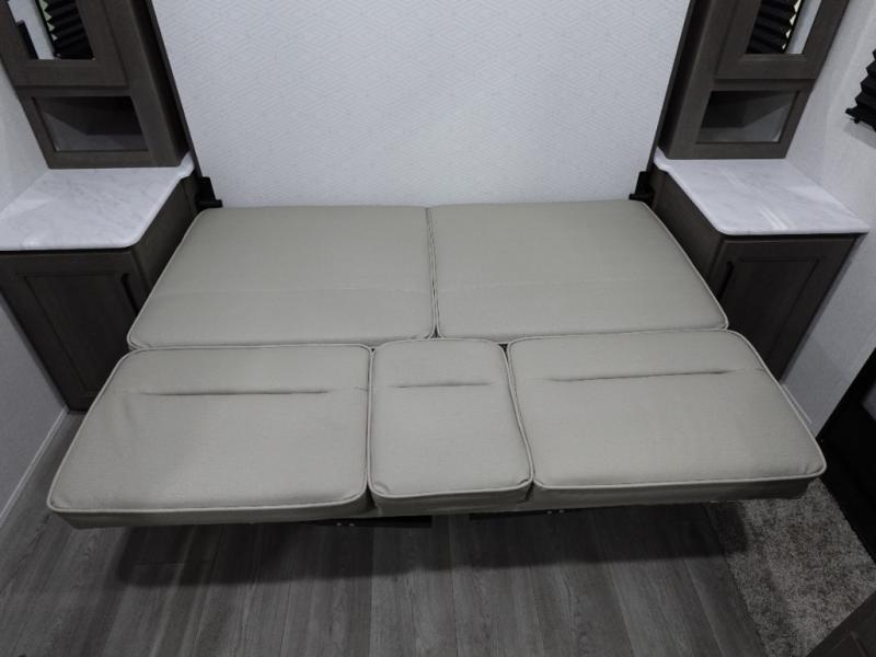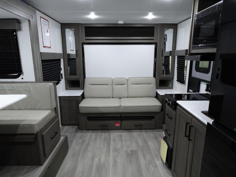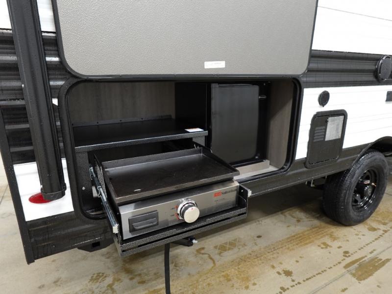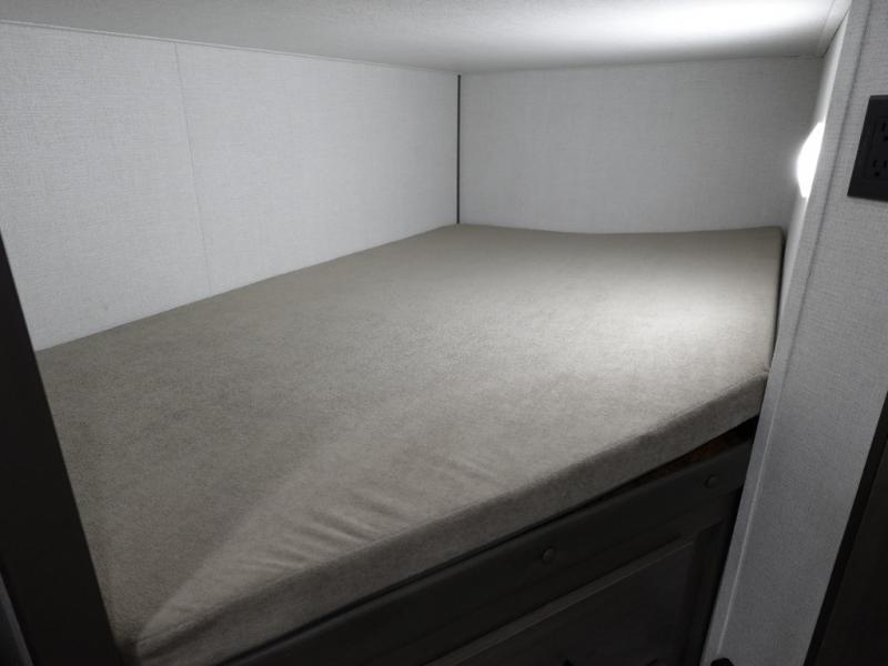 Spacious and versatile, this travel trailer is perfect for weekend trips to the campground or weeklong visits to the lake! There is a front Murphy bed with storage on both sides plus a pull-out pet drawer to keep your furry friends happy. Your guests or little ones will love the double-size bunks with privacy curtains, and the full bath is right next to the bunks for easy nighttime use. Once you make breakfast on the two burner range, you can dine at the booth dinette slide. And this model also includes an outdoor griddle and refrigerator if you want to make breakfast outdoors. Additional exterior features include a 16' power awning, an interior/exterior table, and a pass-thru storage for larger camp gear.
