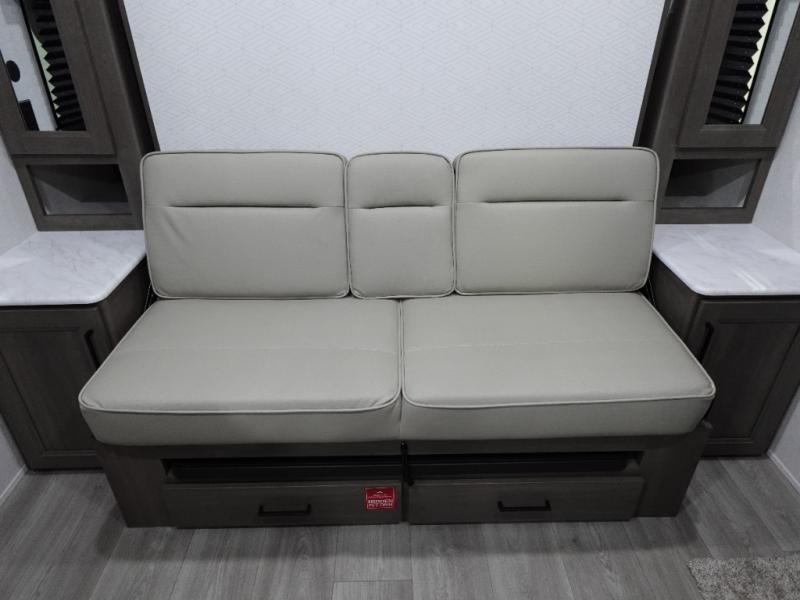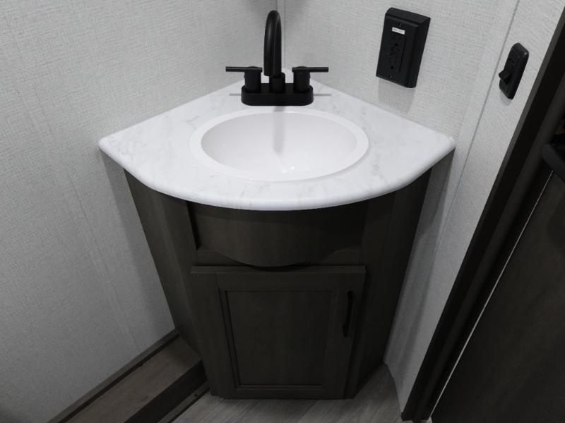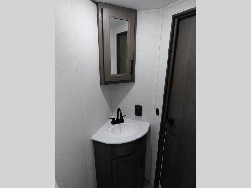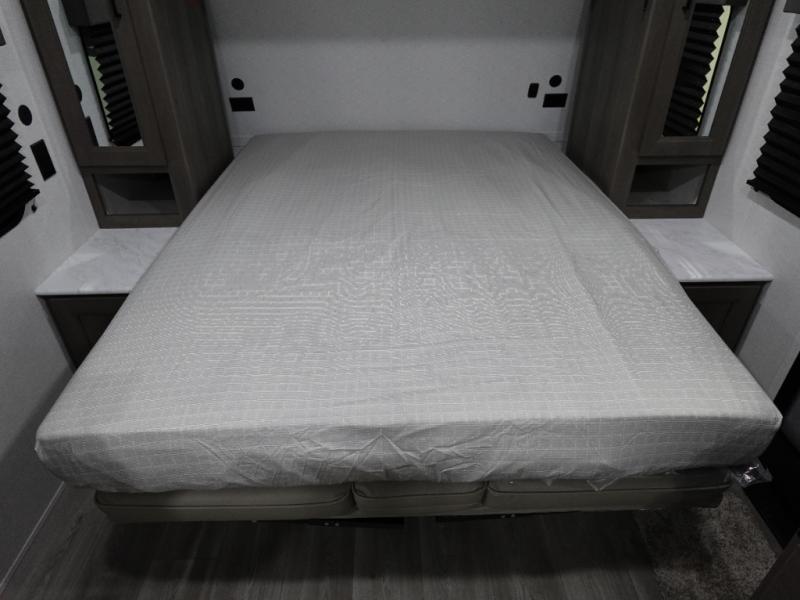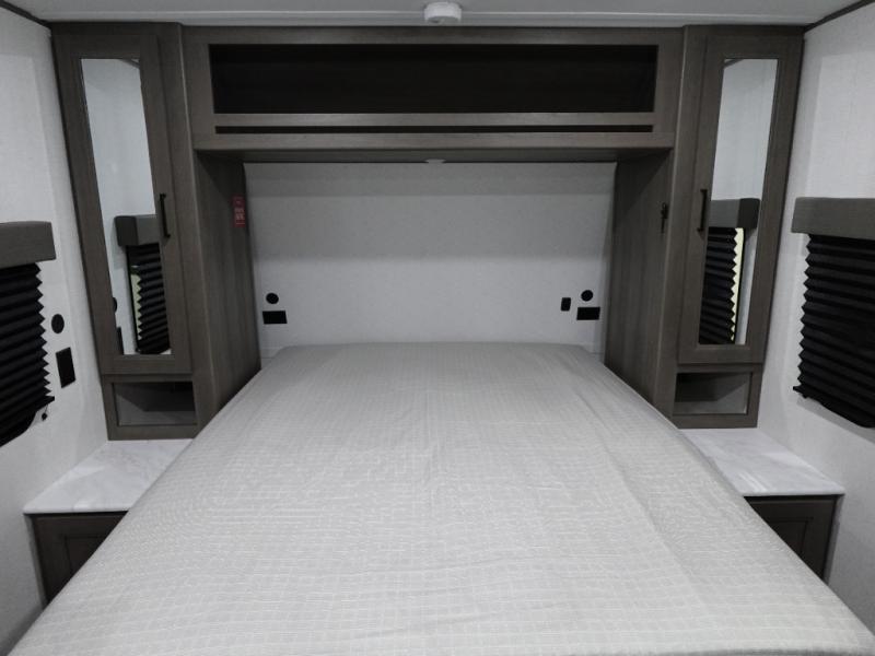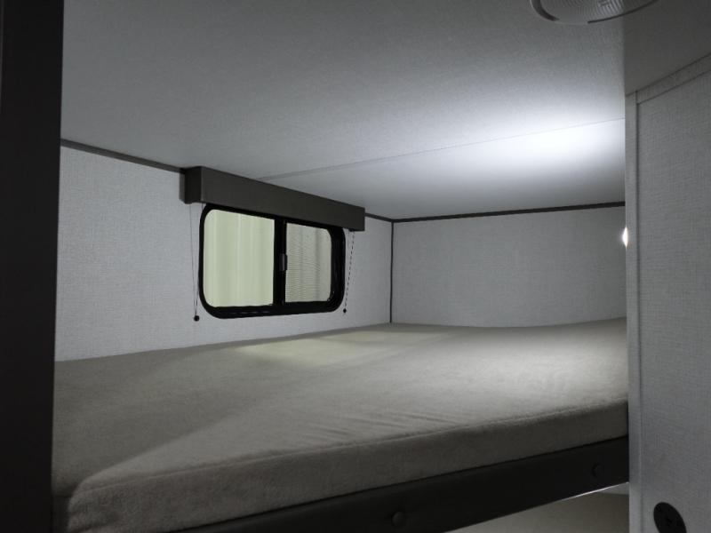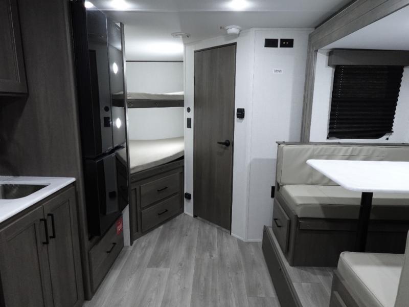 Spacious and versatile, this travel trailer is perfect for weekend trips to the campground or weeklong visits to the lake! There is a front Murphy bed with storage on both sides plus a pull-out pet drawer to keep your furry friends happy. Your guests or little ones will love the double-size bunks with privacy curtains, and the full bath is right next to the bunks for easy nighttime use. Once you make breakfast on the two burner range, you can dine at the booth dinette slide. And this model also includes an outdoor griddle and refrigerator if you want to make breakfast outdoors. Additional exterior features include a 16' power awning, an interior/exterior table, and a pass-thru storage for larger camp gear.