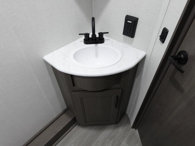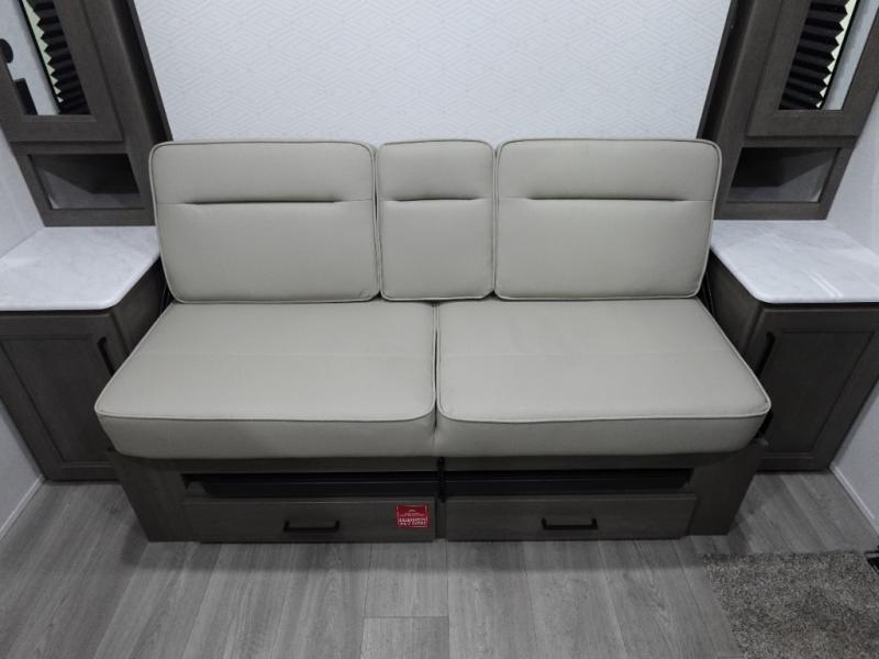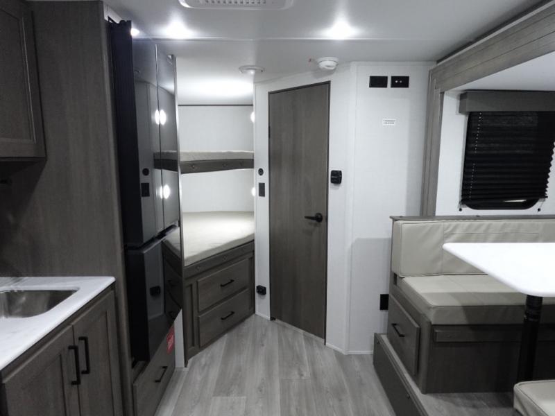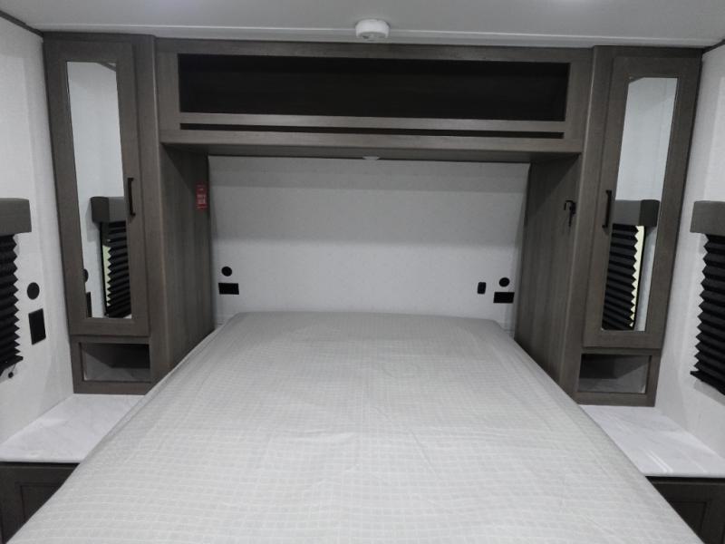 Spacious and versatile, this travel trailer is perfect for weekend trips to the campground or weeklong visits to the lake! There is a front Murphy bed with storage on both sides plus a pull-out pet drawer to keep your furry friends happy. Your guests or little ones will love the double-size bunks with privacy curtains, and the full bath is right next to the bunks for easy nighttime use. Once you make breakfast on the two burner range, you can dine at the booth dinette slide. And this model also includes an outdoor griddle and refrigerator if you want to make breakfast outdoors. Additional exterior features include a 16' power awning, an interior/exterior table, and a pass-thru storage for larger camp gear.