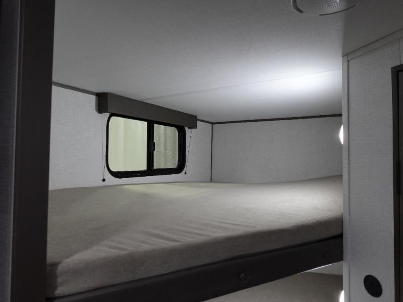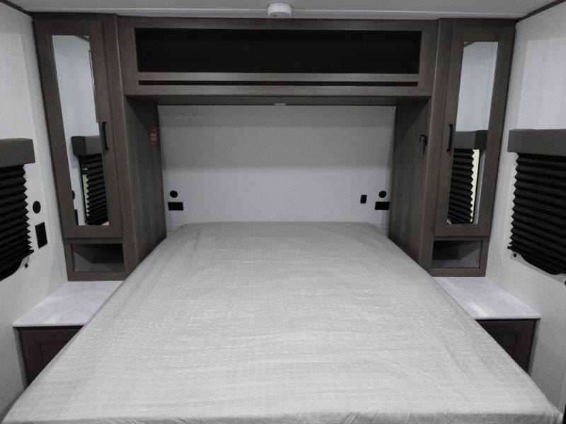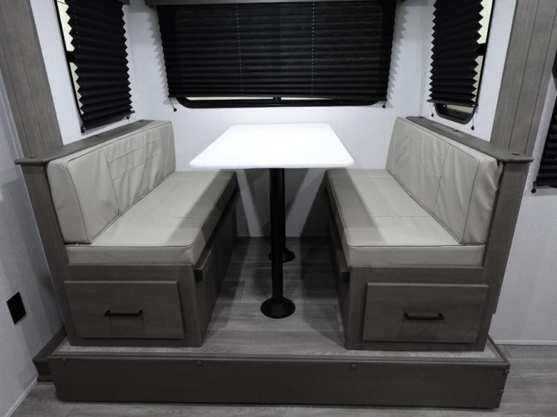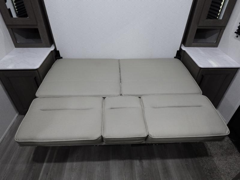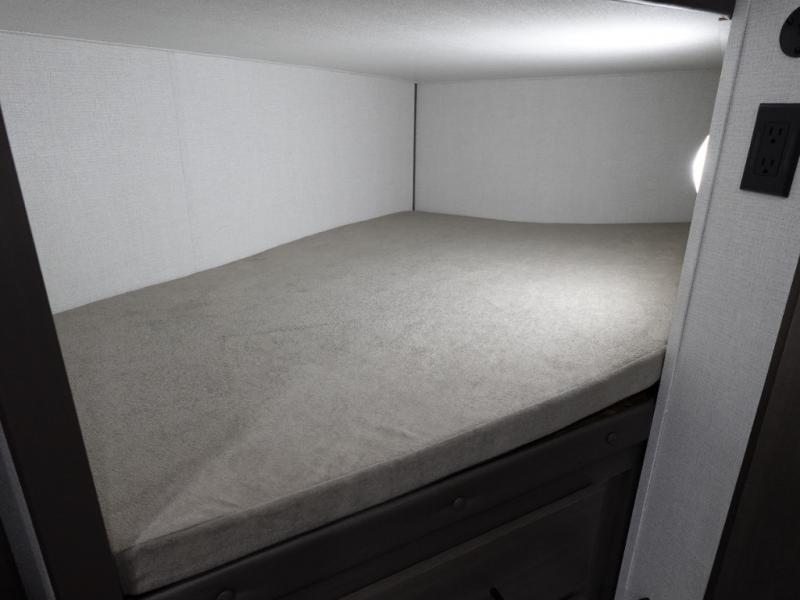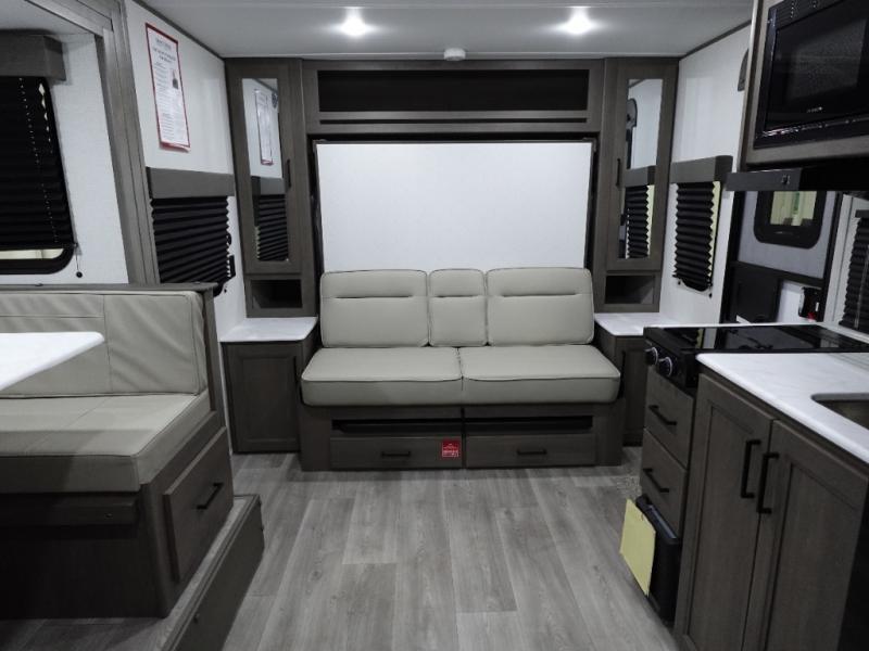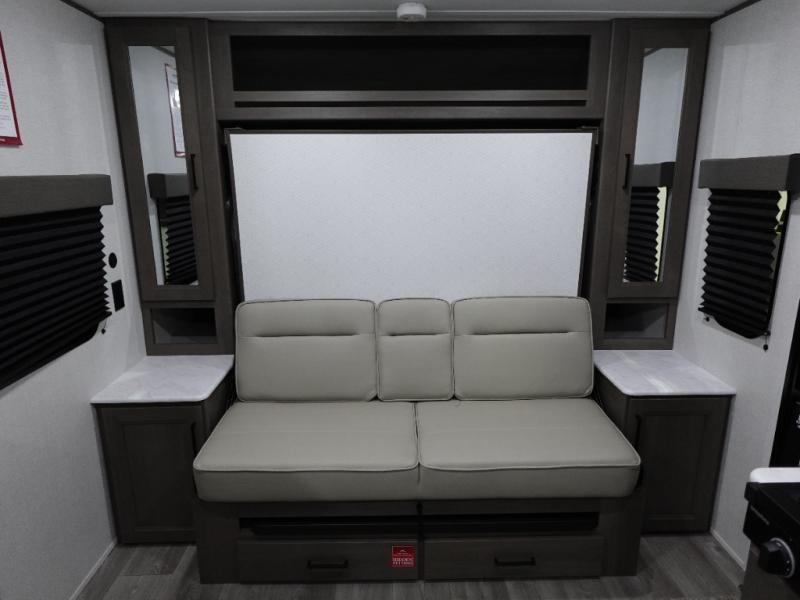 Spacious and versatile, this travel trailer is perfect for weekend trips to the campground or weeklong visits to the lake! There is a front Murphy bed with storage on both sides plus a pull-out pet drawer to keep your furry friends happy. Your guests or little ones will love the double-size bunks with privacy curtains, and the full bath is right next to the bunks for easy nighttime use. Once you make breakfast on the two burner range, you can dine at the booth dinette slide. And this model also includes an outdoor griddle and refrigerator if you want to make breakfast outdoors. Additional exterior features include a 16' power awning, an interior/exterior table, and a pass-thru storage for larger camp gear.