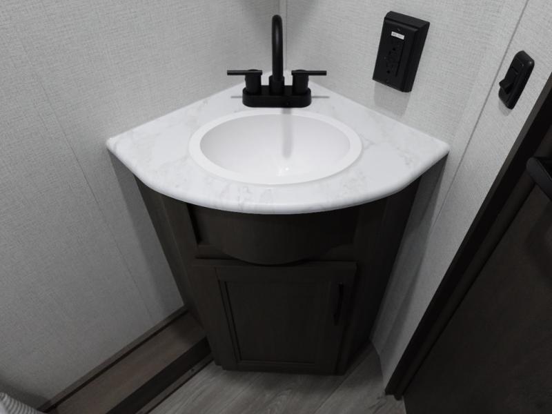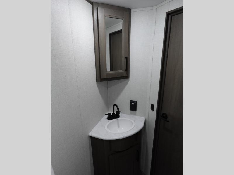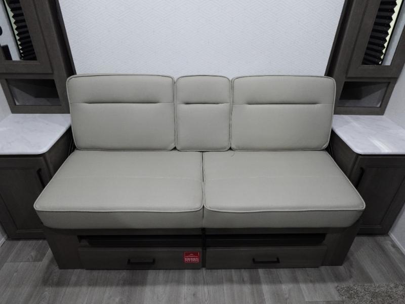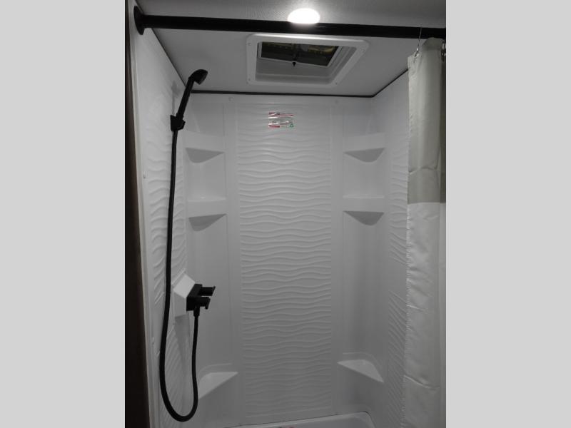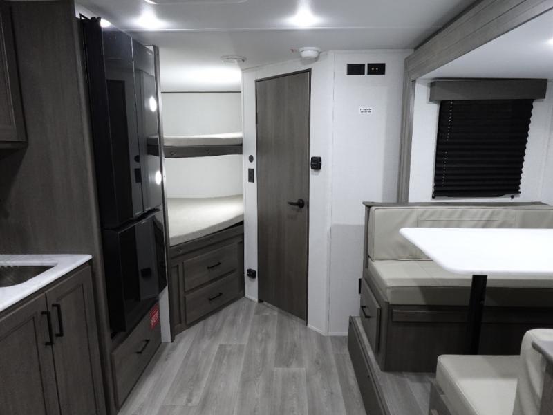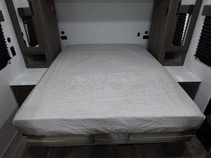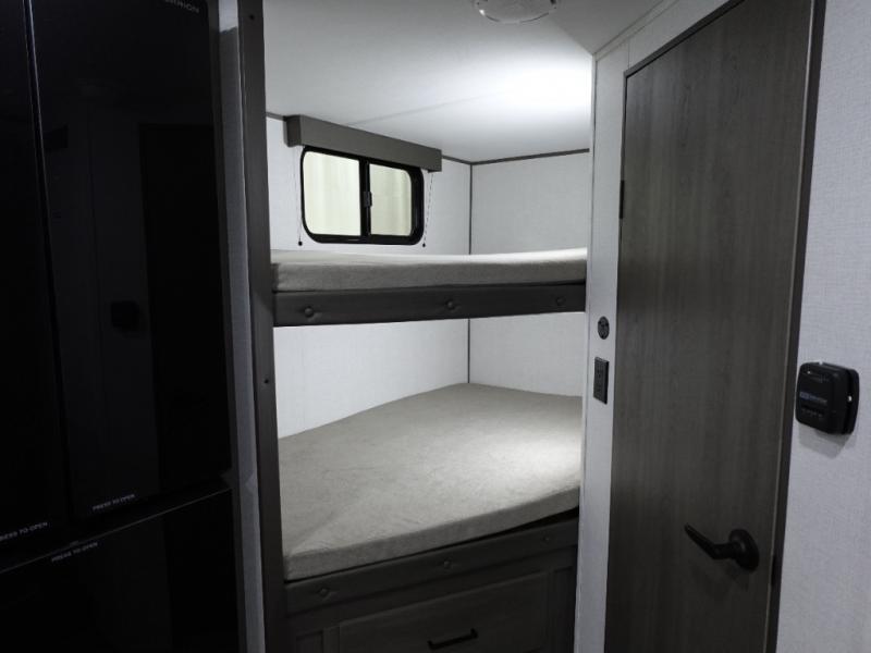 Spacious and versatile, this travel trailer is perfect for weekend trips to the campground or weeklong visits to the lake! There is a front Murphy bed with storage on both sides plus a pull-out pet drawer to keep your furry friends happy. Your guests or little ones will love the double-size bunks with privacy curtains, and the full bath is right next to the bunks for easy nighttime use. Once you make breakfast on the two burner range, you can dine at the booth dinette slide. And this model also includes an outdoor griddle and refrigerator if you want to make breakfast outdoors. Additional exterior features include a 16' power awning, an interior/exterior table, and a pass-thru storage for larger camp gear.