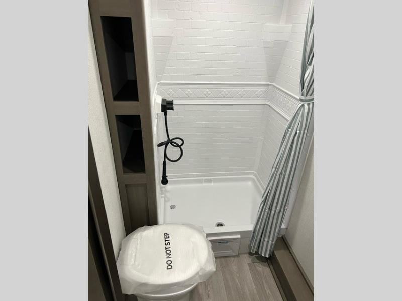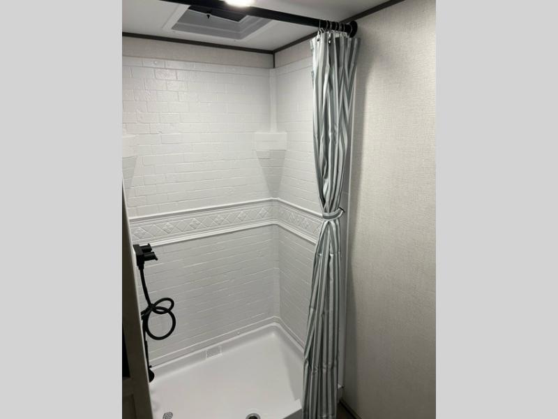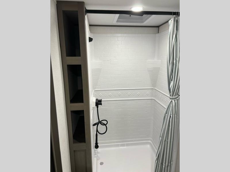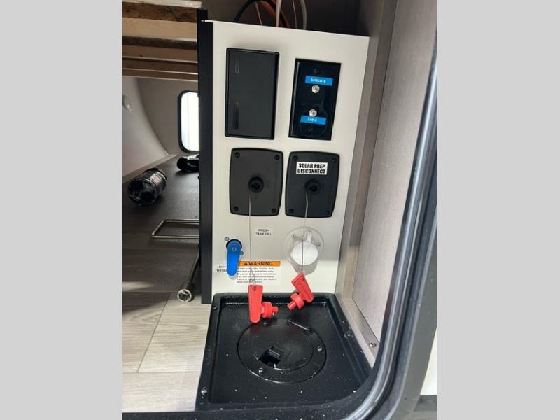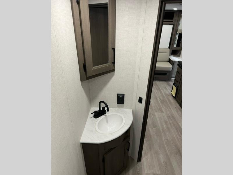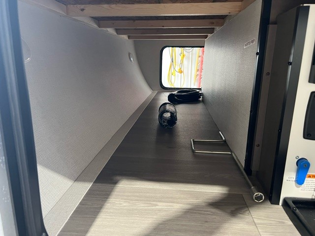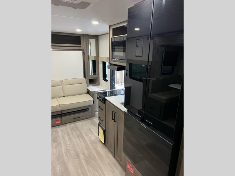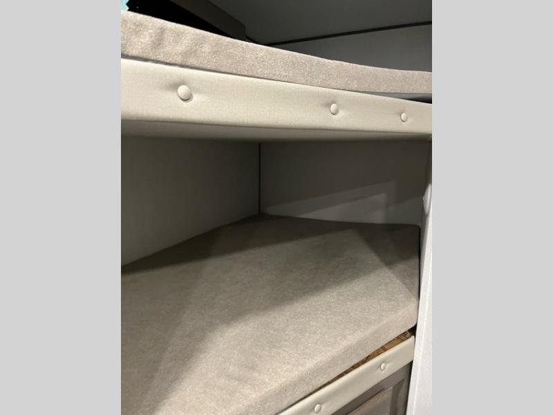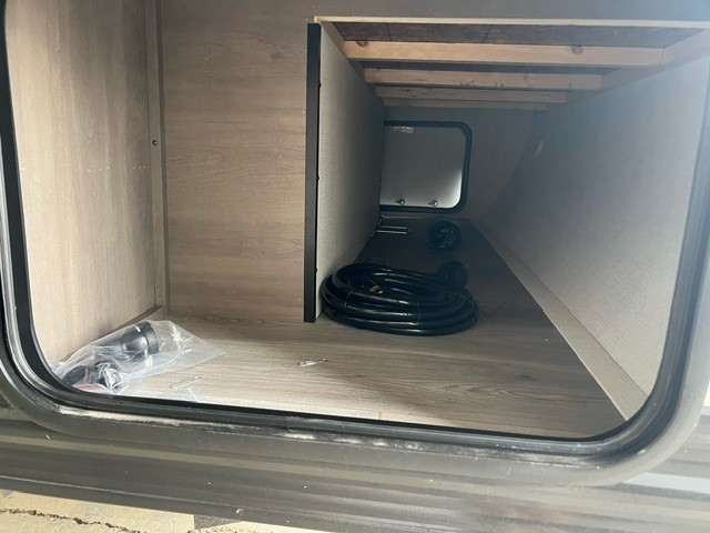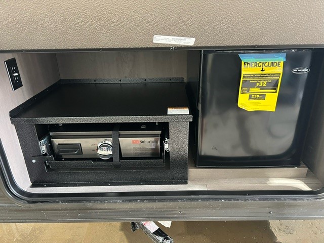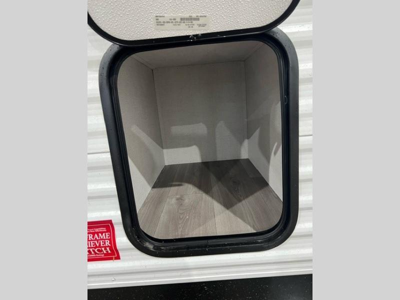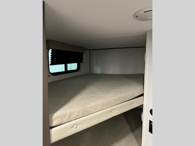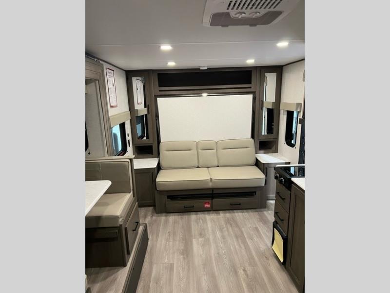 Spacious and versatile, this travel trailer is perfect for weekend trips to the campground or weeklong visits to the lake! There is a front Murphy bed with storage on both sides plus a pull-out pet drawer to keep your furry friends happy. Your guests or little ones will love the double-size bunks with privacy curtains, and the full bath is right next to the bunks for easy nighttime use. Once you make breakfast on the two burner range, you can dine at the booth dinette slide. And this model also includes an outdoor griddle and refrigerator if you want to make breakfast outdoors. Additional exterior features include a 16' power awning, an interior/exterior table, and a pass-thru storage for larger camp gear.