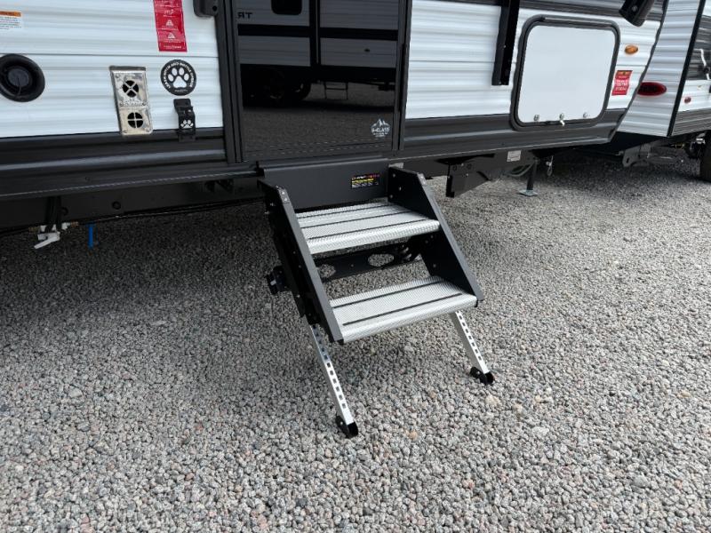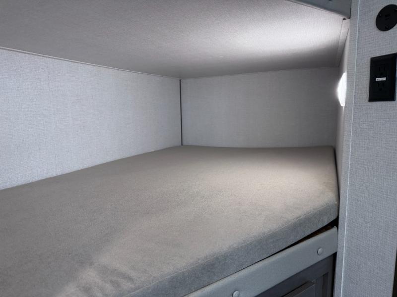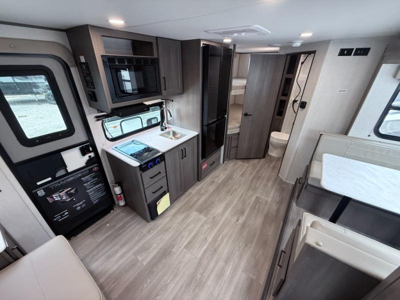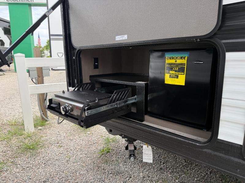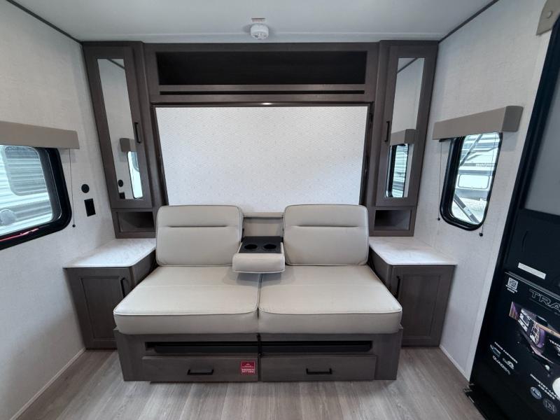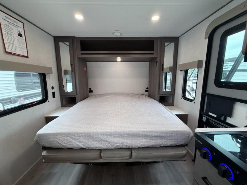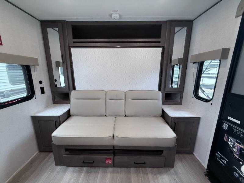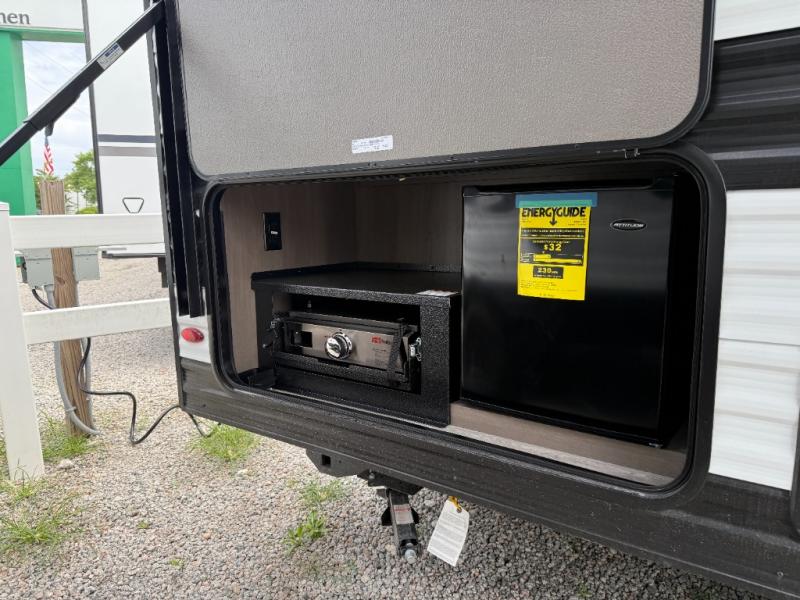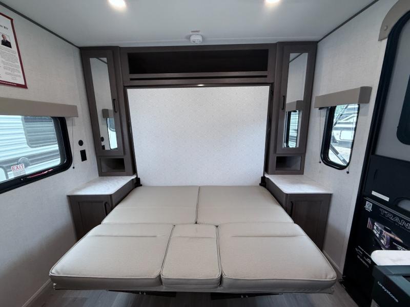 Spacious and versatile, this travel trailer is perfect for weekend trips to the campground or weeklong visits to the lake! There is a front Murphy bed with storage on both sides plus a pull-out pet drawer to keep your furry friends happy. Your guests or little ones will love the double-size bunks with privacy curtains, and the full bath is right next to the bunks for easy nighttime use. Once you make breakfast on the two burner range, you can dine at the booth dinette slide. And this model also includes an outdoor griddle and refrigerator if you want to make breakfast outdoors. Additional exterior features include a 16' power awning, an interior/exterior table, and a pass-thru storage for larger camp gear.