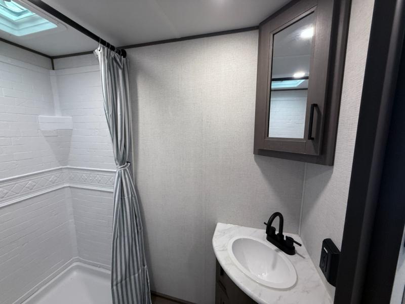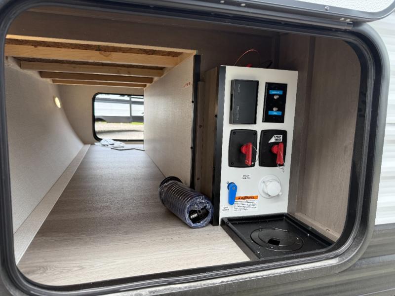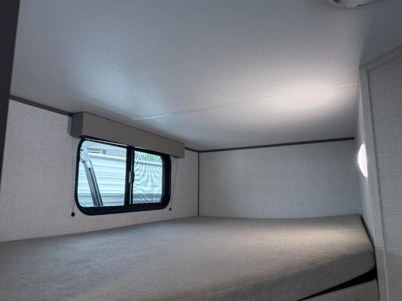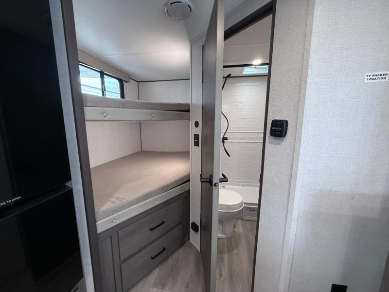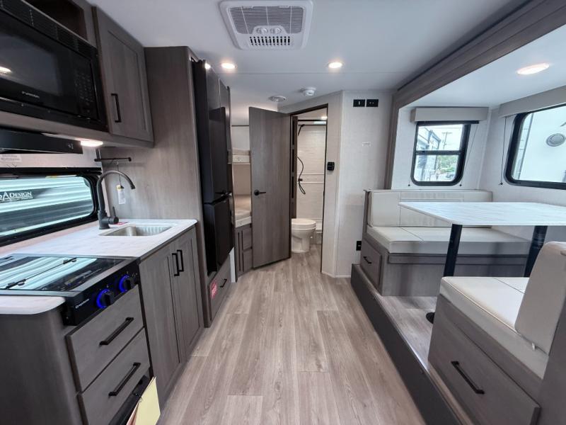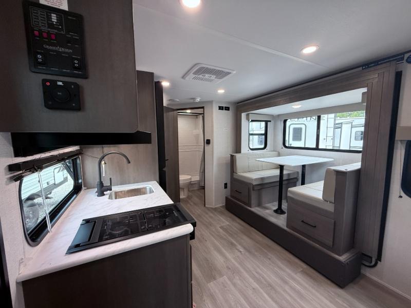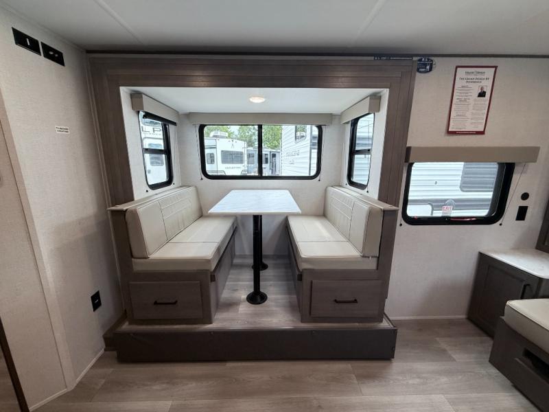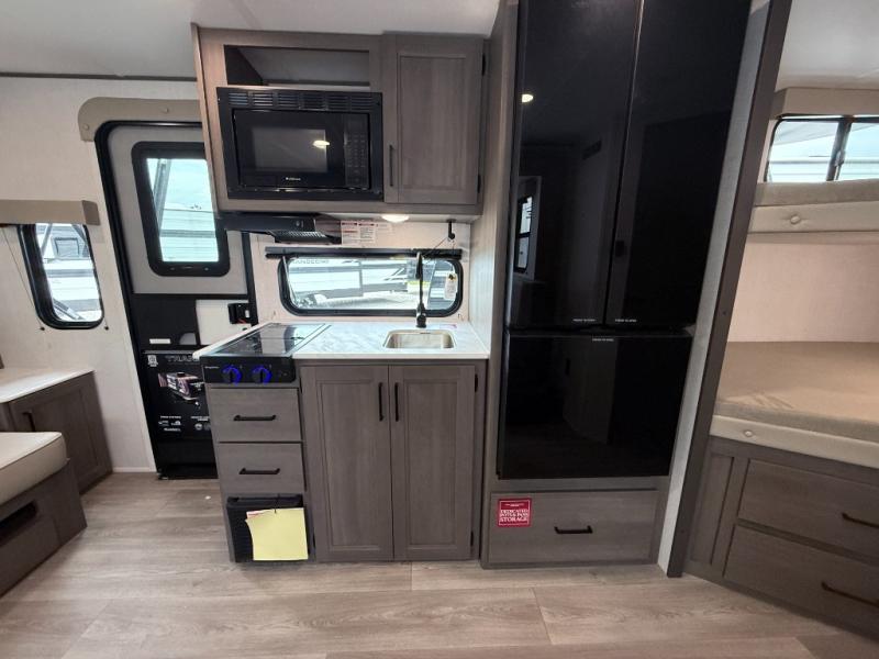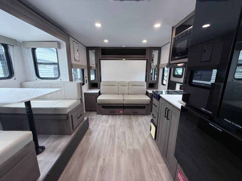 Spacious and versatile, this travel trailer is perfect for weekend trips to the campground or weeklong visits to the lake! There is a front Murphy bed with storage on both sides plus a pull-out pet drawer to keep your furry friends happy. Your guests or little ones will love the double-size bunks with privacy curtains, and the full bath is right next to the bunks for easy nighttime use. Once you make breakfast on the two burner range, you can dine at the booth dinette slide. And this model also includes an outdoor griddle and refrigerator if you want to make breakfast outdoors. Additional exterior features include a 16' power awning, an interior/exterior table, and a pass-thru storage for larger camp gear.