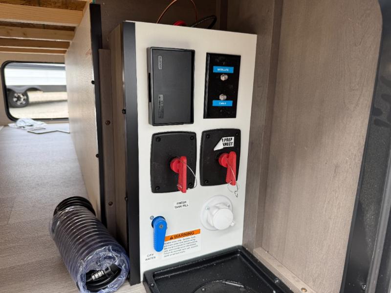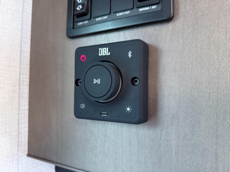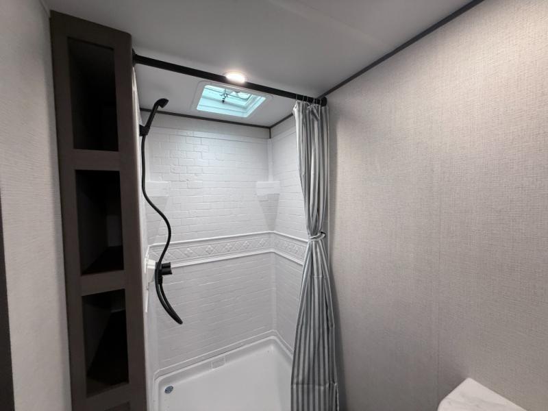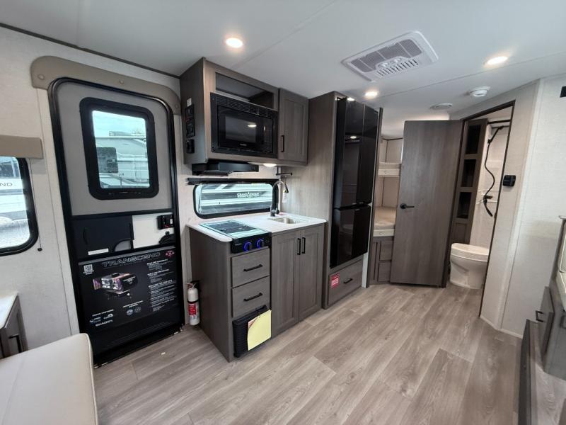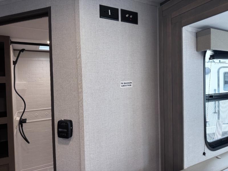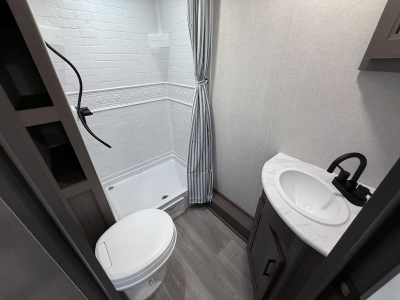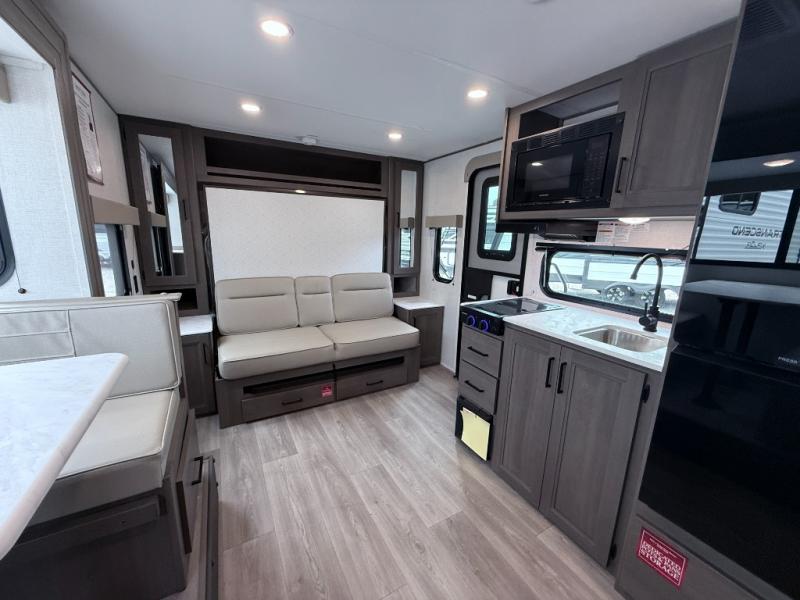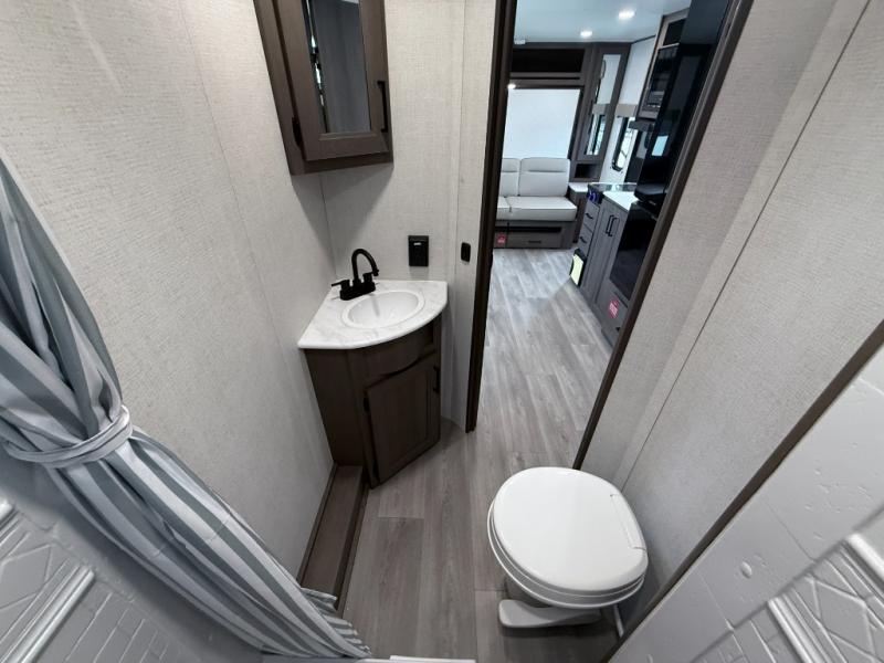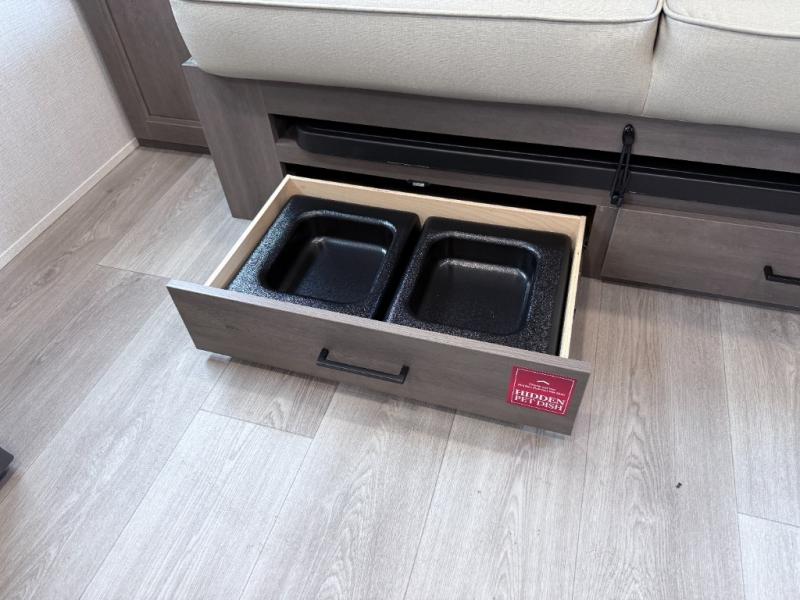 Spacious and versatile, this travel trailer is perfect for weekend trips to the campground or weeklong visits to the lake! There is a front Murphy bed with storage on both sides plus a pull-out pet drawer to keep your furry friends happy. Your guests or little ones will love the double-size bunks with privacy curtains, and the full bath is right next to the bunks for easy nighttime use. Once you make breakfast on the two burner range, you can dine at the booth dinette slide. And this model also includes an outdoor griddle and refrigerator if you want to make breakfast outdoors. Additional exterior features include a 16' power awning, an interior/exterior table, and a pass-thru storage for larger camp gear.