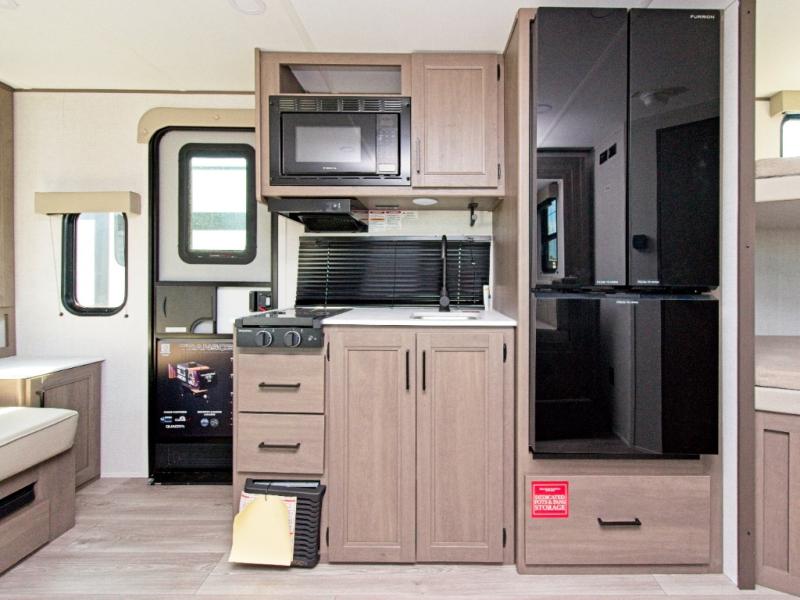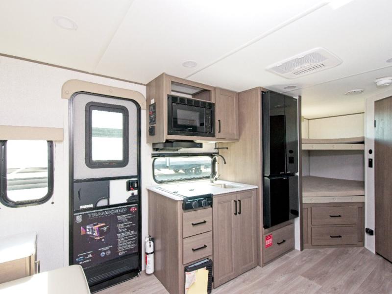 The Grand Design Transcend One 161BH offers double-size bunks for family comfort and an outdoor griddle with refrigerator for easy campsite cooking.