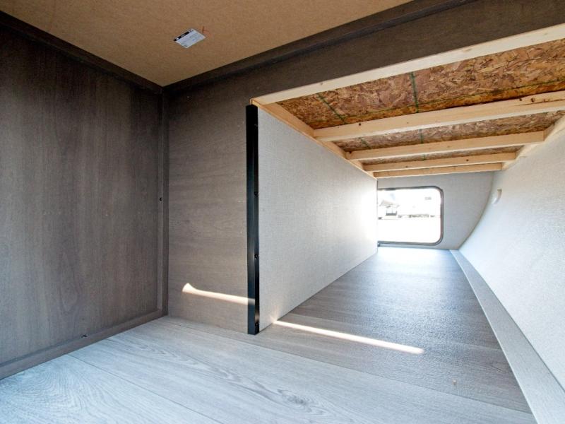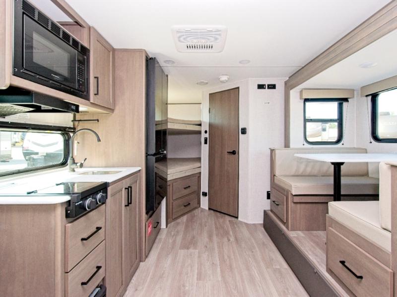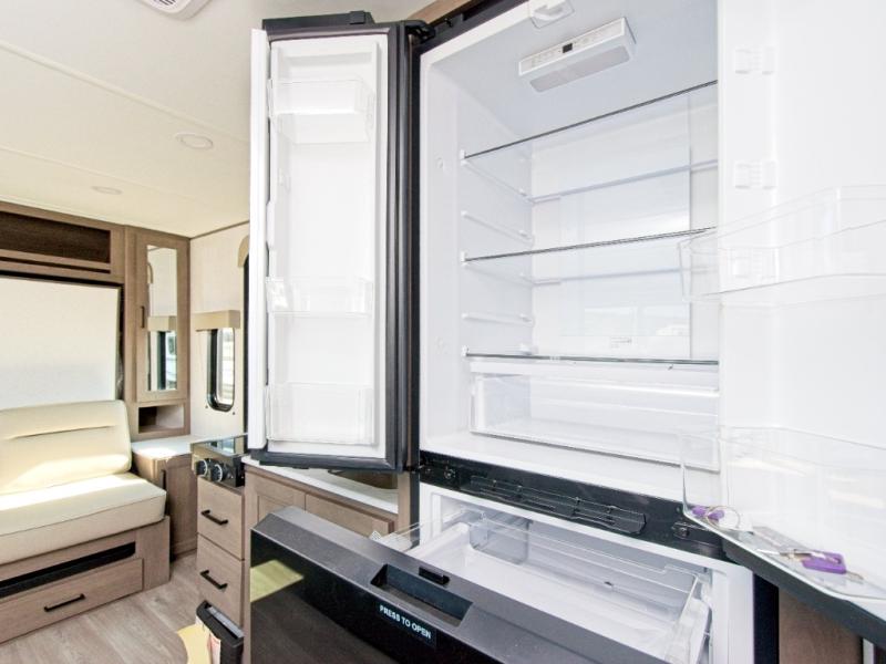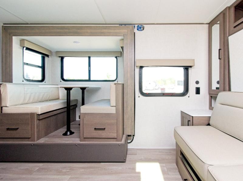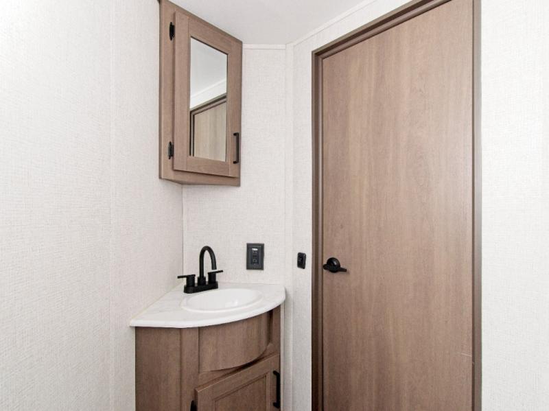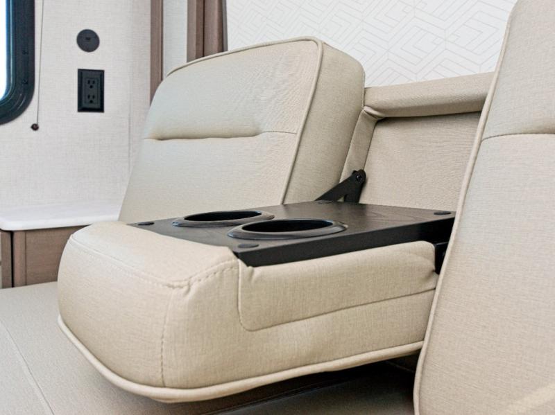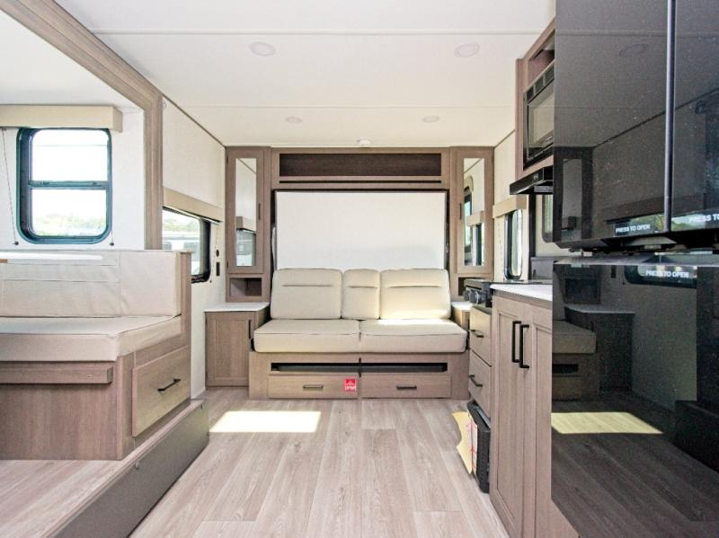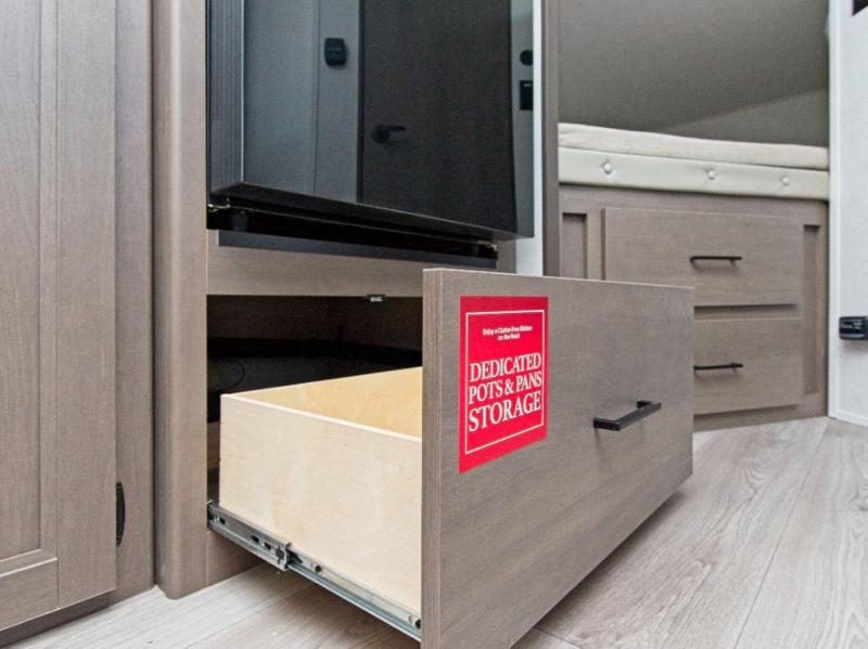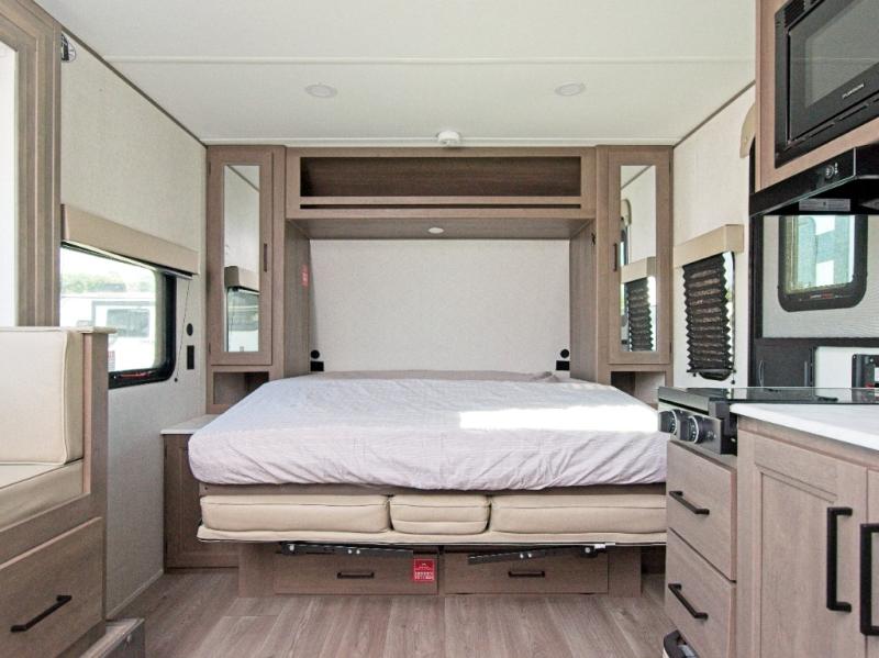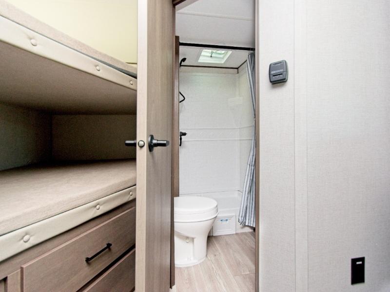 The front Murphy bed easily folds away to maximize living space during the day, and includes dual side storage and a pull-out pet drawer to keep your furry companions comfortable. The full bathroom, located next to the bunks, provides easy access for nighttime use and includes a spacious shower, sink, and foot-flush toilet.