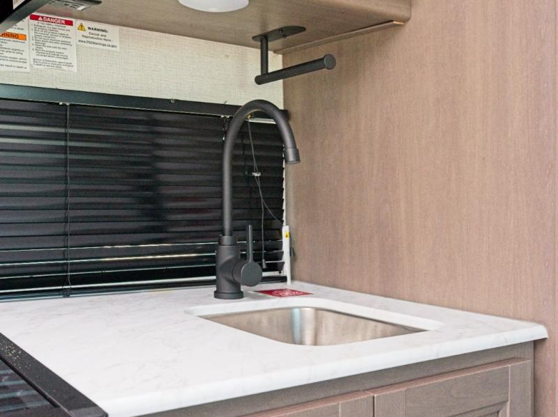 Inside, enjoy recessed lighting, residential countertops, and a 6'6" interior height for a spacious feel. The JBL sound system and Fusion light under the power awning add entertainment and ambiance to your outdoor experience.