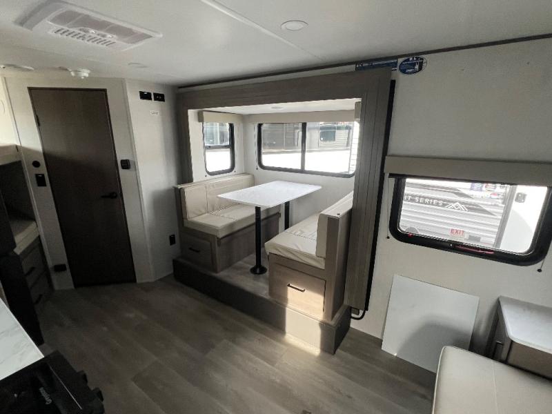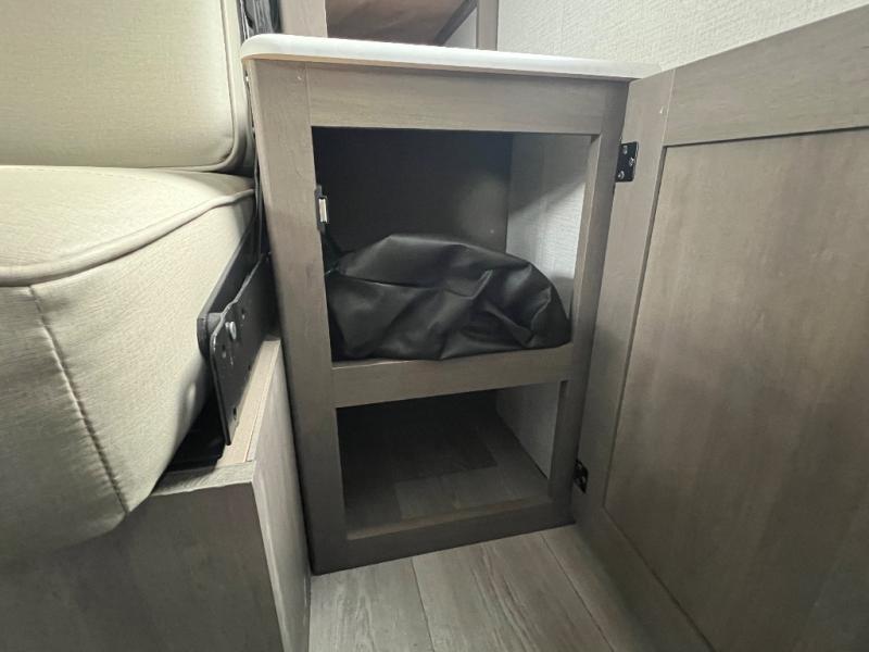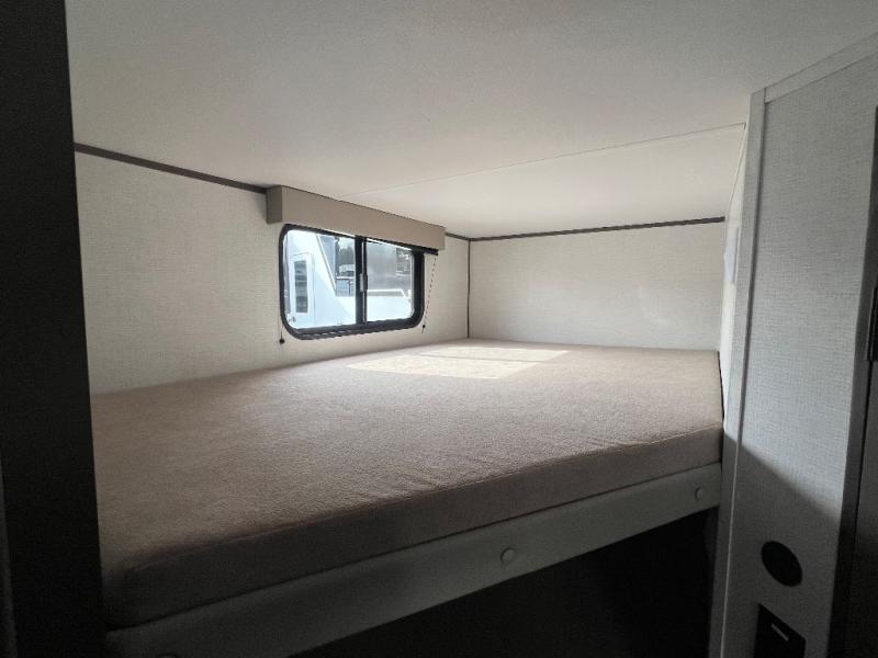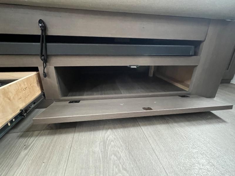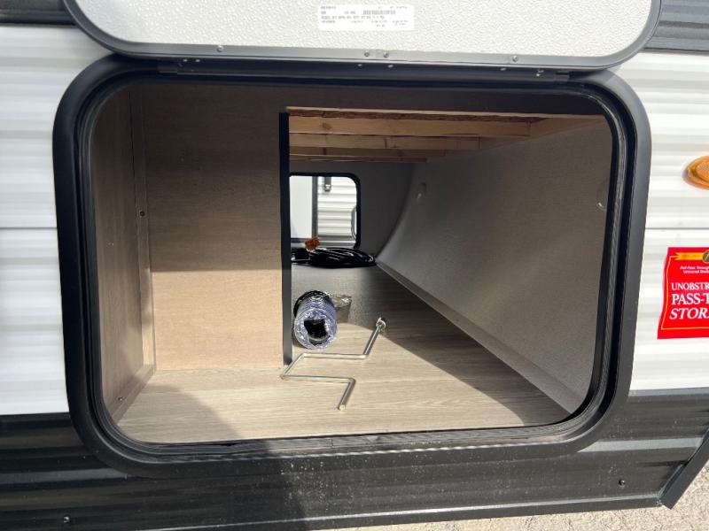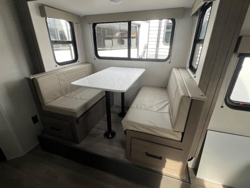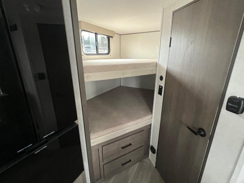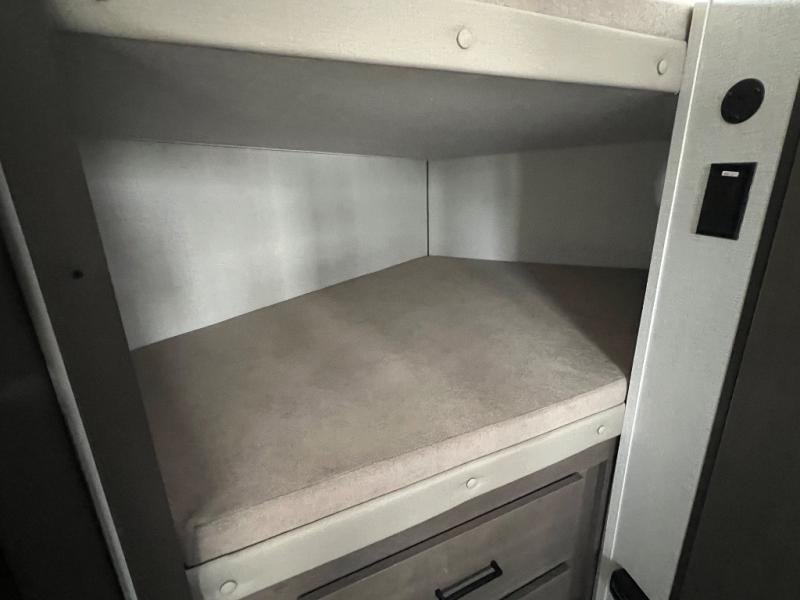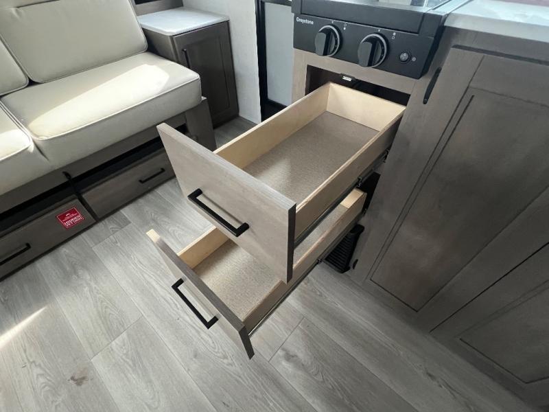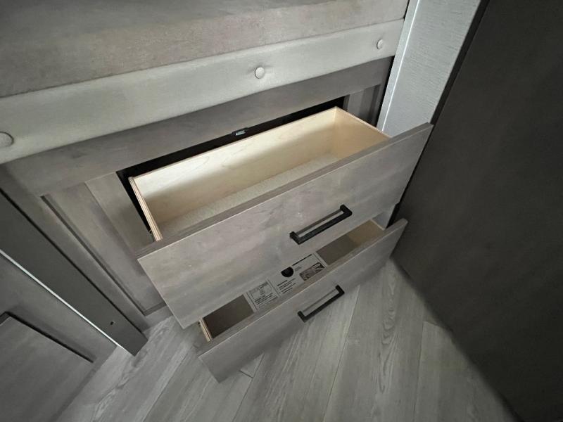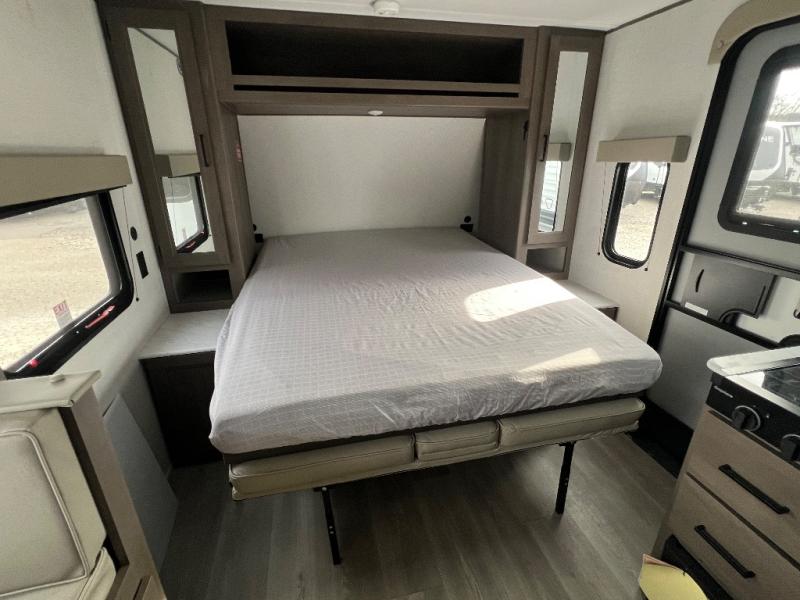 Spacious and versatile, this travel trailer is perfect for weekend trips to the campground or weeklong visits to the lake! There is a front Murphy bed with storage on both sides plus a pull-out pet drawer to keep your furry friends happy. Your guests or little ones will love the double-size bunks with privacy curtains, and the full bath is right next to the bunks for easy nighttime use. Once you make breakfast on the two burner range, you can dine at the booth dinette slide. And this model also includes an outdoor griddle and refrigerator if you want to make breakfast outdoors. Additional exterior features include a 16' power awning, an interior/exterior table, and a pass-thru storage for larger camp gear.