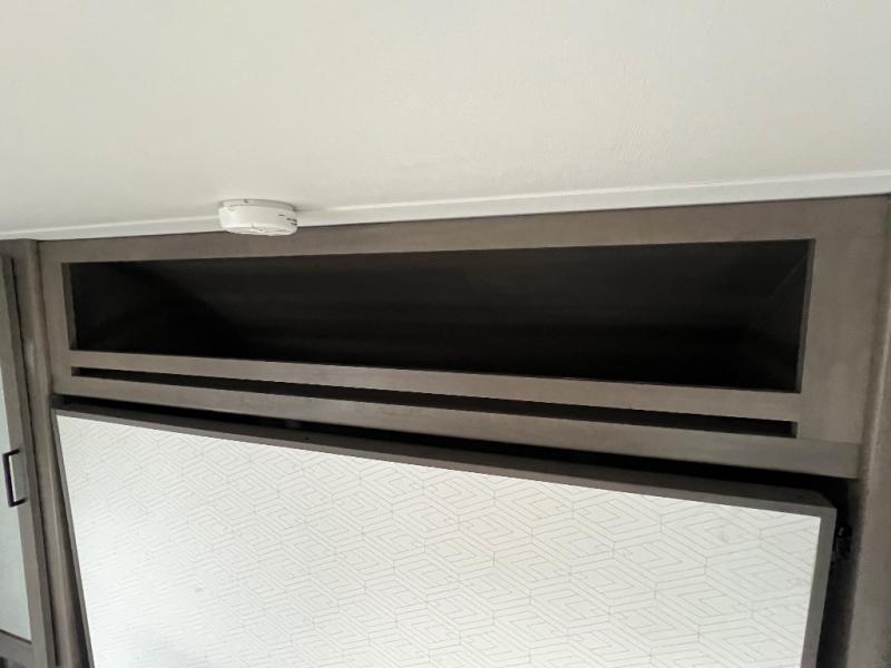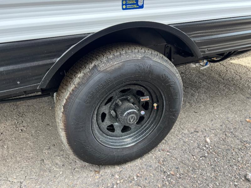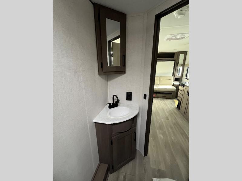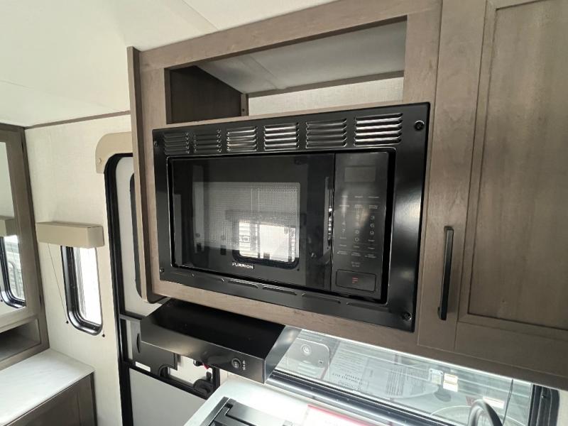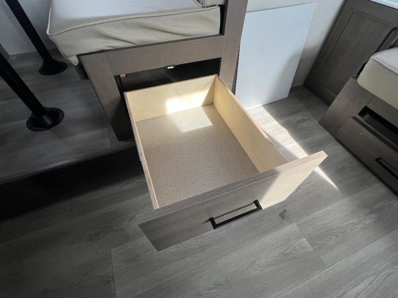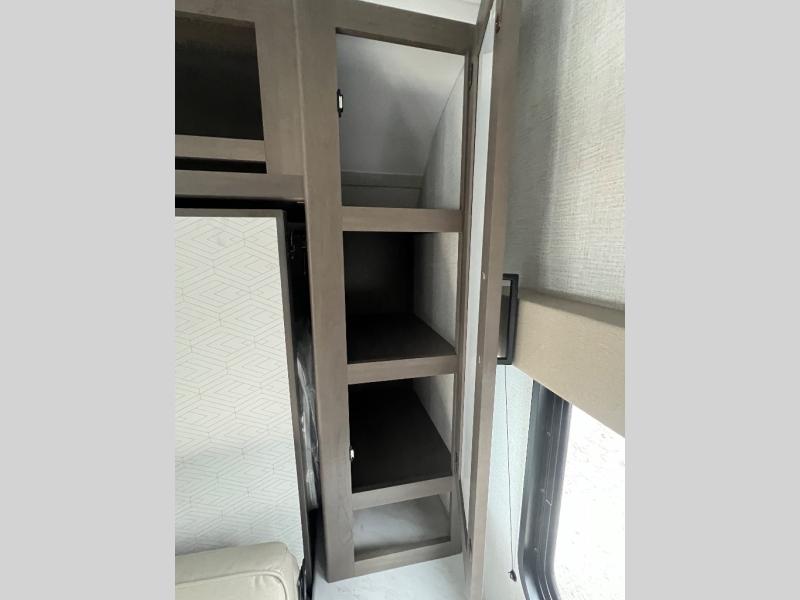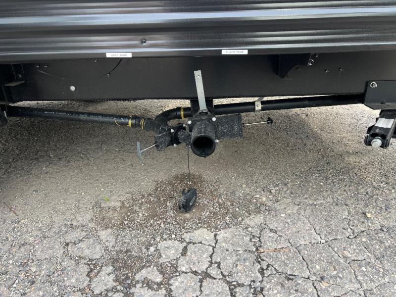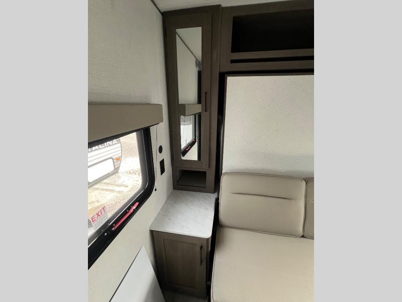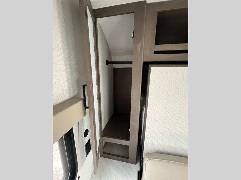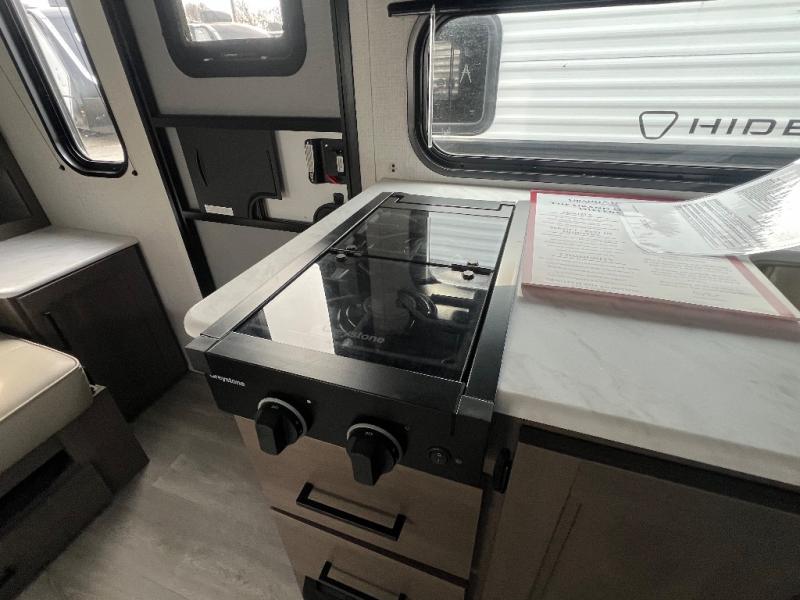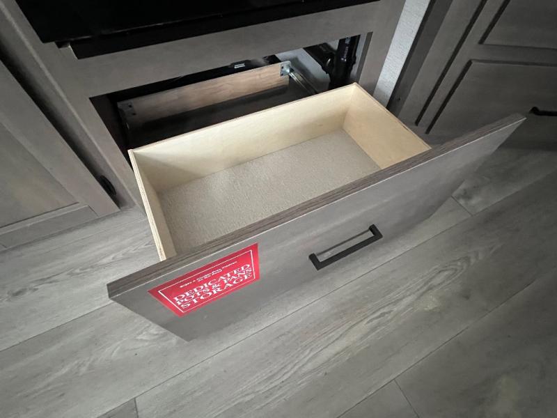Spacious and versatile, this travel trailer is perfect for weekend trips to the campground or weeklong visits to the lake! There is a front Murphy bed with storage on both sides plus a pull-out pet drawer to keep your furry friends happy. Your guests or little ones will love the double-size bunks with privacy curtains, and the full bath is right next to the bunks for easy nighttime use. Once you make breakfast on the two burner range, you can dine at the booth dinette slide. And this model also includes an outdoor griddle and refrigerator if you want to make breakfast outdoors. Additional exterior features include a 16' power awning, an interior/exterior table, and a pass-thru storage for larger camp gear.