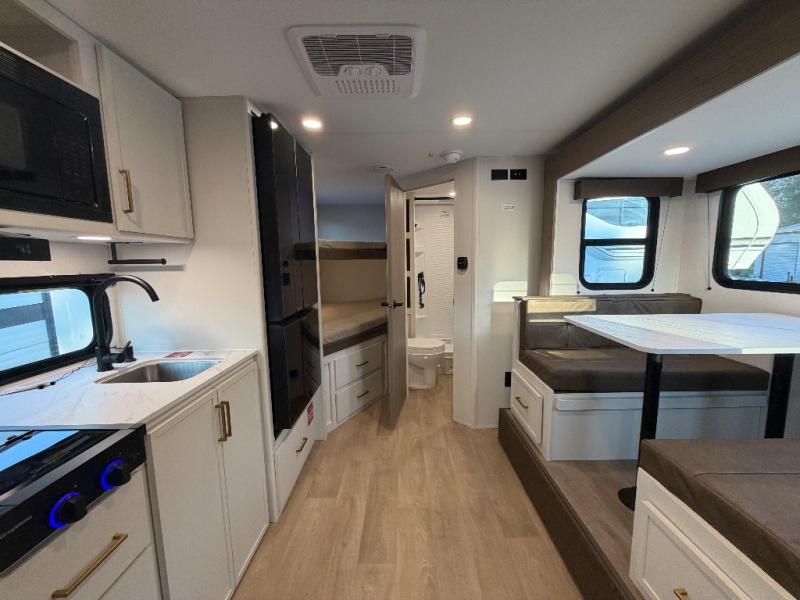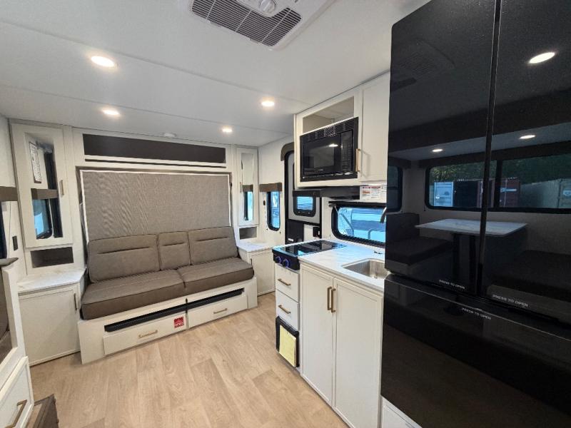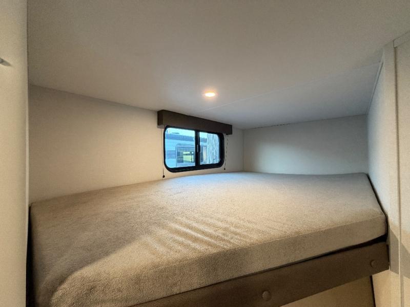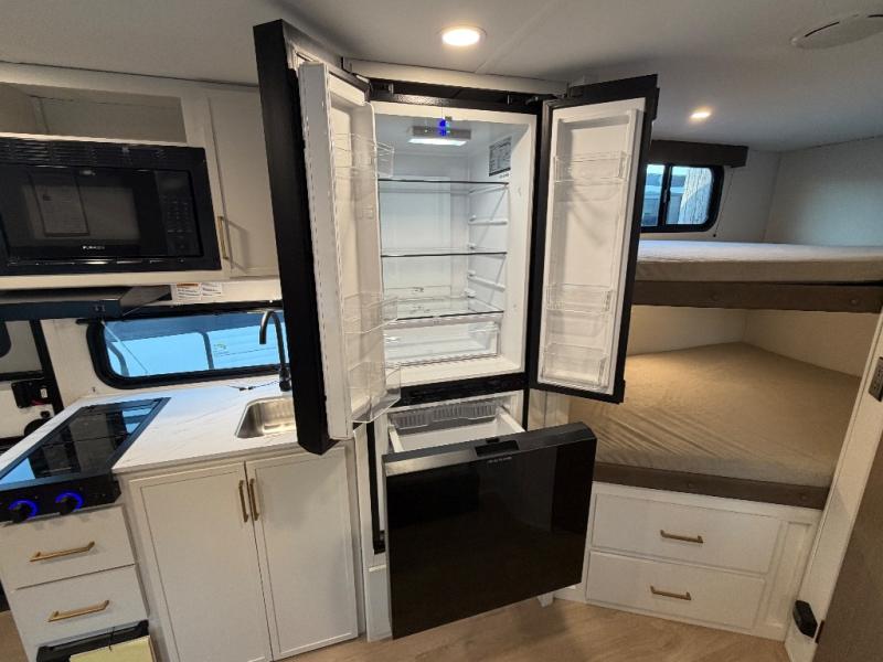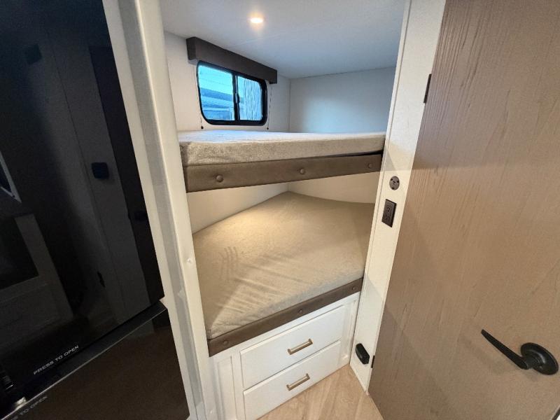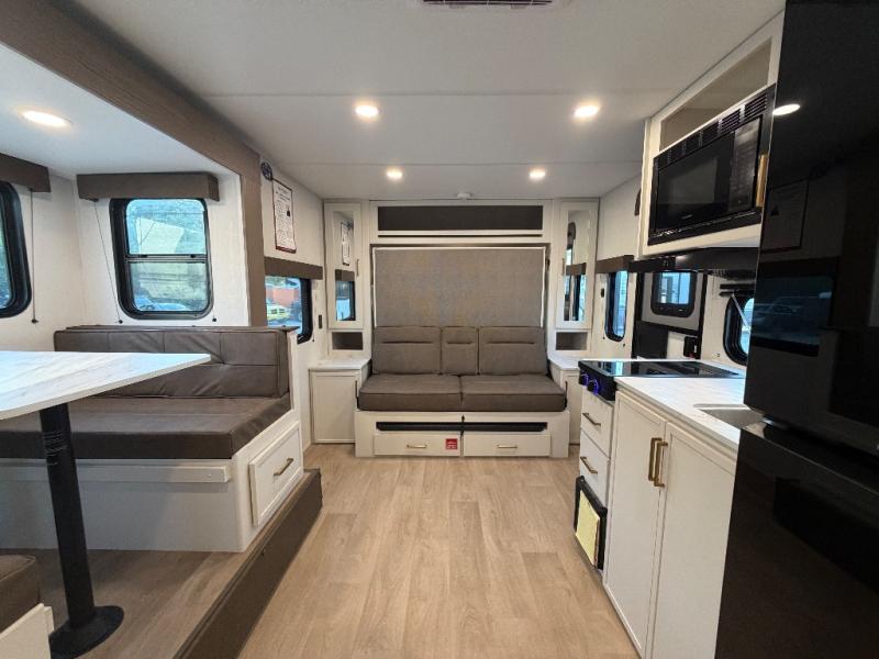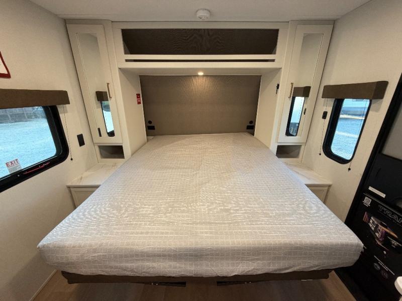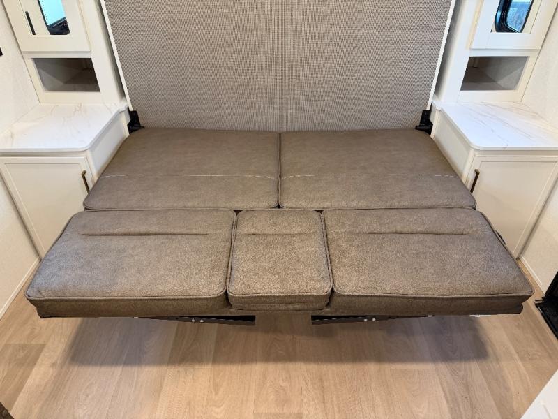 Spacious and versatile, the Transcend One 161BH is perfect for weekend getaways or weeklong escapes to the lake. The front Murphy bed transforms the living area with ease and includes storage on both sides, plus a pull-out pet drawer to keep your furry companions happy. Double-size bunks with privacy curtains give your guests or little ones a comfortable place to sleep, and the full bath directly beside the bunks makes nighttime routines simple.