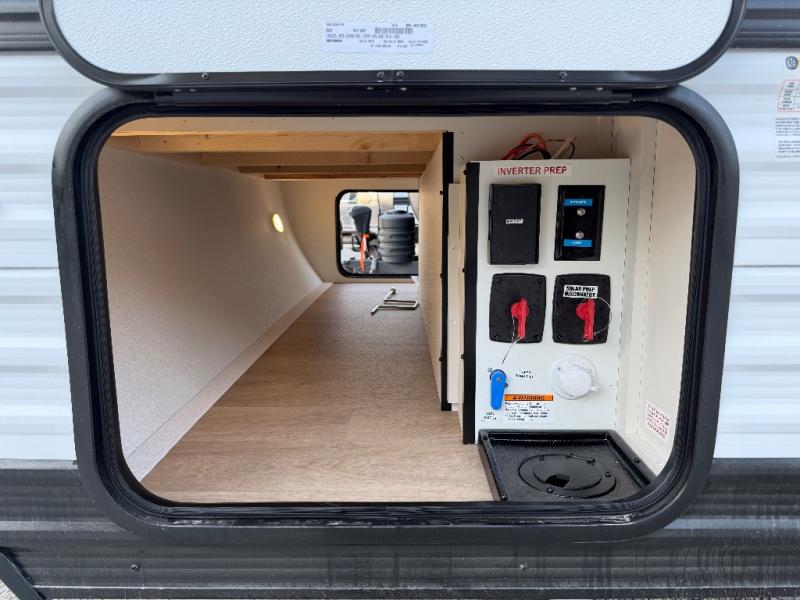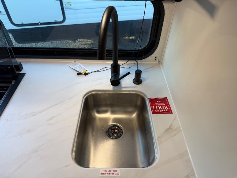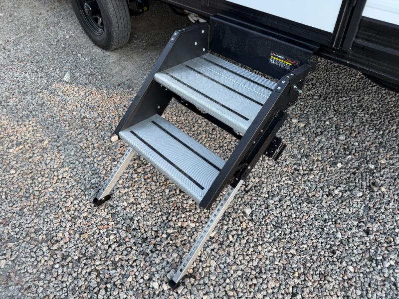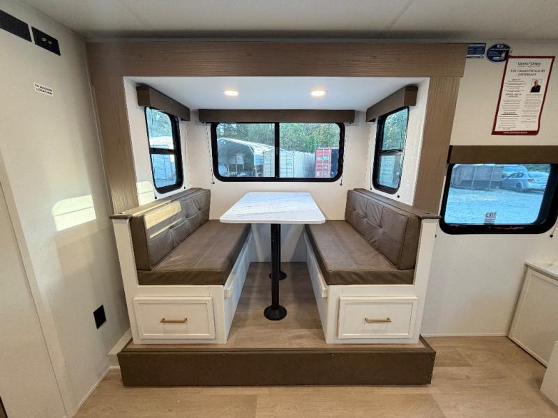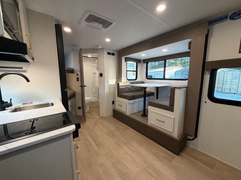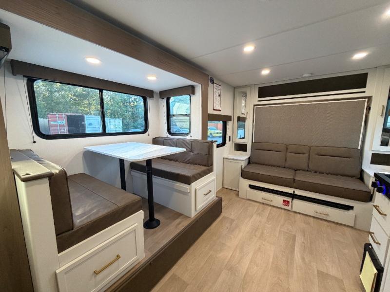 Prepare breakfast on the two-burner range and enjoy it at the booth dinette slide, or take your morning outdoors with the included exterior griddle and refrigerator. Additional exterior conveniences include a 16' power awning with lighting, an interior/exterior table, and an unobstructed pass-thru storage compartment big enough for chairs, totes, and larger camping gear.