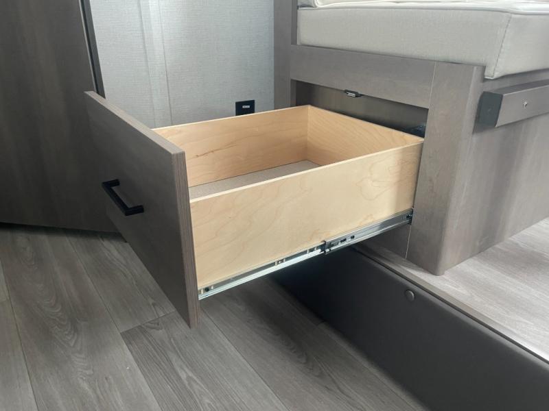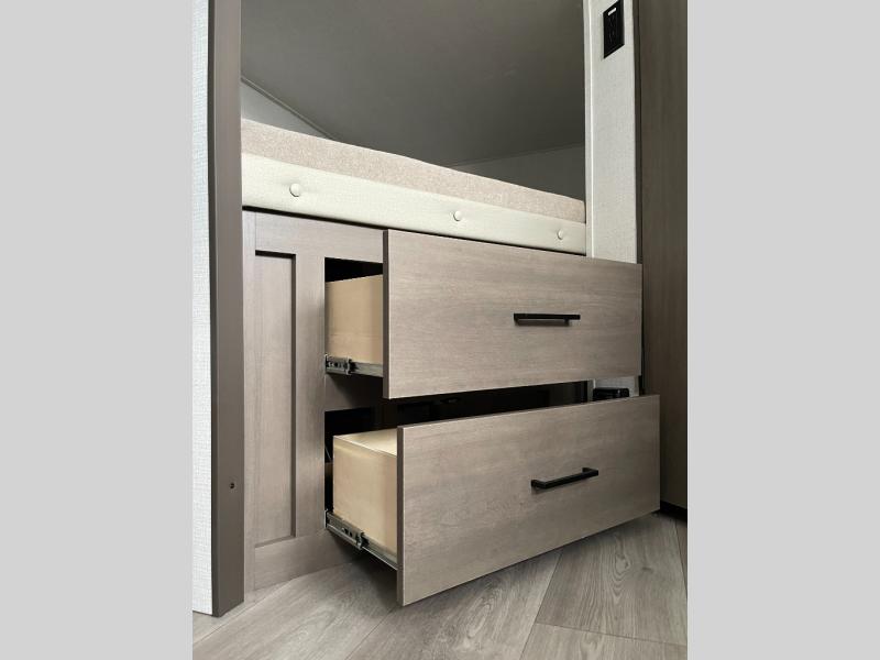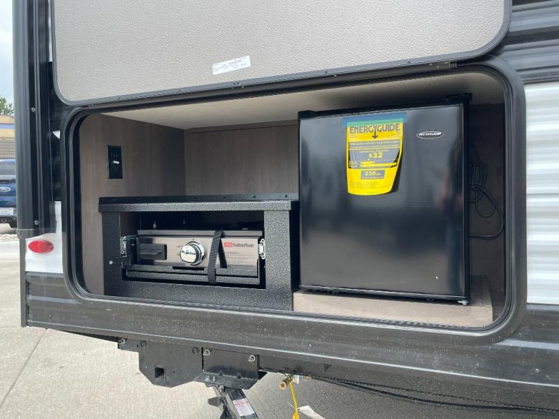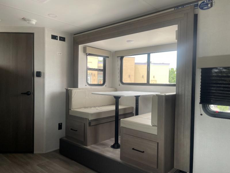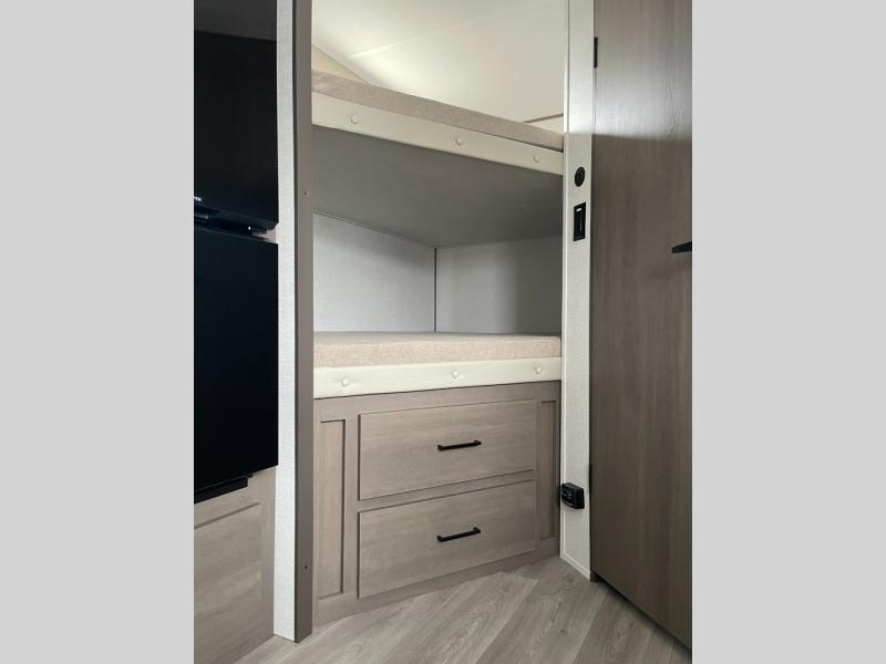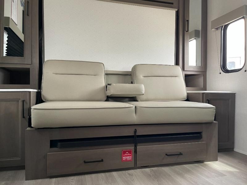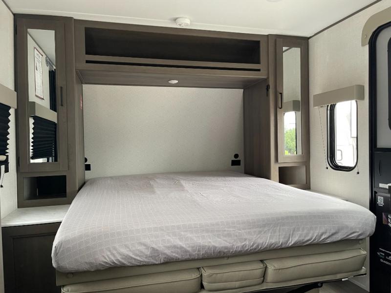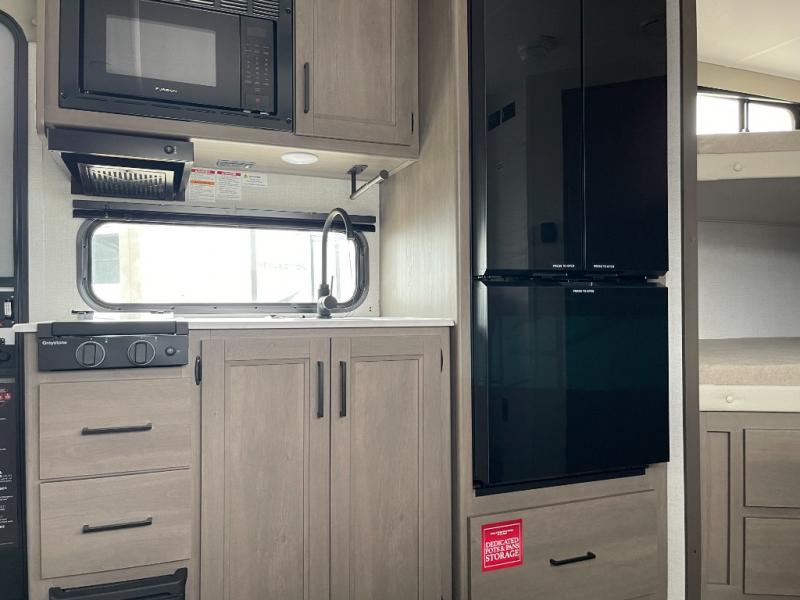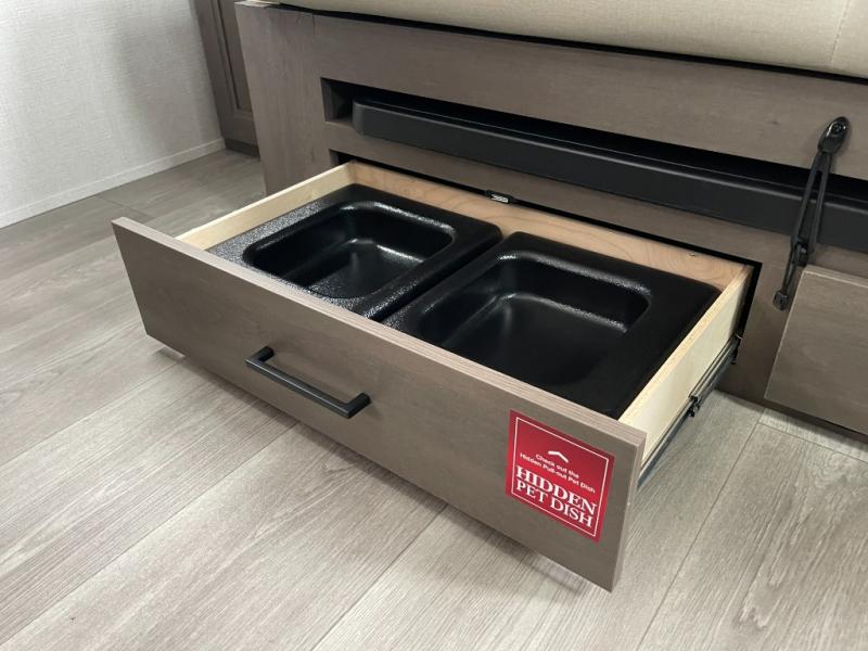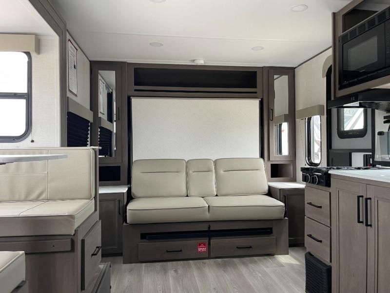 Spacious and versatile, this travel trailer is perfect for weekend trips to the campground or weeklong visits to the lake! There is a front Murphy bed with storage on both sides plus a pull-out pet drawer to keep your furry friends happy. Your guests or little ones will love the double-size bunks with privacy curtains, and the full bath is right next to the bunks for easy nighttime use. Once you make breakfast on the two burner range, you can dine at the booth dinette slide. And this model also includes an outdoor griddle and refrigerator if you want to make breakfast outdoors. Additional exterior features include a 16' power awning, an interior/exterior table, and a pass-thru storage for larger camp gear.
