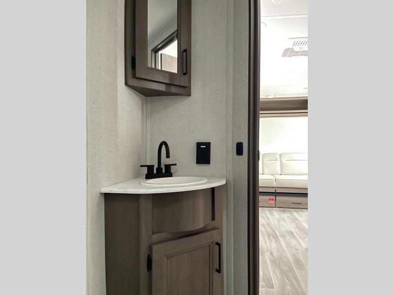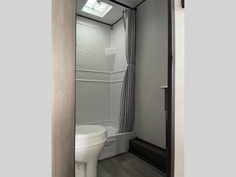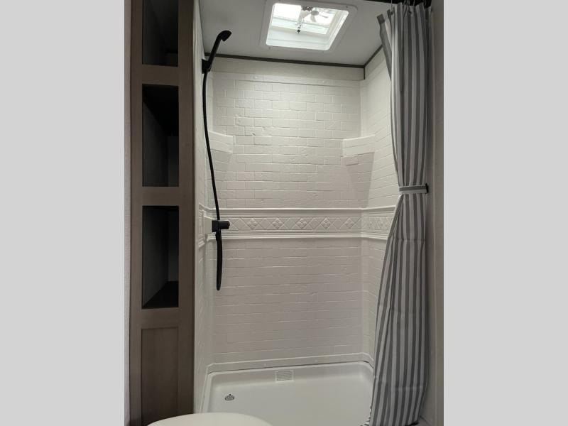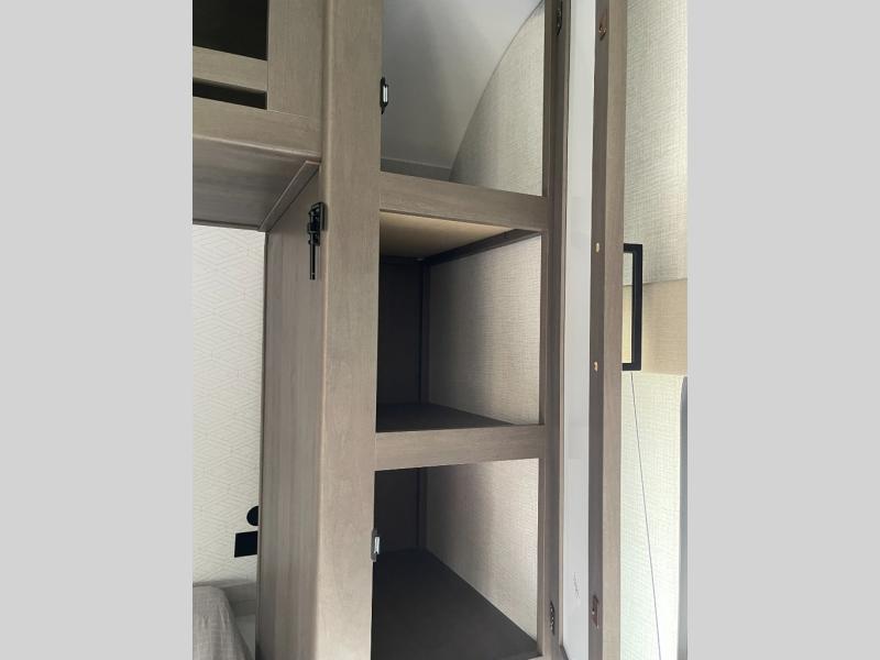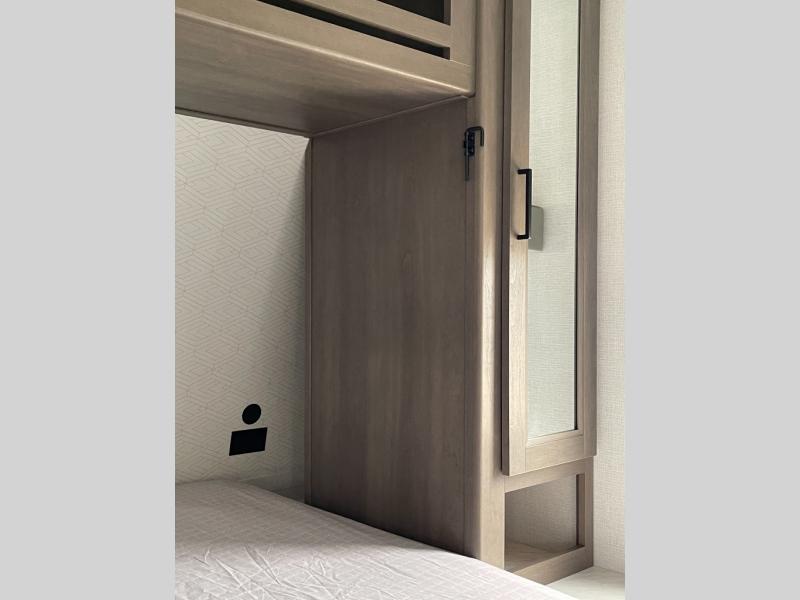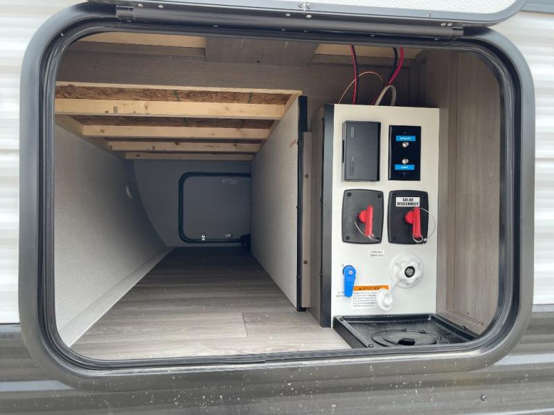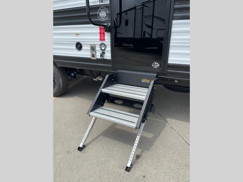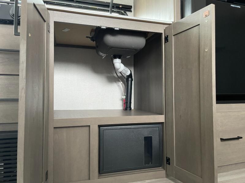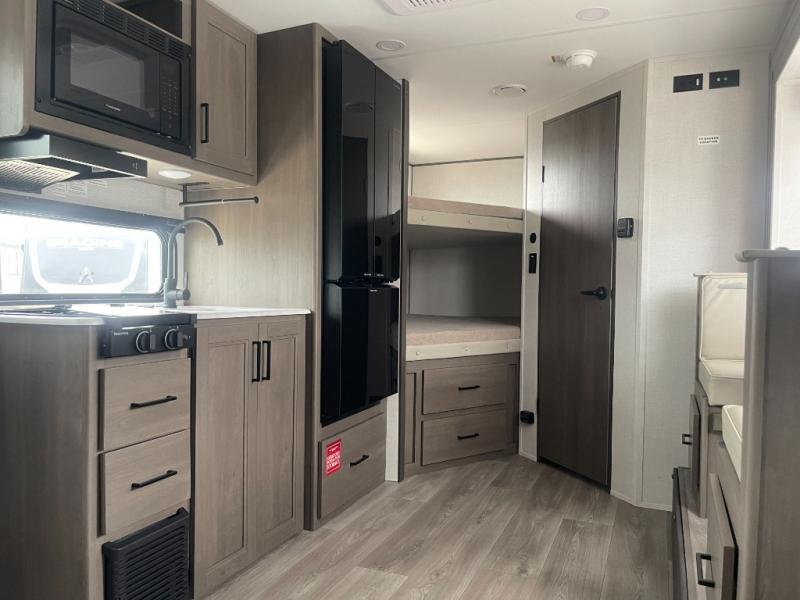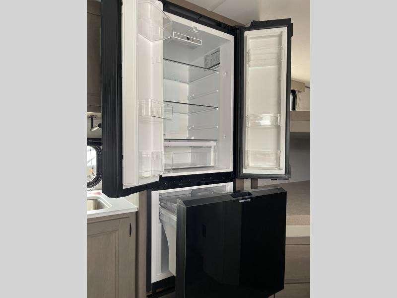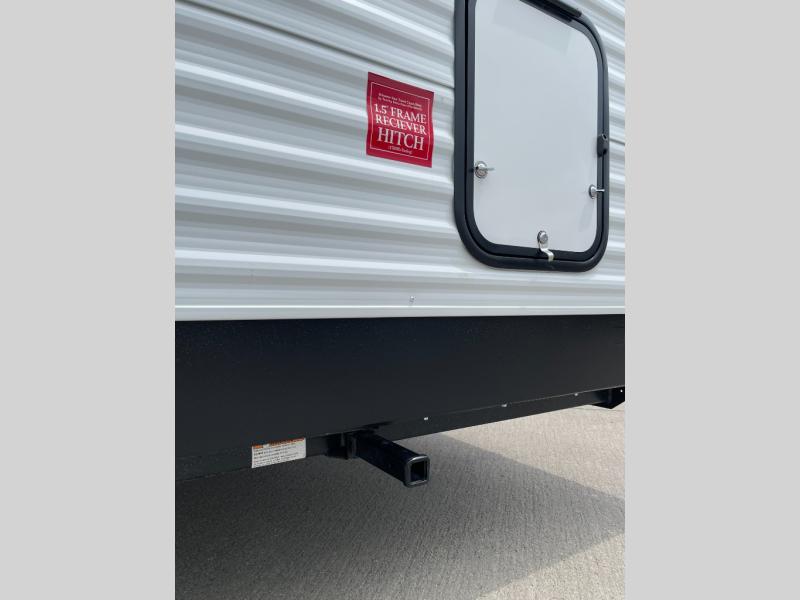 Spacious and versatile, this travel trailer is perfect for weekend trips to the campground or weeklong visits to the lake! There is a front Murphy bed with storage on both sides plus a pull-out pet drawer to keep your furry friends happy. Your guests or little ones will love the double-size bunks with privacy curtains, and the full bath is right next to the bunks for easy nighttime use. Once you make breakfast on the two burner range, you can dine at the booth dinette slide. And this model also includes an outdoor griddle and refrigerator if you want to make breakfast outdoors. Additional exterior features include a 16' power awning, an interior/exterior table, and a pass-thru storage for larger camp gear.