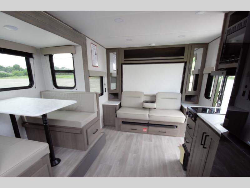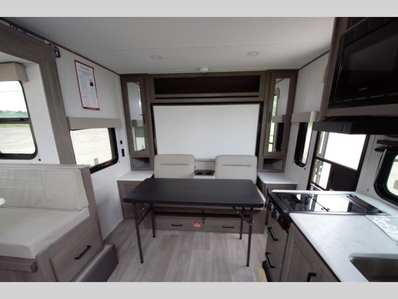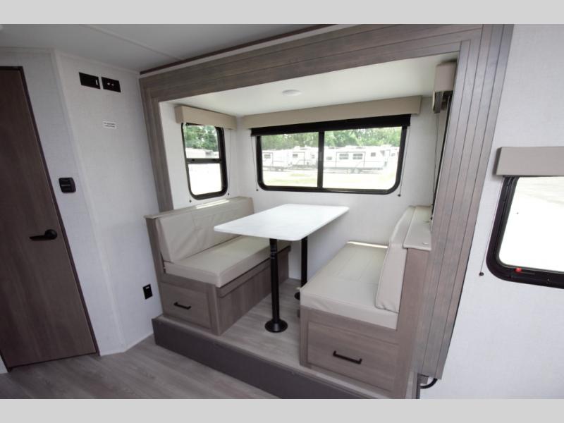 Booth Dinette Slide: Dine, play games, or work remotely at the comfy dinette, then easily convert it into an extra sleeping space if needed.
