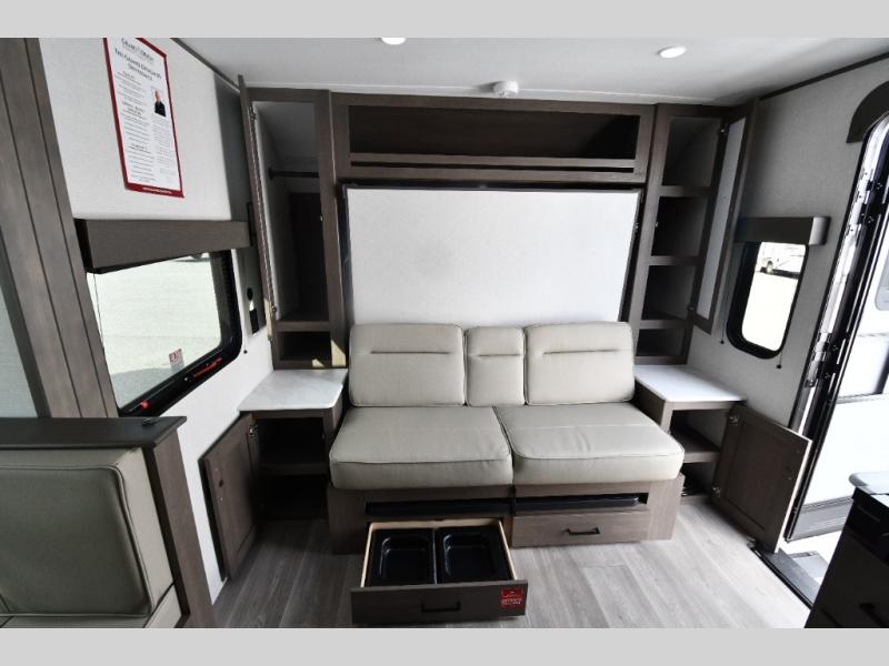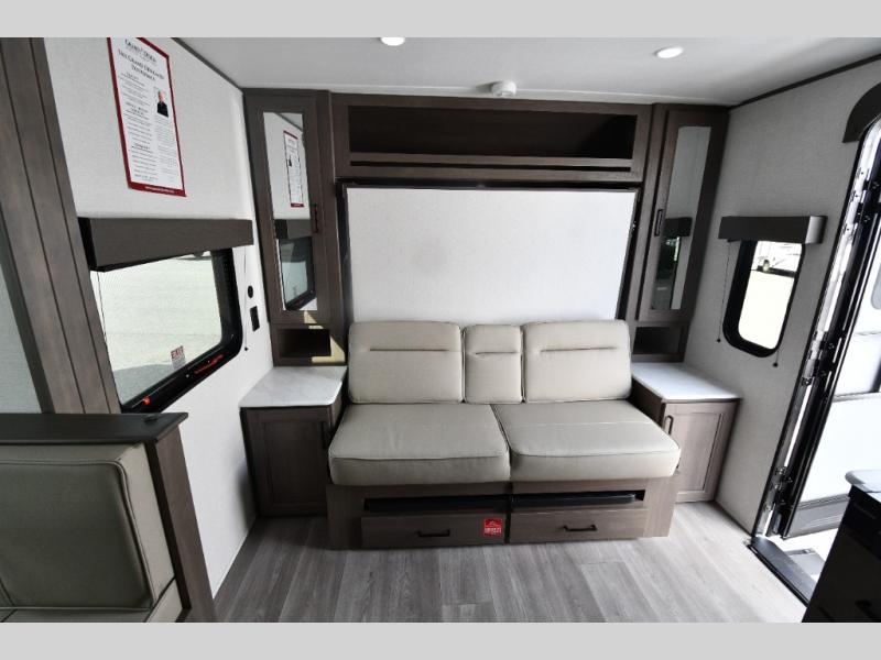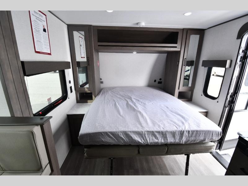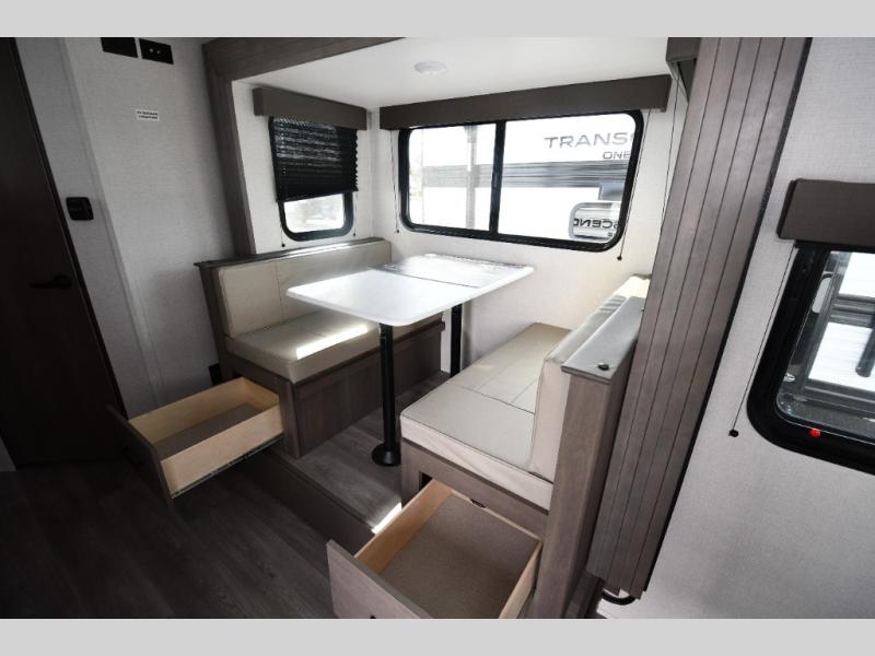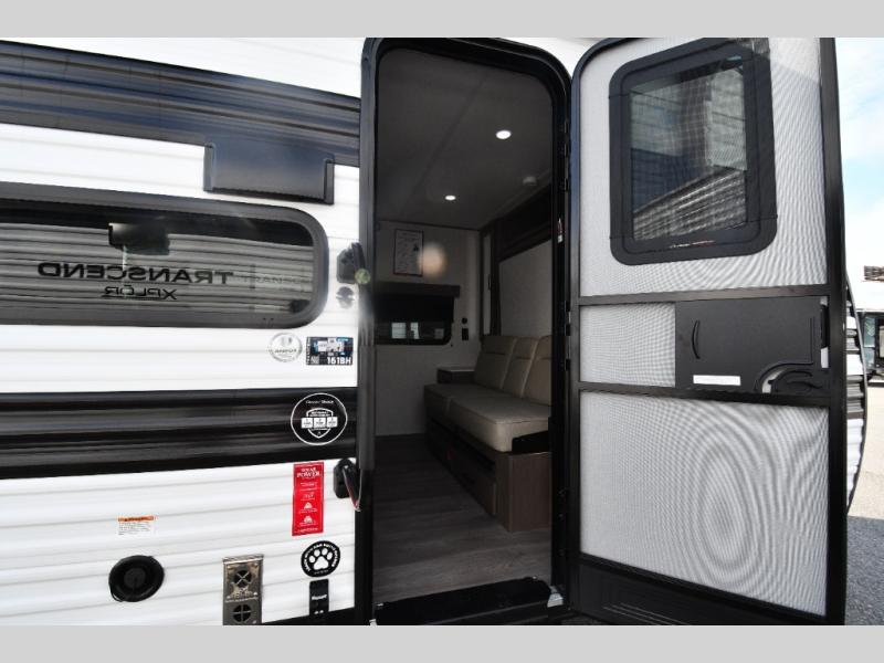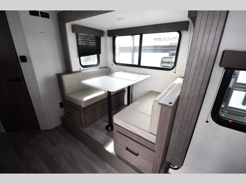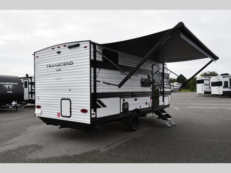 The 161BH Transcend One travel trailer offers versatile comfort in a lightweight, easy-to-tow package. A front Murphy bed with storage on both sides keeps your sleeping area tidy, while double-size bunks give kids or guests a cozy retreat. The full bath is conveniently located near the bunks for easy nighttime access. Cook indoors on the two-burner range or outside on the exterior griddle and refrigerator. Dine at the booth dinette slide, relax under the 16' power awning, and store larger gear in the unobstructed pass-thru storage—everything you need for memorable adventures is right at your fingertips.